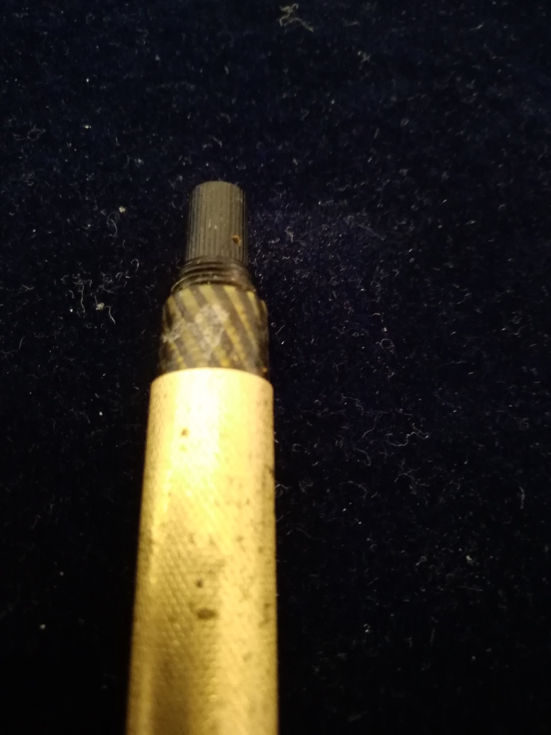 2) il pomello del fondello, in cima all'alberino, che va a girare in corrispondenza dell'ogiva di copertura, ha una vitina microscopica ( o forse un chiodino?) inserita a lato ma non si svita e battendo non esce , non ne capisco il senso, in quanto il fondello non deve essere avvitato all'ogiva di copertura ( tipo fondello omas 565 ), nella Royal il cappuccio del fondello si inserisce a pressione ed inoltre vi è la laminatura esterna senza fori che non permette operazioni di avvitamento.