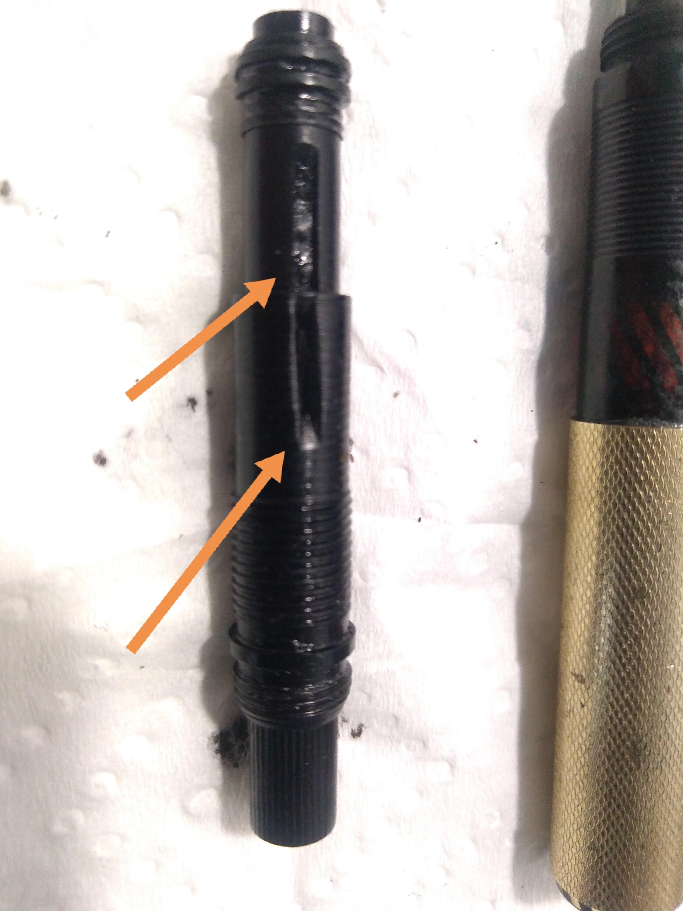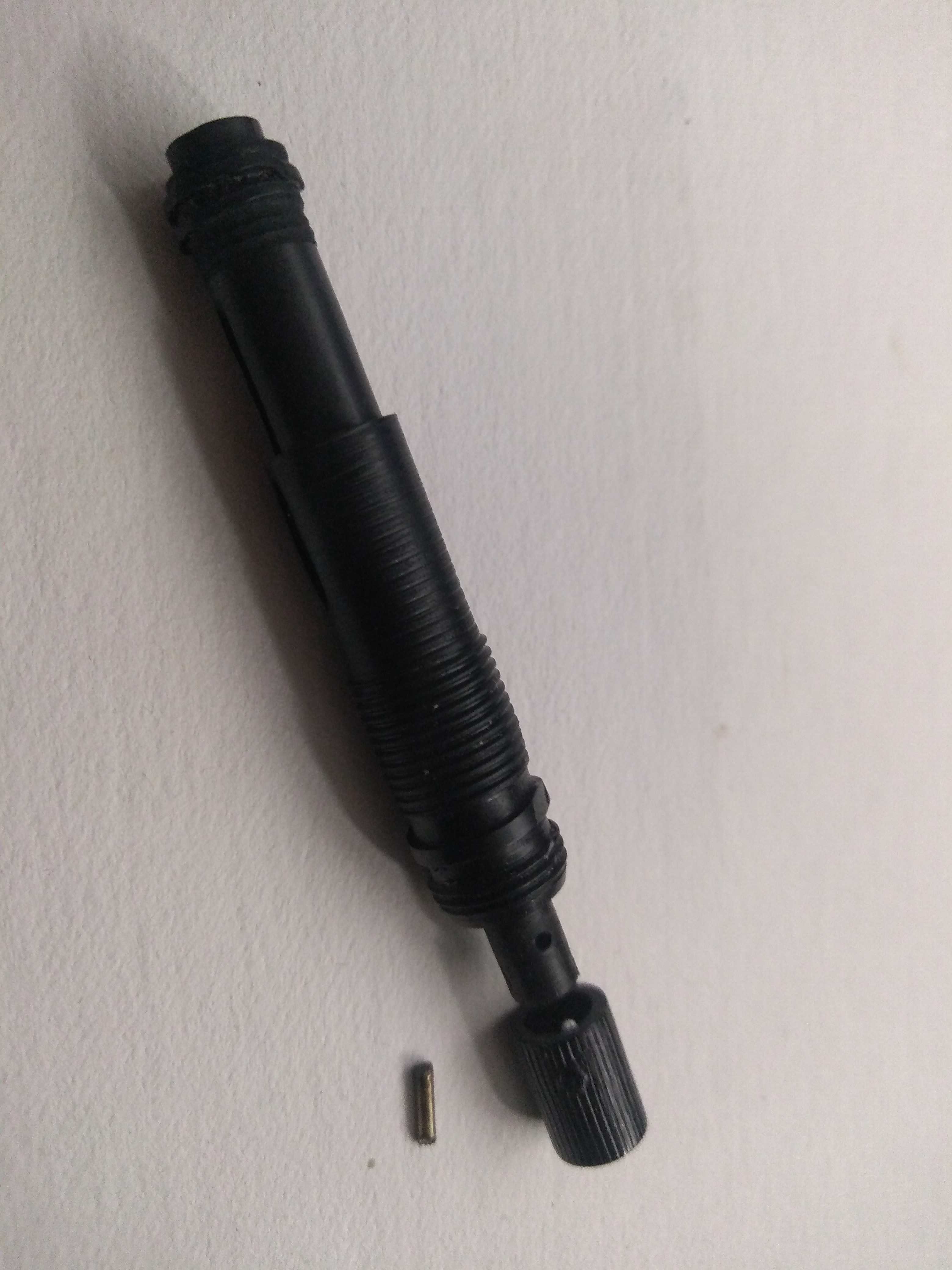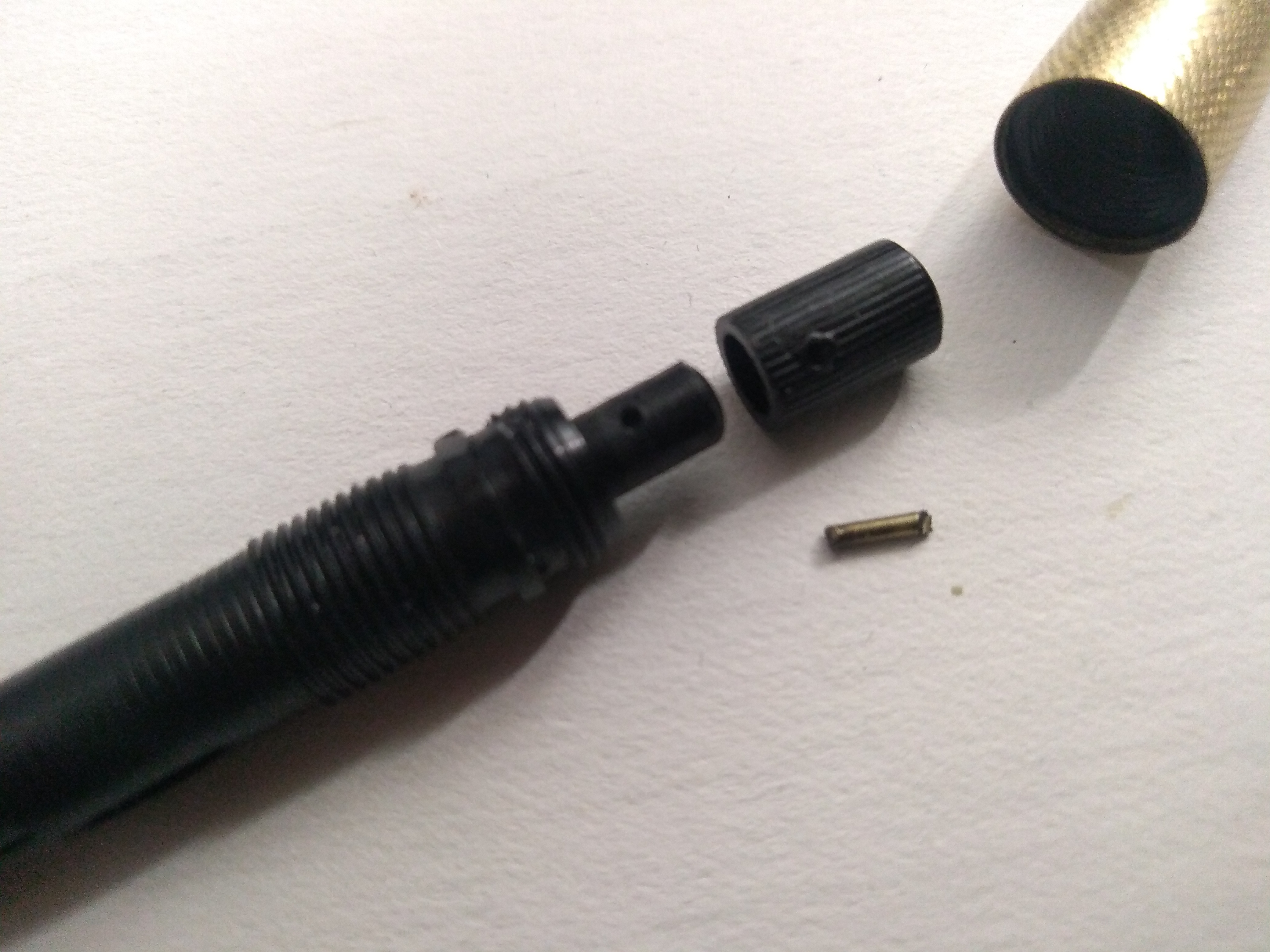 alternativa ipotizzata: l'alberino con diametro più piccolo potrebbe rientrare in quella di diametro maggiore per mezzo di una vite inversa interna all'alberino stesso? ( ma le due sezioni dell'albero sembrano bloccate, nel senso che spingendo manualmente la parte più sottile non rientra nella parte con diametro maggiore).