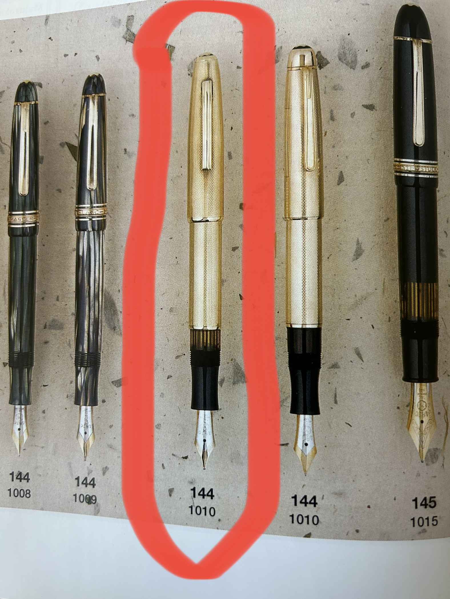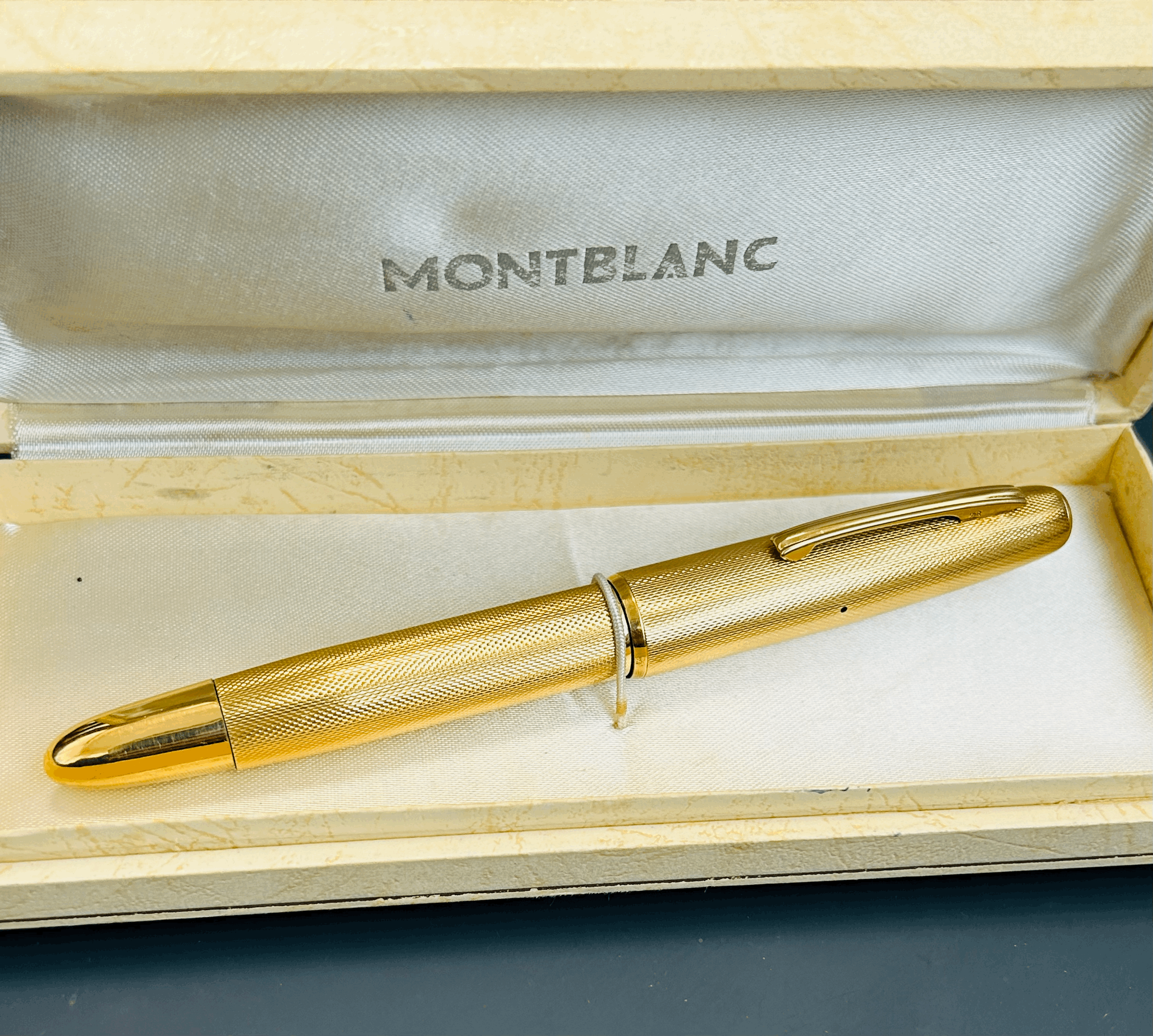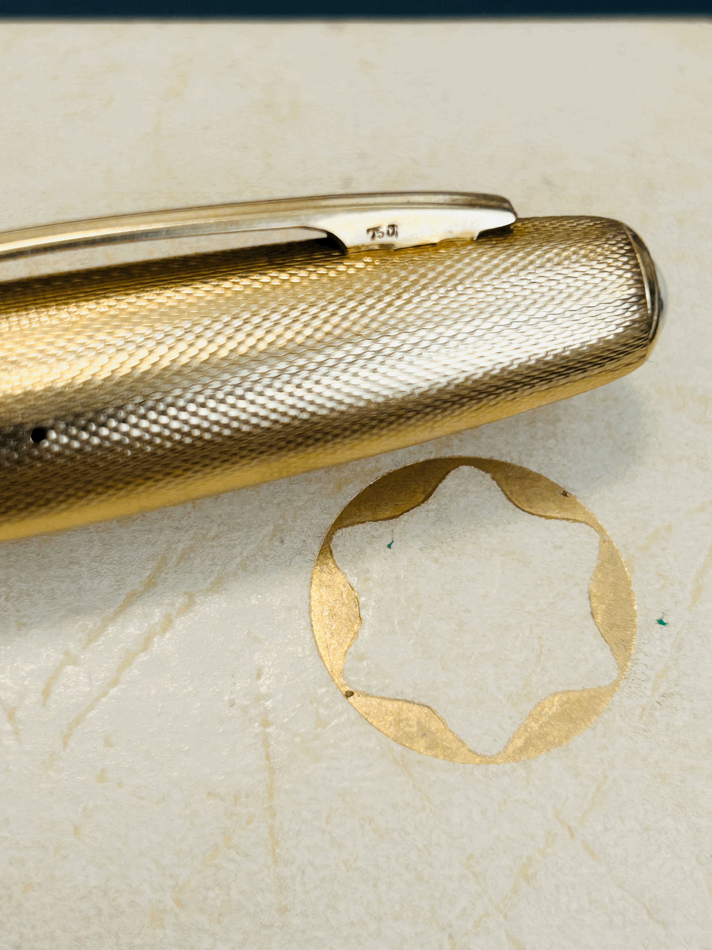 Particolare e raro modello di Montblanc 144 in celluloide, rivestito in oro 18 kt, anni 1950/1960.