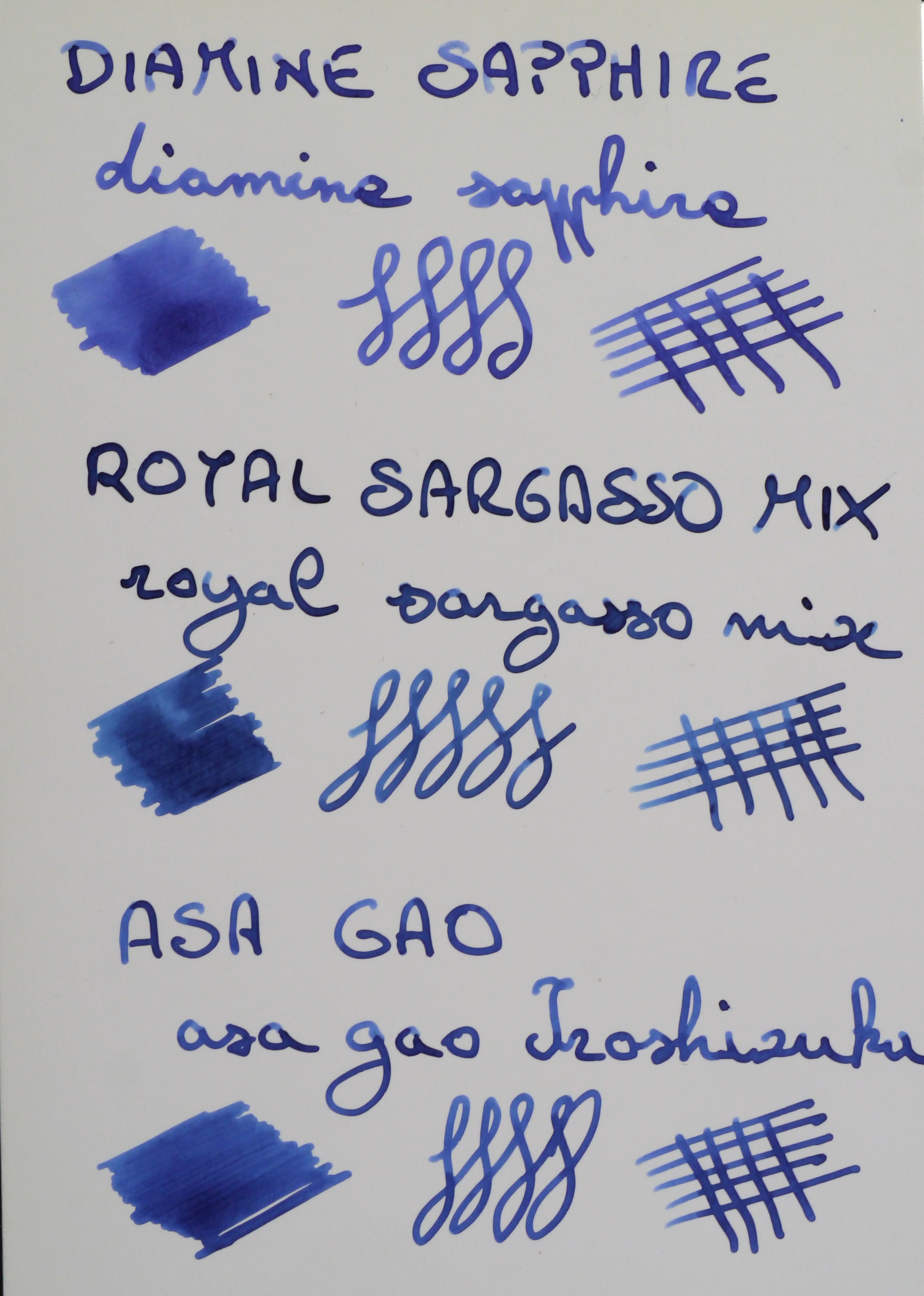 Il Sargasso scurisce il Royal blue, ma essendo la miscela per lo più Pelikan 4001, le caratteristiche restano quasi del tutto quelle, inchiostro abbastanza secco (dipende ovviamente se li hai in casa, ma so che di inchiostri ne hai parecchi...).