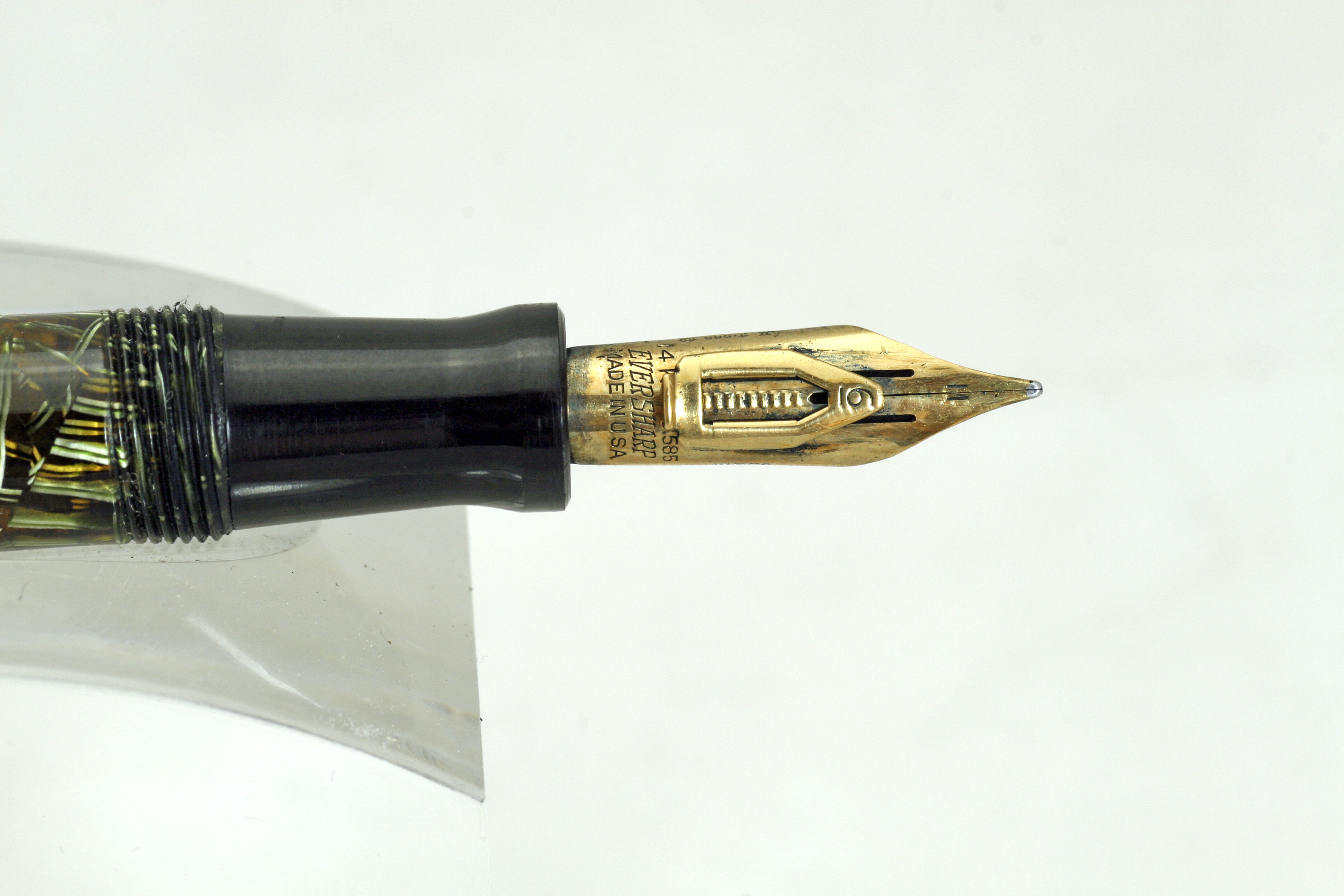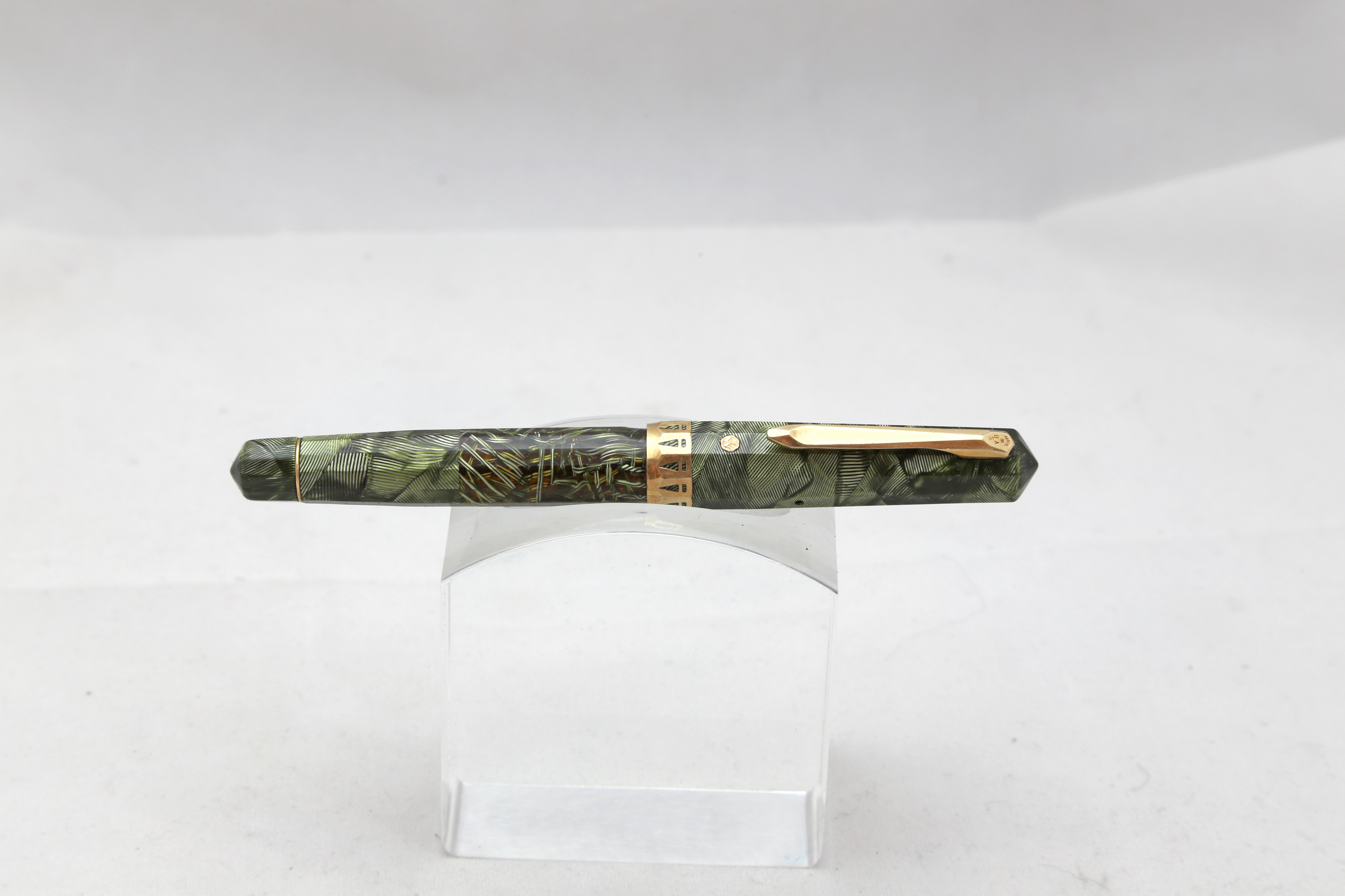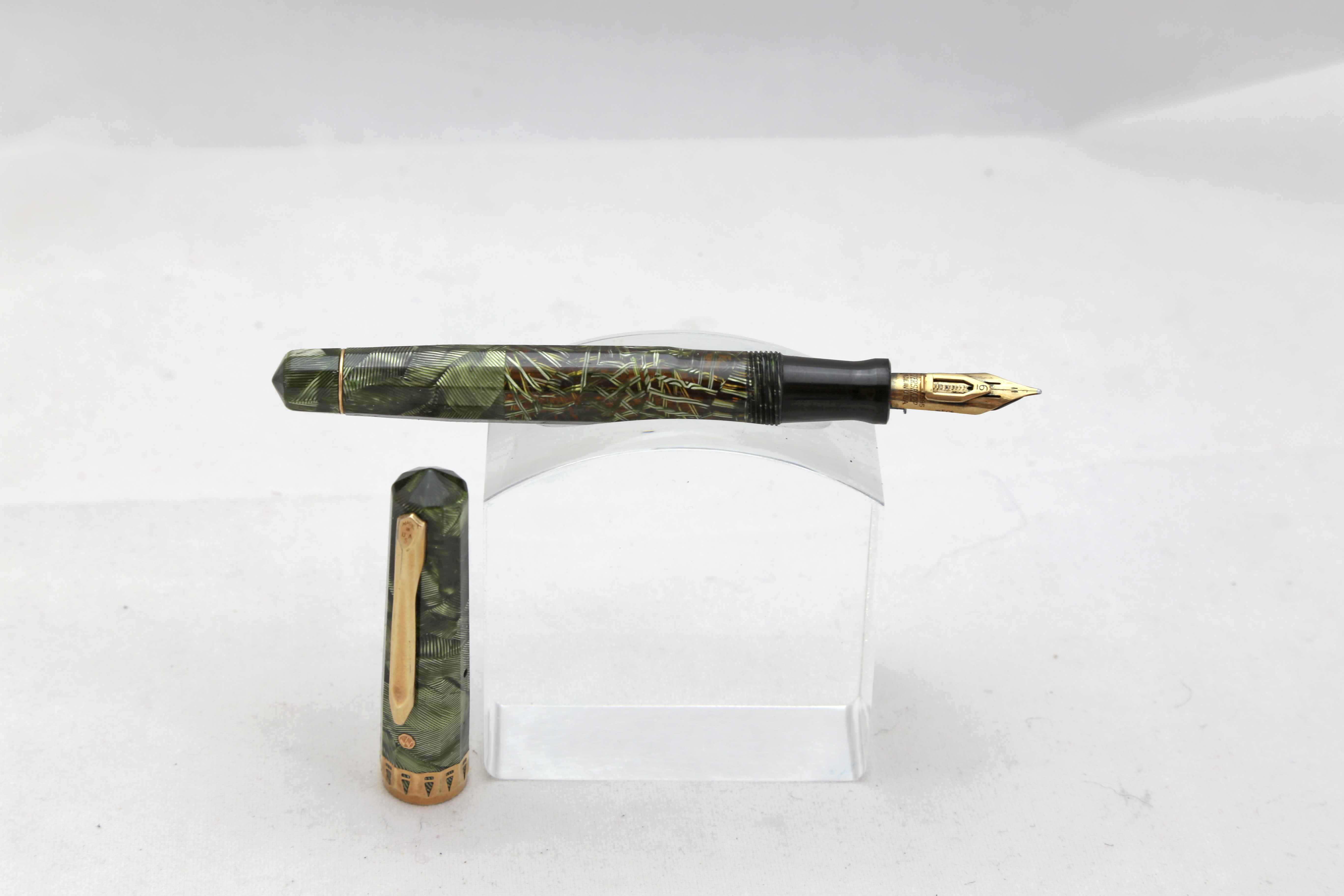 La versione più piccola del modello Doric seconda serie caratterizzata dalla clip che ha perso la rotellina e dal caricamento a siringa rovesciata, livrea Emerald Green, produzione 1935,, dotata del suo classico e famoso pennino a flessibilità regolabile.