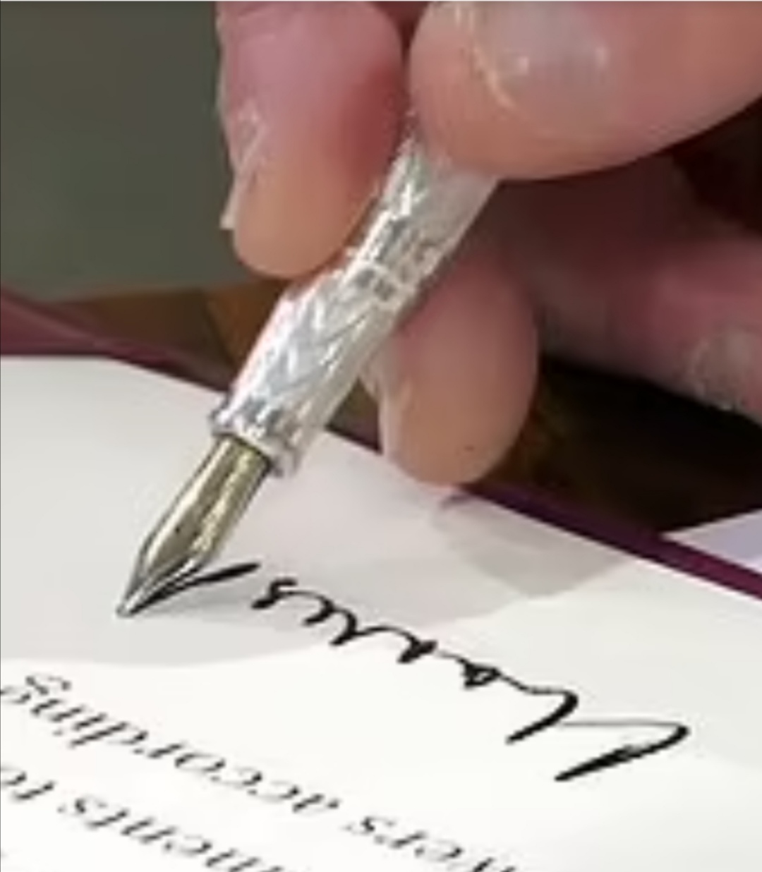 Credo che avesse fatto delle prove con quella penna. Qui a 0:46 si vede chiaramente che appoggia la penna, schiaccia bene benino per essere sicuro che arrivi inchiostro e poi parte con la firma.