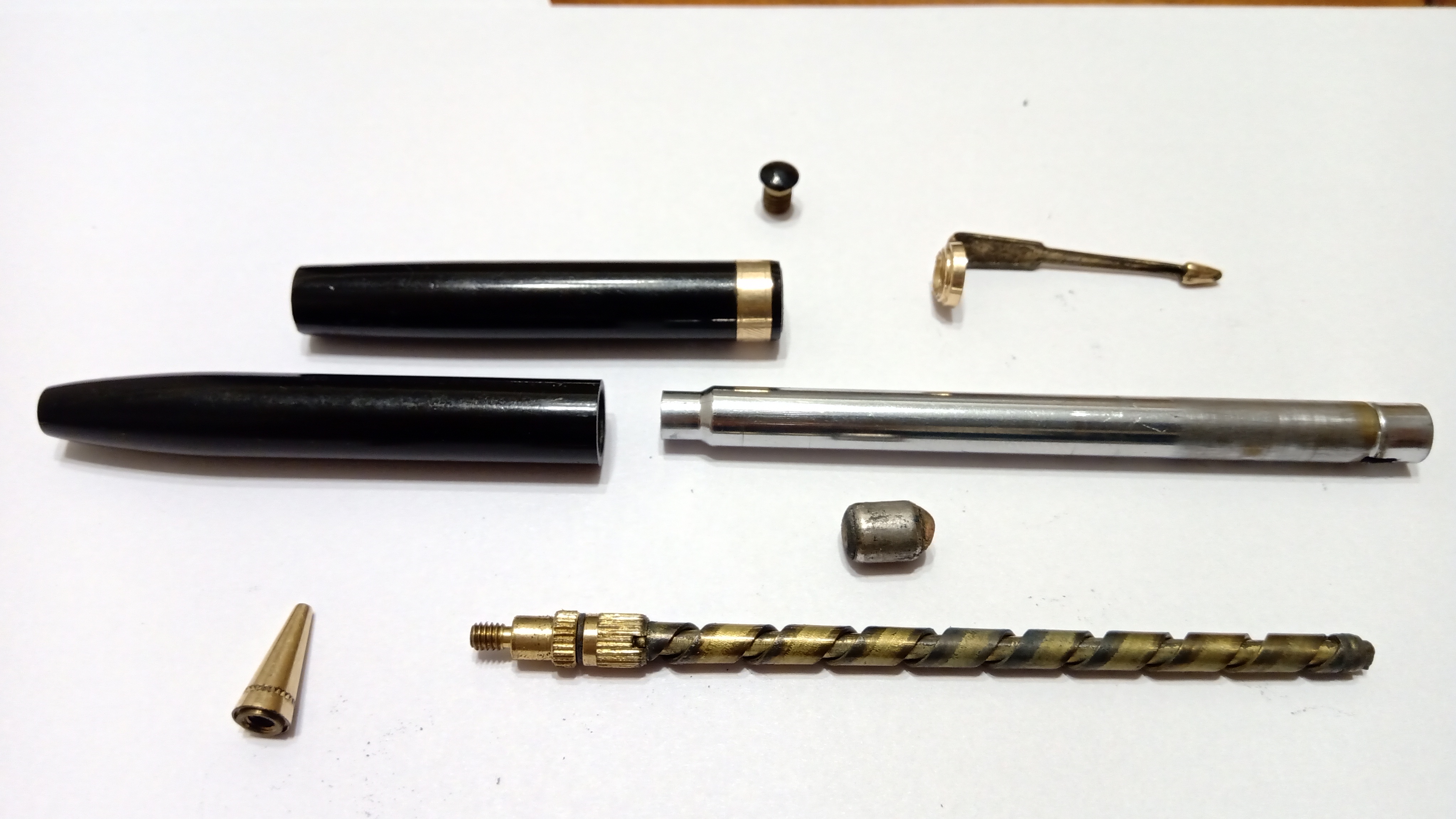 e così, dopo aver pulito le estremità del cappuccio e del fusto, e l'ultimo processo di riempimento, levigatura e lucidatura, ho proceduto all'assemblaggio finale della matita automatica...