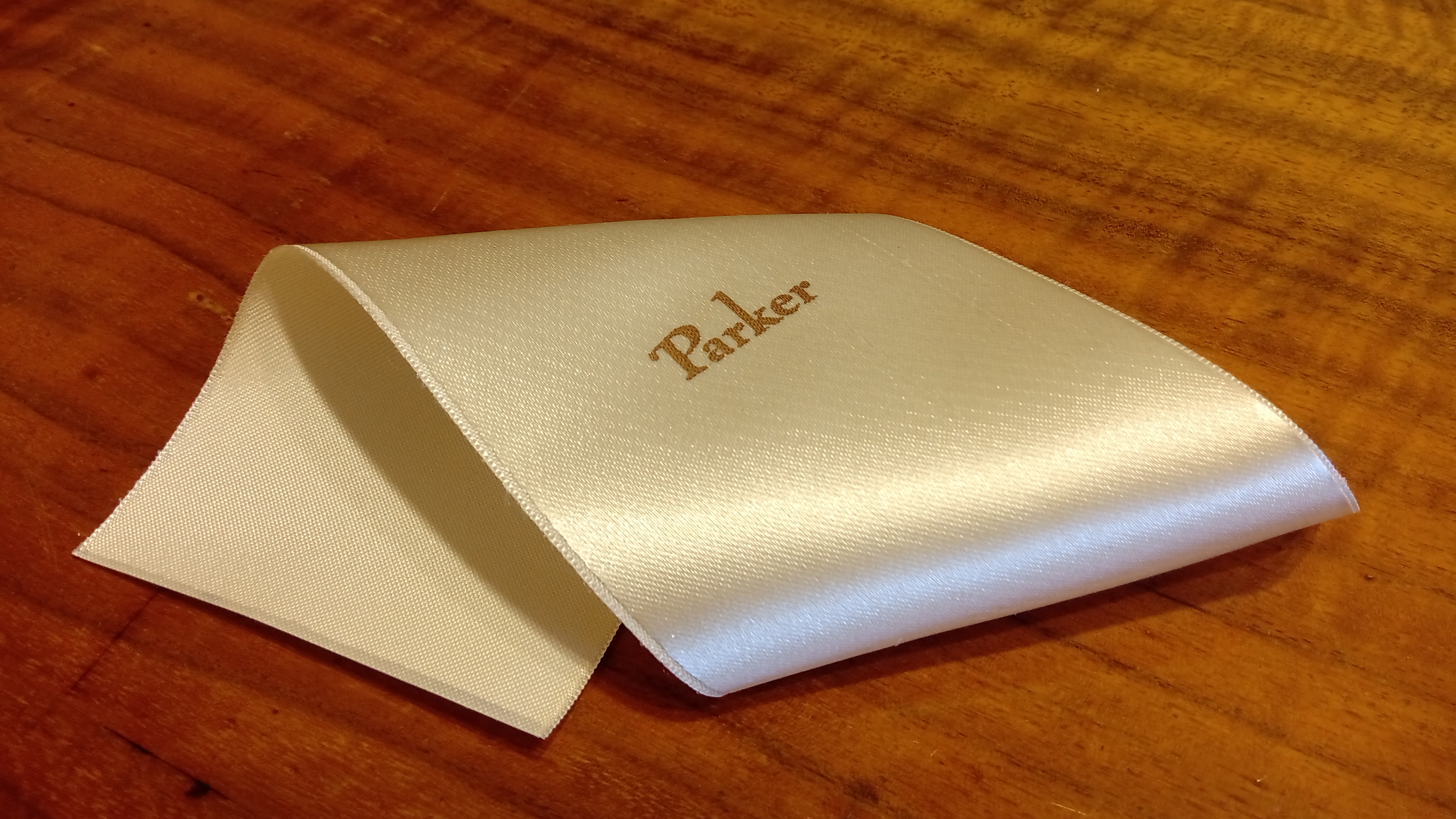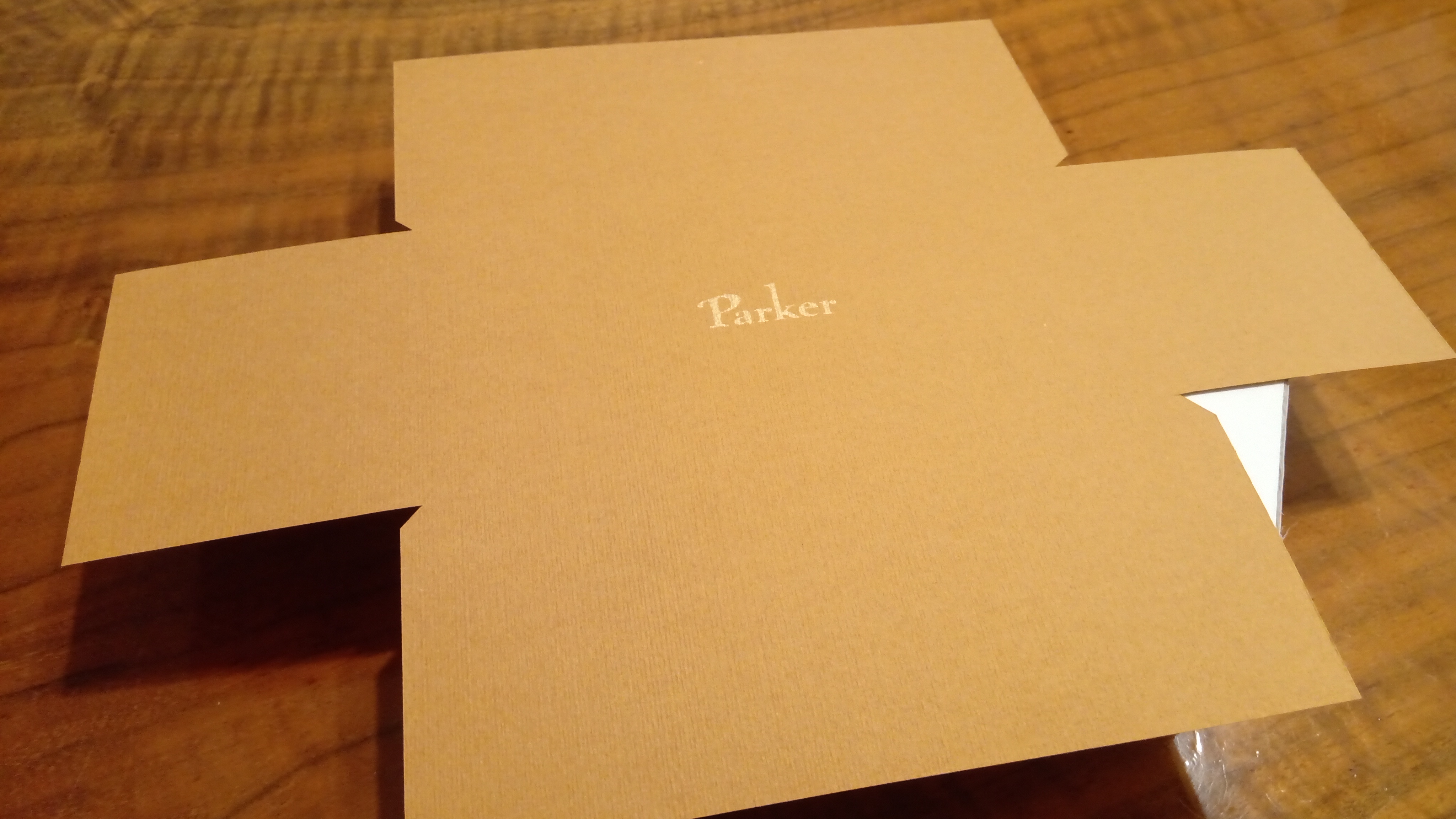 Per concludere, andremo ad assemblare la scatola di cartone che conterrà il set di penna stilografica, matita automatica e astuccio, che realizzeremo in cartoncino foderato di carta goffrata, su cui stamperemo il logo Parker, e che riceverà un trasparente lacca protettiva che a sua volta valorizzerà il logo stampato...