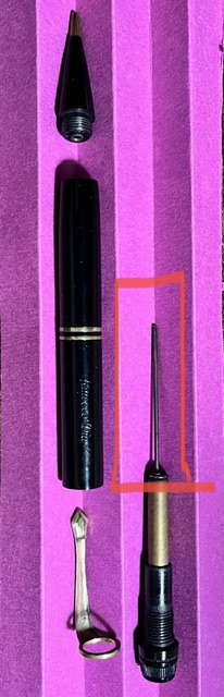 l'asta nel riquadro rosso, girando la manopola sulla sommità della matita sale e scende ed esce dal puntale. non mi pare una mina perché non scrive.