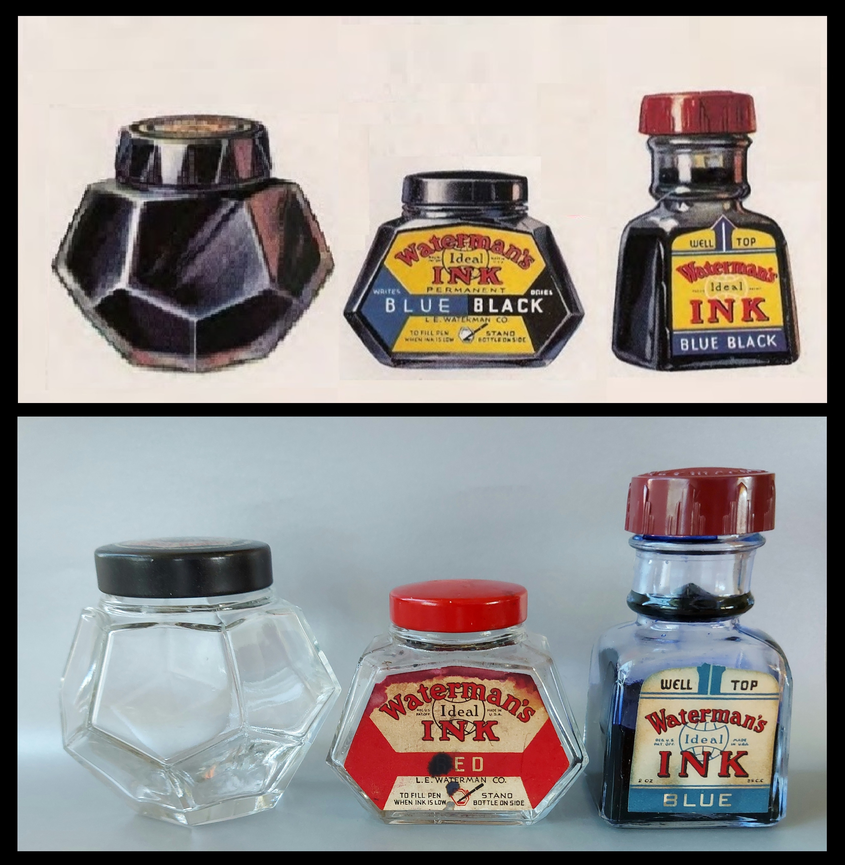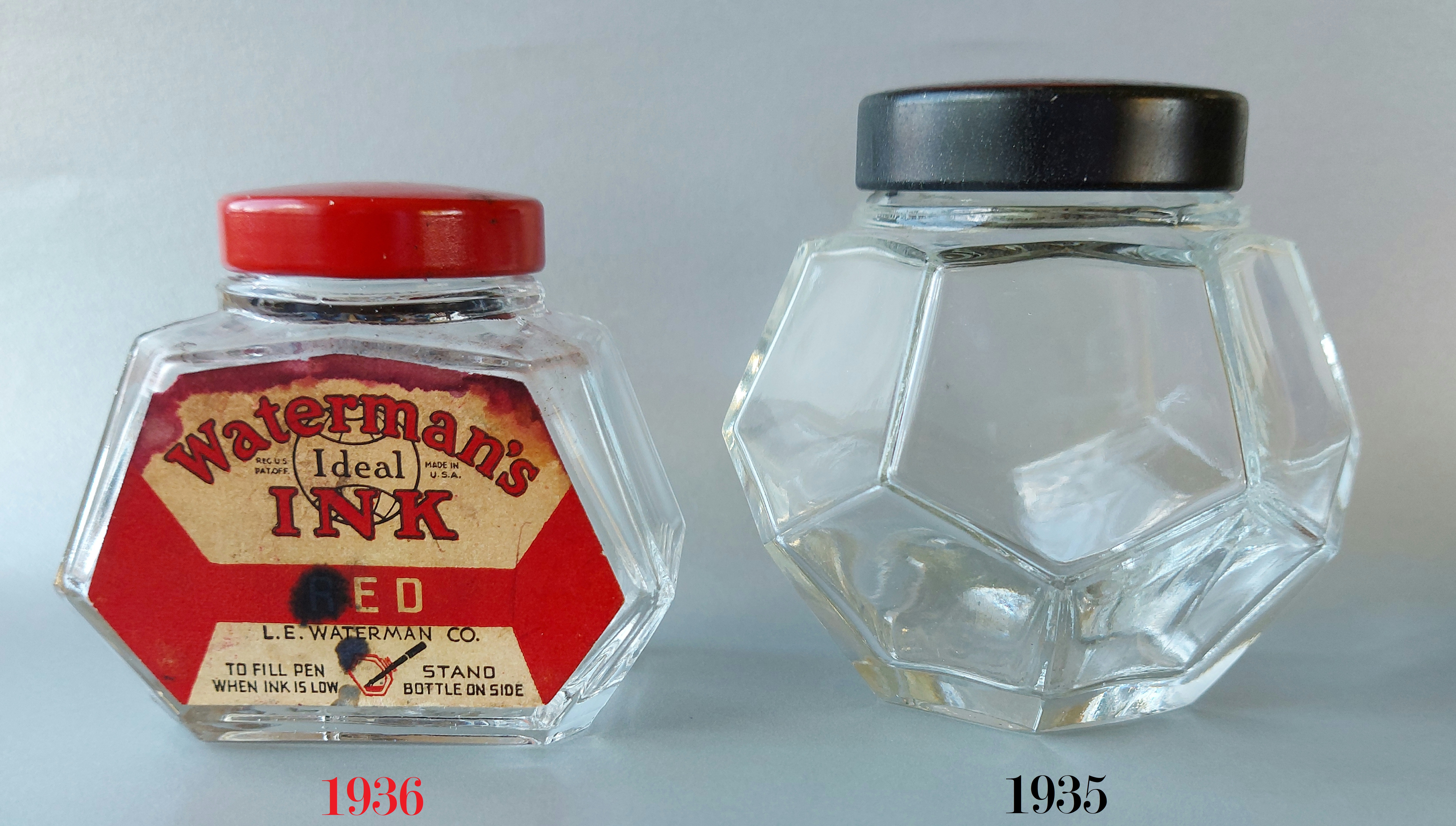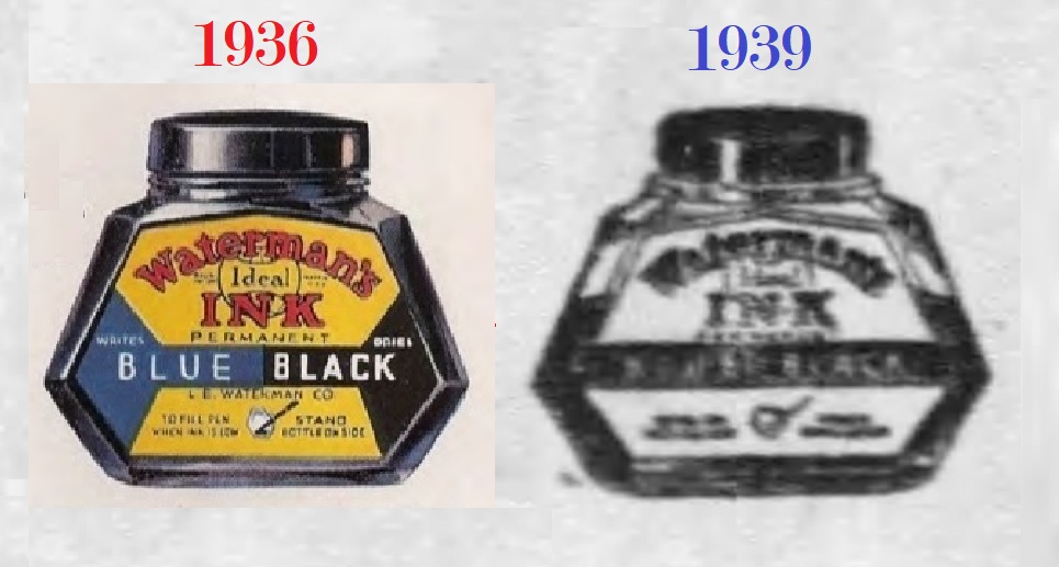 La situazione cambiò dal 1933, sicuramente anche in vista del cinquantesimo anniversario di attività della Casa (1884-1934), e nel 1936, per promuovere più efficacemente la vendita dei quattro nuovi flaconi di inchiostro mostrati in apertura (stilisticamente tutti così pienamente quanto irresistibilmente Art Déco), il marketing della Waterman decise di presentarli come dotati di “special features” (caratteristiche speciali), non solo evidentemente per il design, ma anche per il tipo di impiego per essi suggerito.