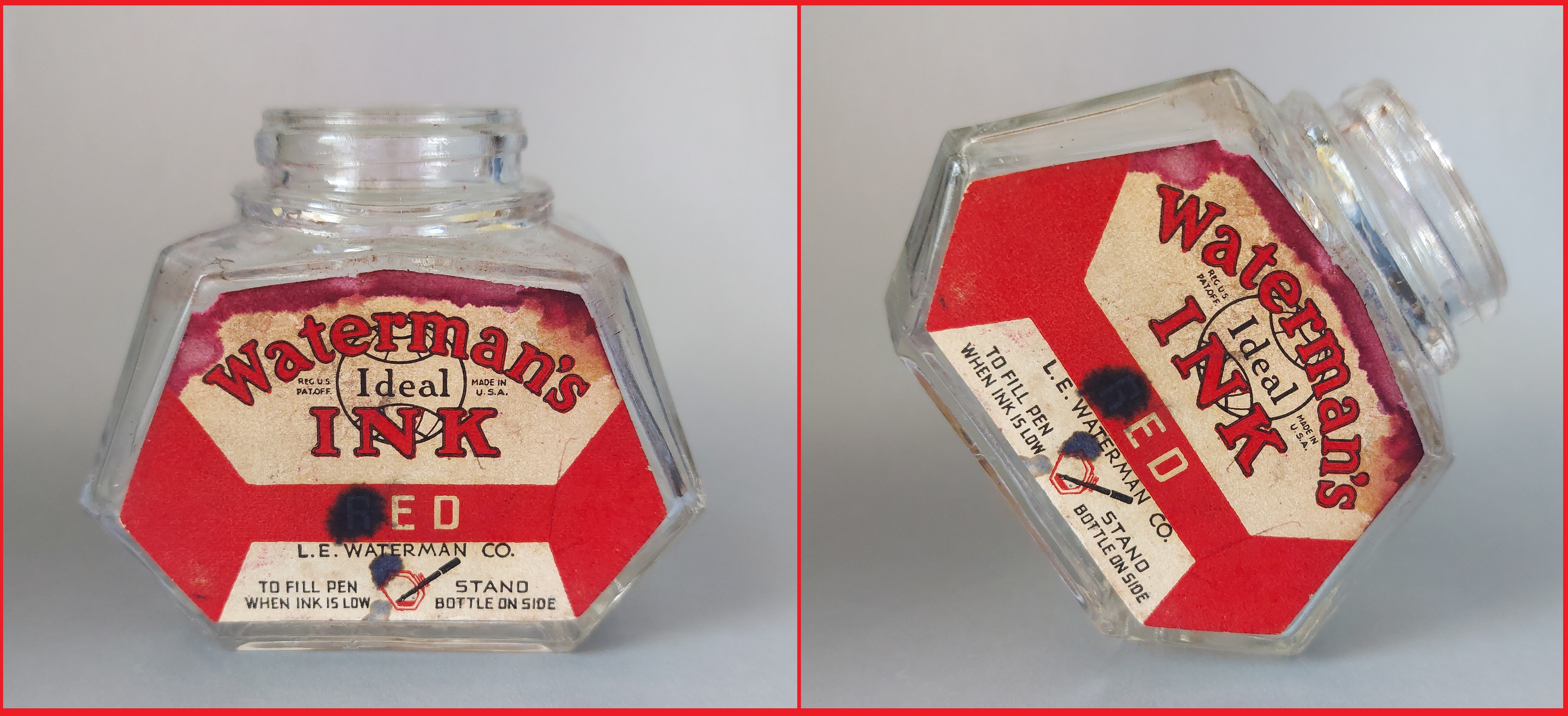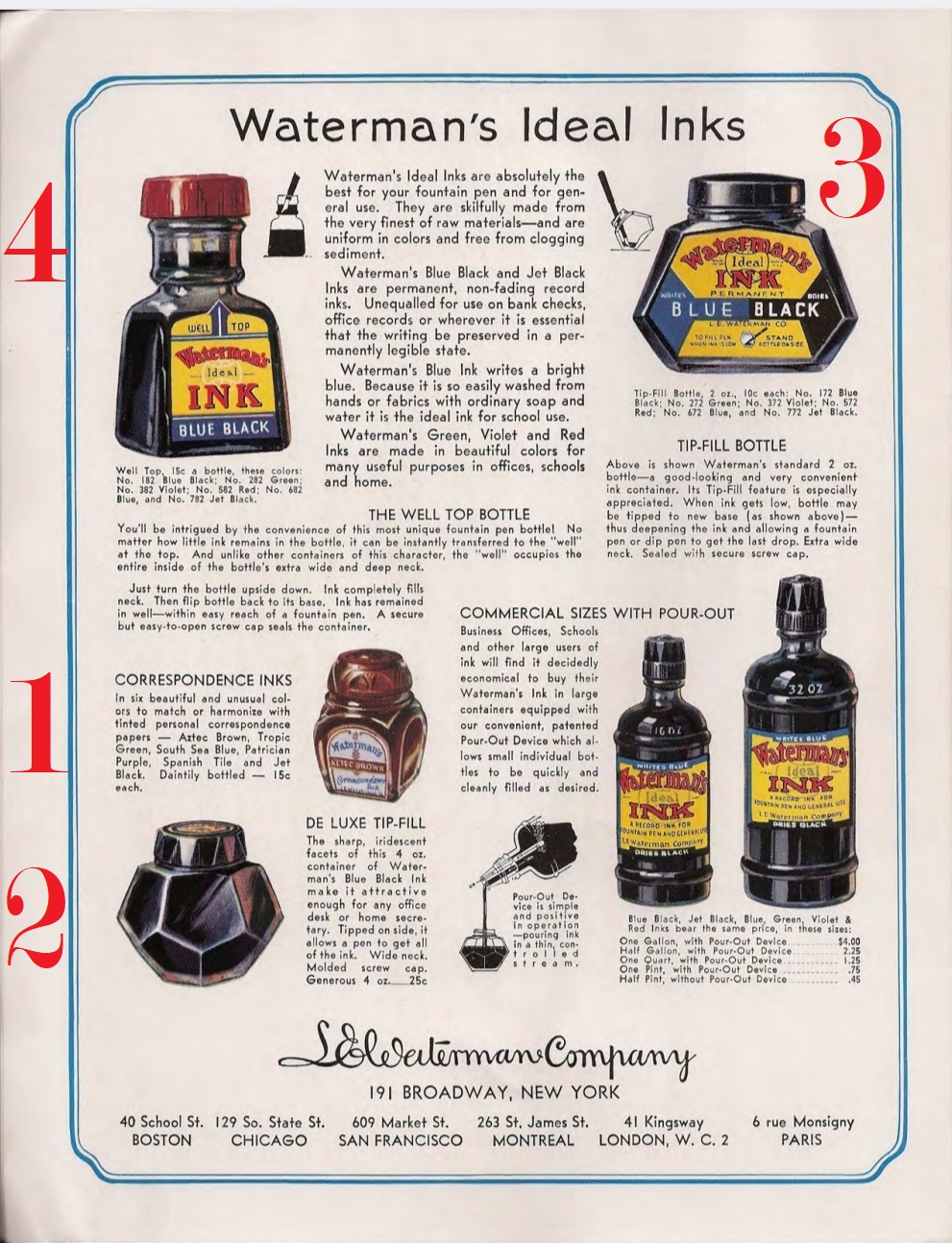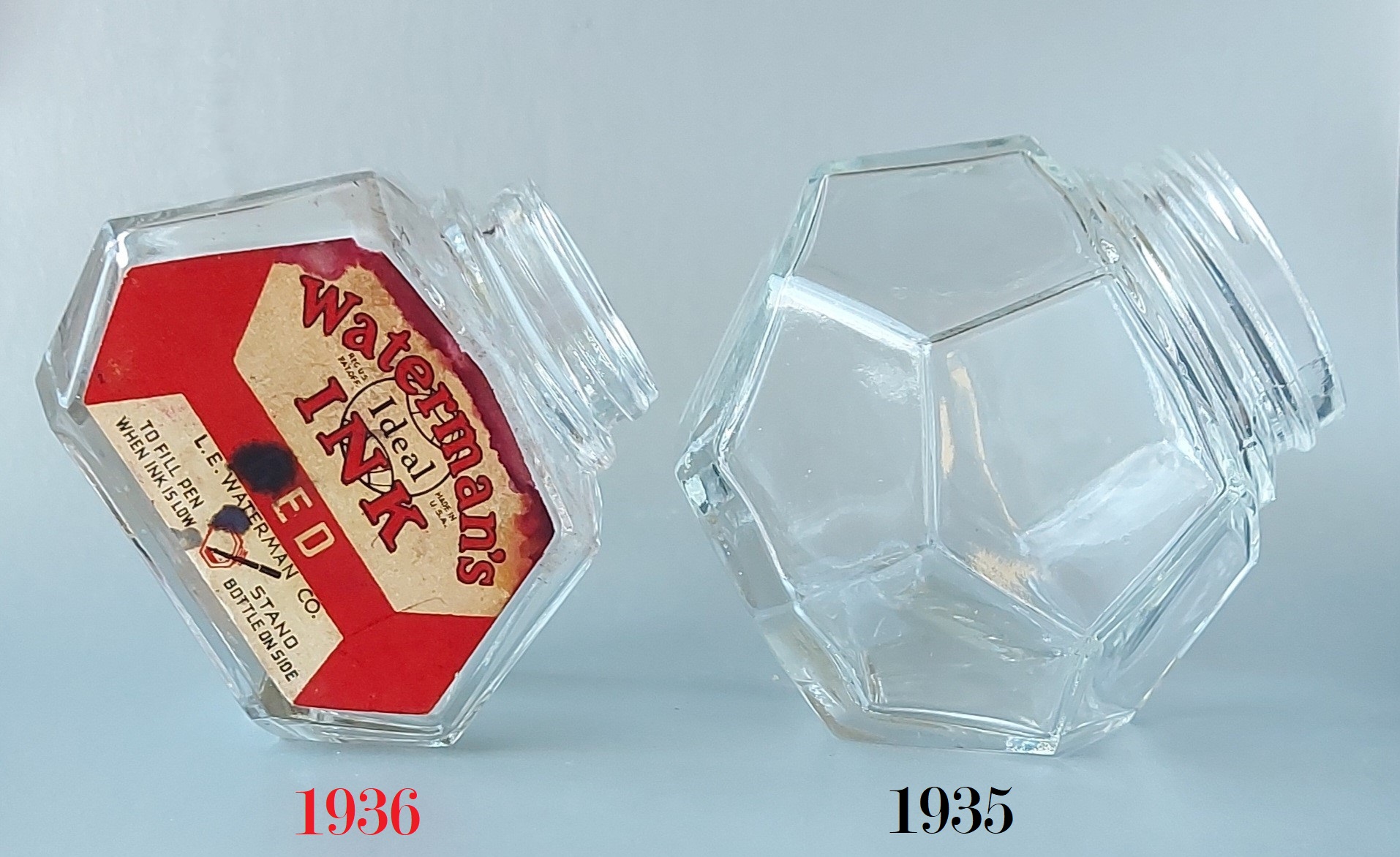 La situazione cambiò dal 1933, sicuramente anche in vista del cinquantesimo anniversario di attività della Casa (1884-1934), e nel 1936, per promuovere più efficacemente la vendita dei quattro nuovi flaconi di inchiostro mostrati in apertura (stilisticamente tutti così pienamente quanto irresistibilmente Art Déco), il marketing della Waterman decise di presentarli come dotati di “special features” (caratteristiche speciali), non solo evidentemente per il design, ma anche per il tipo di impiego per essi suggerito.