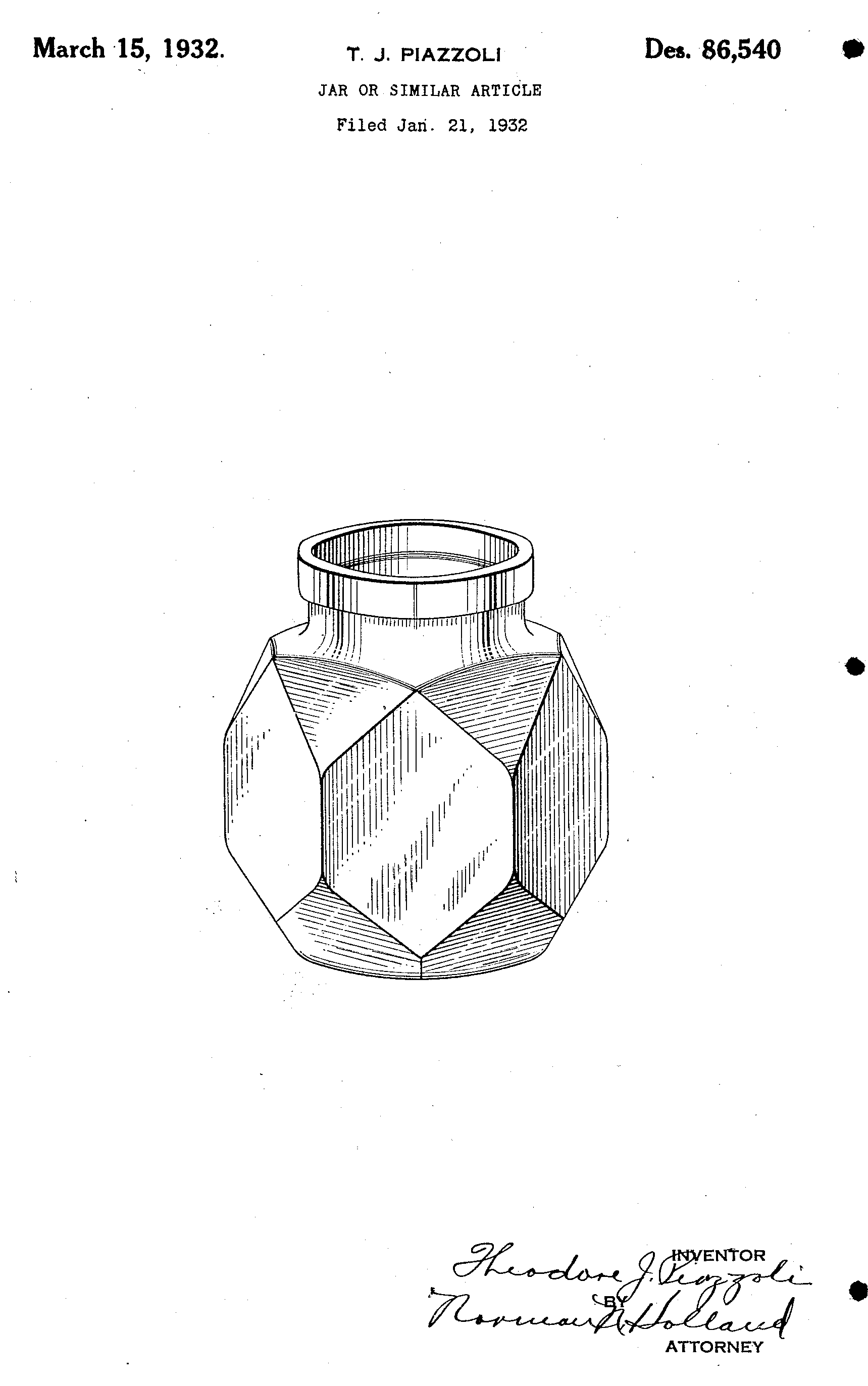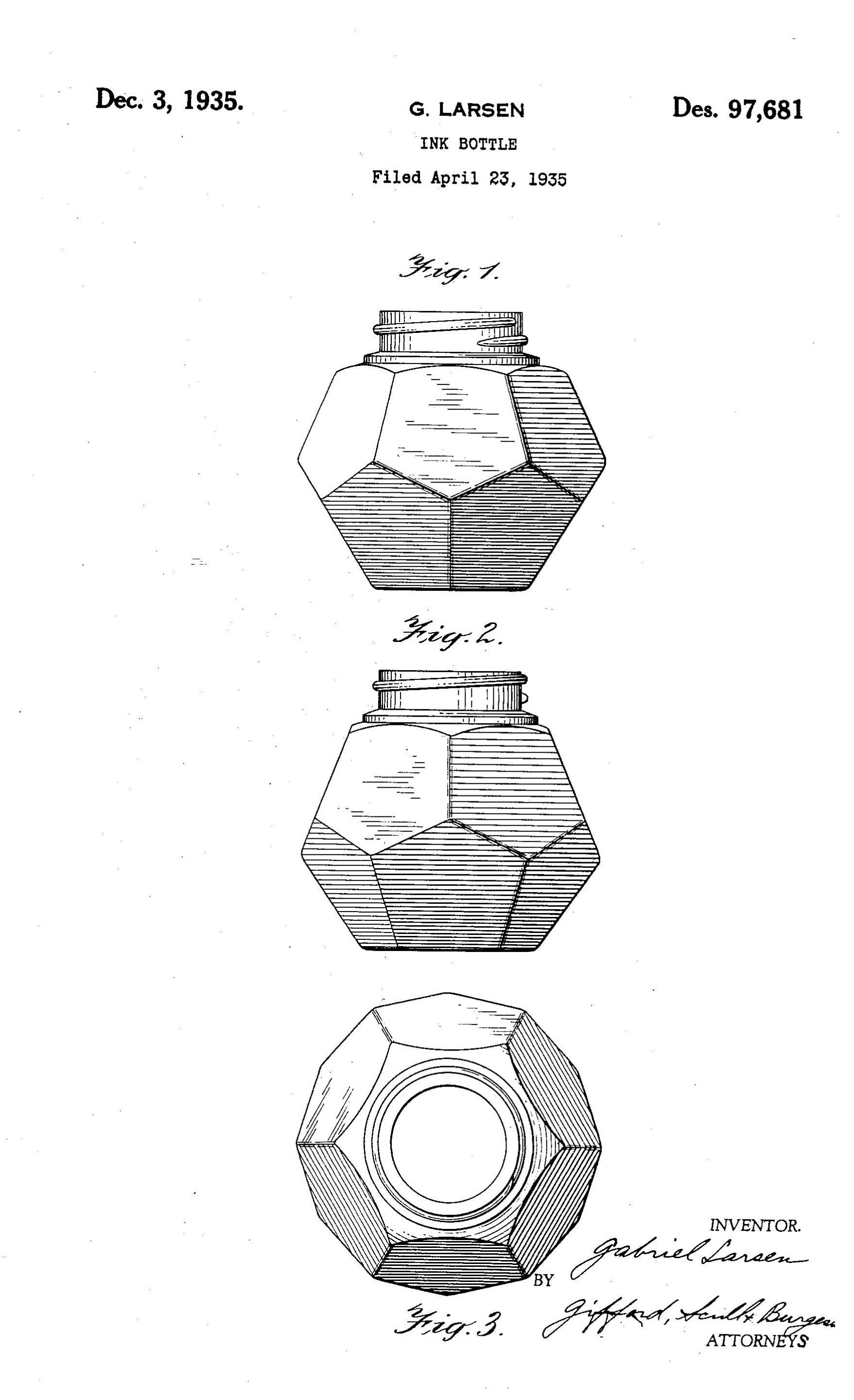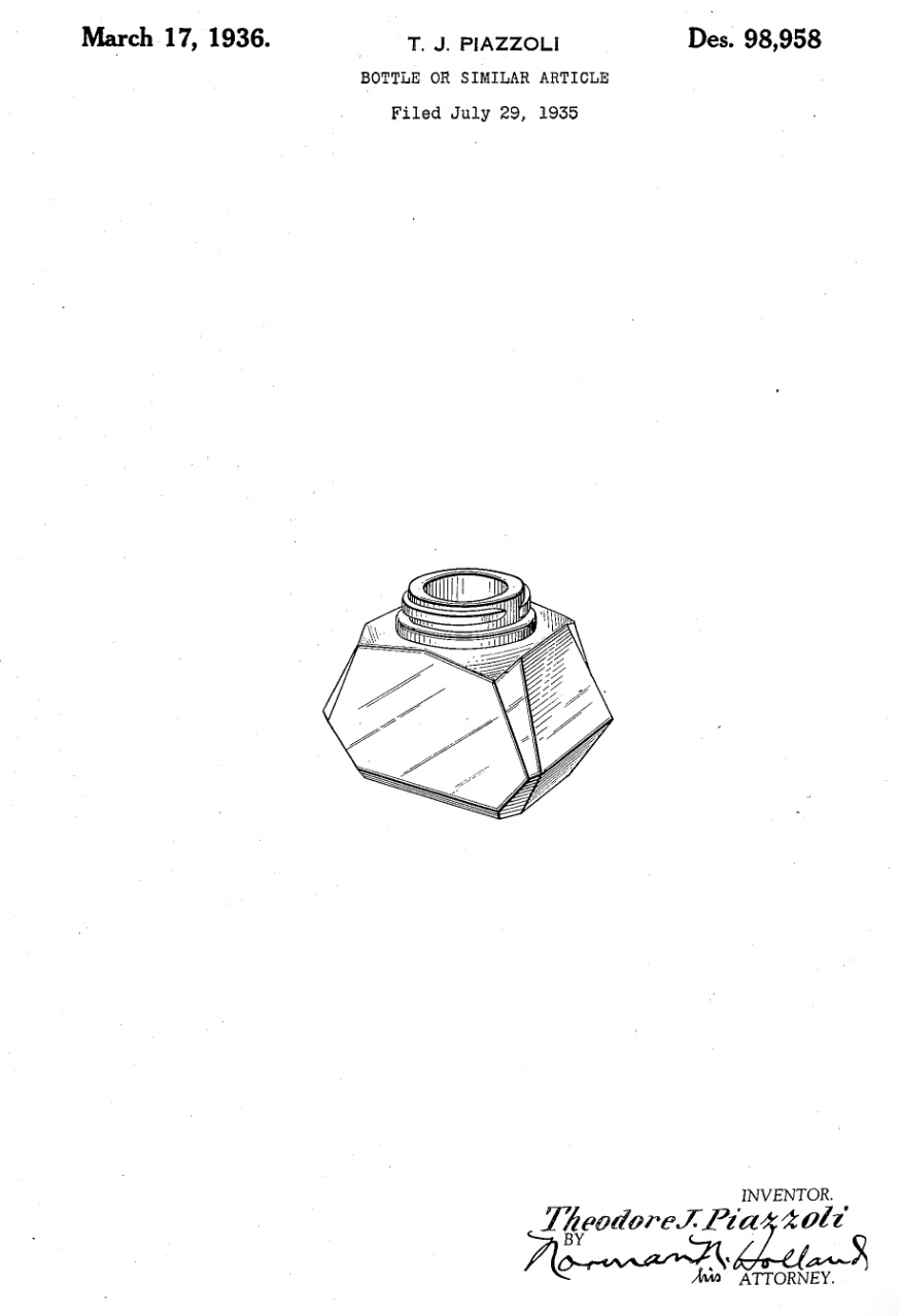 Ma solo 3 mesi dopo (29 luglio 1935), un brillante disegnatore della vetreria Capstan Glass Company (Pennsylvania) depositò il brevetto di un calamaio faccettato e coricabile, più piccolo di quello di Larsen, che sarebbe diventato il secondo calamaio “Tip-Fill” di Waterman sul mercato. Il talentuoso disegnatore era Theodore J. Piazzoli (di evidenti ascendenze italiane), che si era messo in luce alla vetreria producendo in poco più di cinque anni di lavoro ben 17 brevetti tra i quali, ancora nel 1932, quello del seguente calamaio geometrico (N.B. già caratterizzato principalmente da esagoni). Orbene, se Waterman avesse commissionato alla vetreria Capstan il progetto di un calamaio (che verosimilmente fosse anche coricabile, ma più piccolo di quello appena sviluppato) ovvero se si fosse limitata, intuendone le potenzialità, ad acquistare i diritti di sfruttamento di un design autonomamente elaborato da Piazzoli per la sua Compagnia, non mi è stato possibile accertarlo.