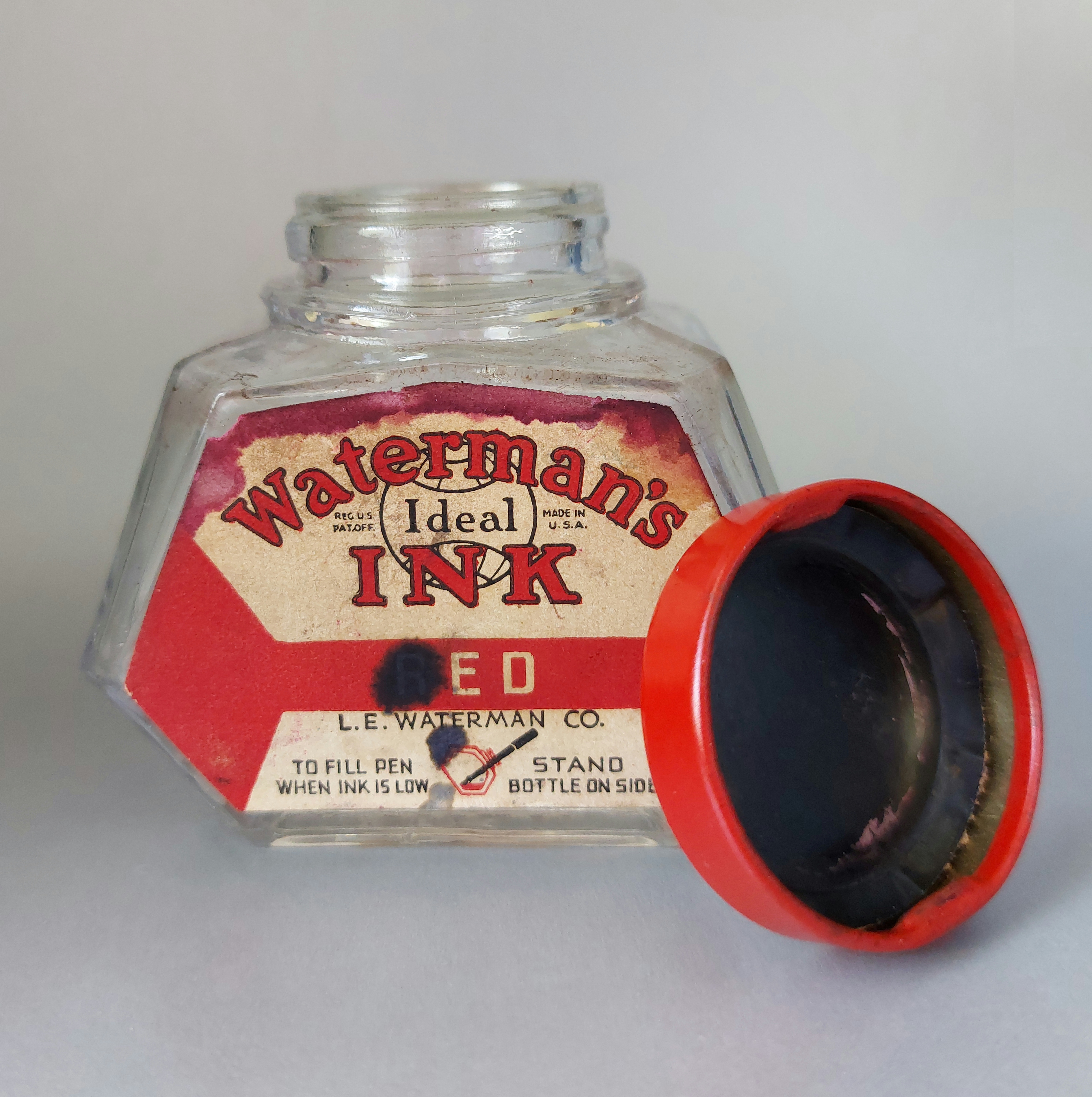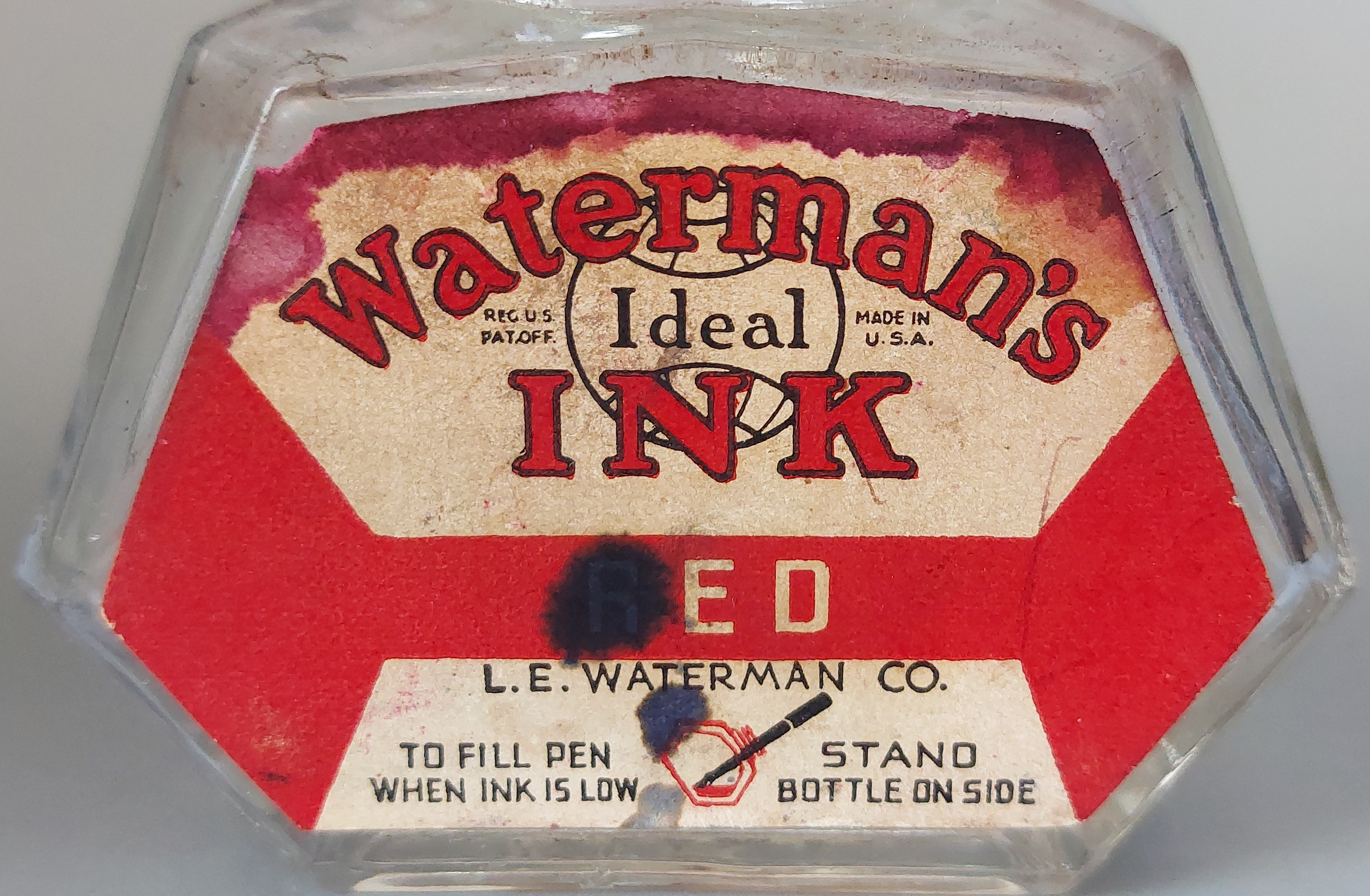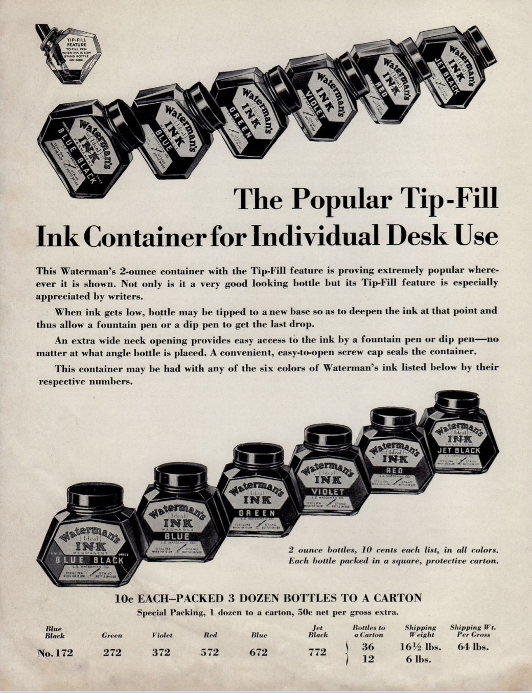 WATERMAN’S Inks: “TIP-FILL” BOTTLE (T.J. Piazzoli) — New York, 1936