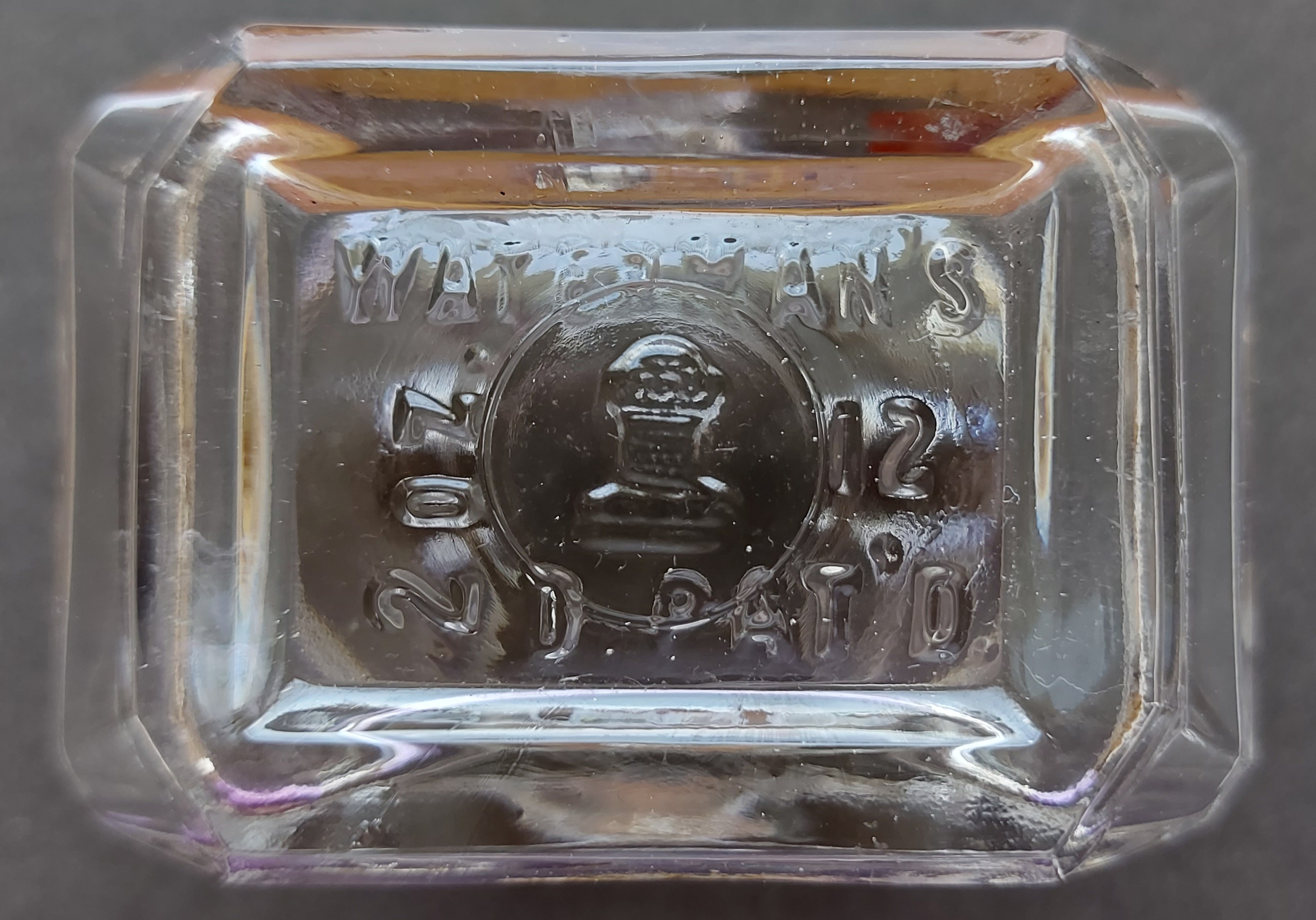 Da una prospettiva laterale si può, inoltre, facilmente rilevare come la superficie superiore (quella che ospita l’imboccatura circolare) non sia piana, ma leggermente inclinata a salire verso il centro: in questo modo, ciascuno dei dieci segmenti (l’ottagono d’impianto a cui si devono aggiungere i due lati degli ettagoni che sembrano esagoni) di cui è costituito il perimetro/bordo risalgono verso il cerchio centrale ciascuno con la propria faccetta… Questo tripudio di faccette (in totale ben 18!) di dimensioni relativamente piccole conferisce alla bottiglia la caratteristica di essere percepita in modo sempre dinamico da chi la maneggi, riflettendo più efficacemente molta della luce disponibile, e accomuna il manufatto alla preziosità delle gemme che attraverso un taglio ricercato sfoggiano questa medesima caratteristica. Le visioni perfettamente centrate dall’alto e da sotto, invece, disegnano molto più intuitivamente un ottagono (irregolare) con quattro lati lunghi e quattro cortissimi. Il fondo della bottiglia, rientrante di ca. 1 mm (e perciò protetto dagli urti), è un rettangolo che contiene le iscrizioni del Produttore a rilievo.