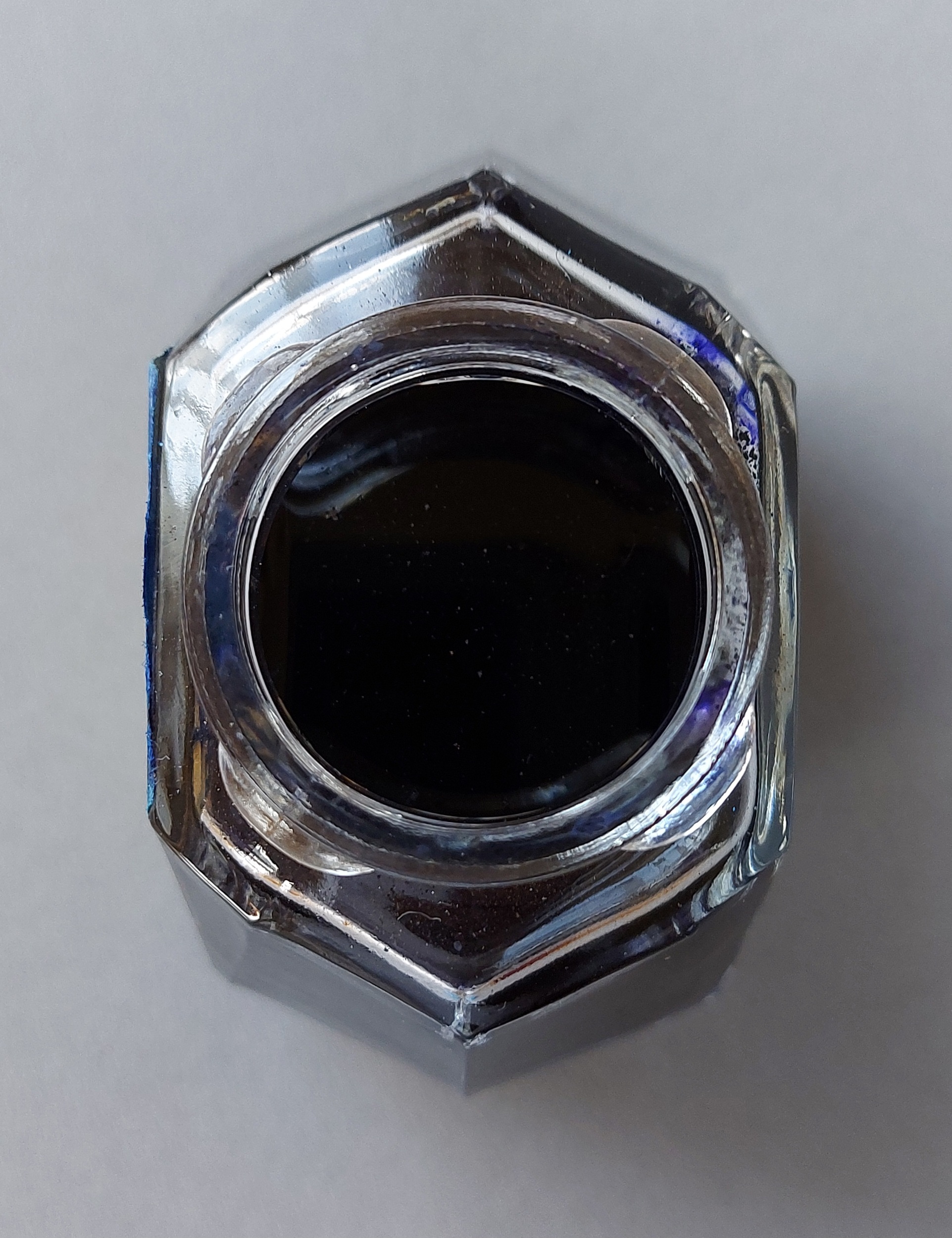I francesi (per grandeur, ovviamente) vollero così costruire il loro più grande e con molte più figure geometriche da poter riconoscere: e infatti si contano, oltre al cerchio dell’imboccatura, poligoni con 3 lati, con 4, con 5, con 6 (di due tipi) e con 8... Se c’è una critica che si può muovere al calamaio JiF di primissima generazione, certamente funzionale e di grande “presenza scenica”, è forse proprio quella di voler stupire ad ogni costo: la complicazione del disegno con la presenza contemporanea di una miriade di figure geometriche appare un virtuosismo che nuoce alla pulizia e all’eleganza del progetto.