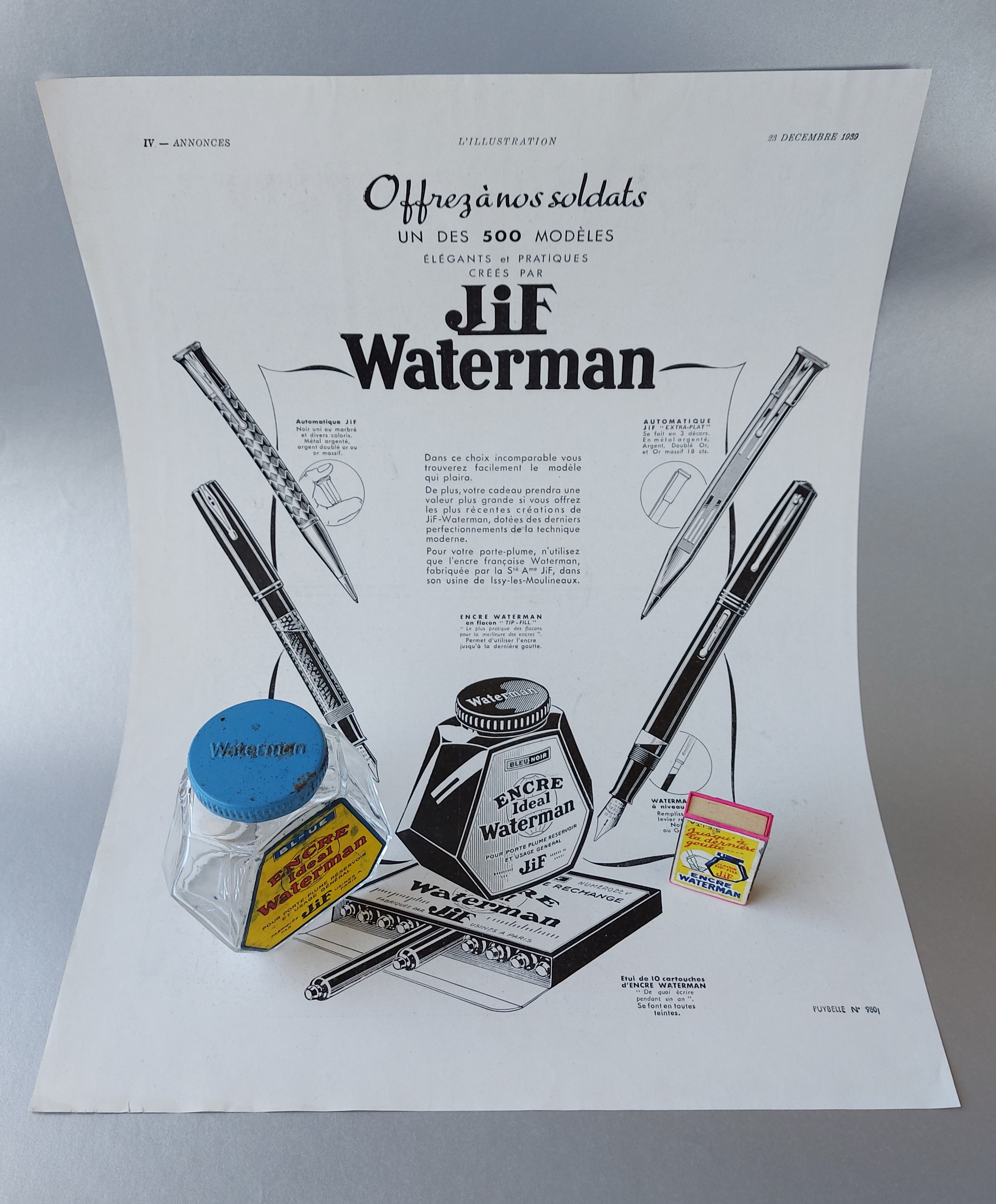 La situazione cambiò dal 1933, sicuramente anche in vista del cinquantesimo anniversario di attività della Casa (1884-1934), e nel 1936, per promuovere più efficacemente la vendita dei quattro nuovi flaconi di inchiostro mostrati in apertura (stilisticamente tutti così pienamente quanto irresistibilmente Art Déco), il marketing della Waterman decise di presentarli come dotati di “special features” (caratteristiche speciali), non solo evidentemente per il design, ma anche per il tipo di impiego per essi suggerito.