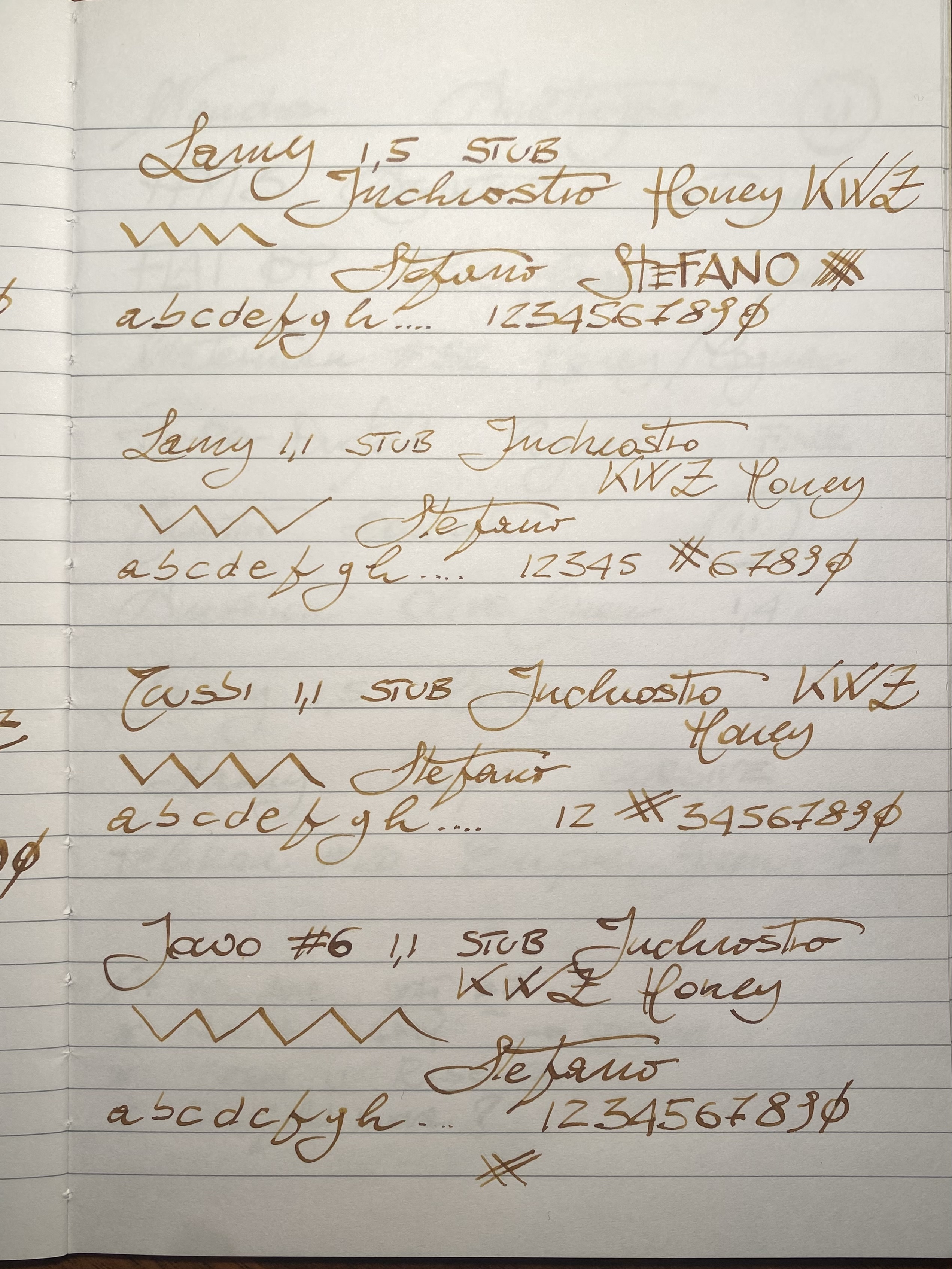 I lamy: 1,1 è il più sottile di tutti, il più rigido (ma veramente rigido, ne ho 2 e sono identici), quasi sembra un pennino fine; faccio fatica ad usarlo, infatti non lo uso.