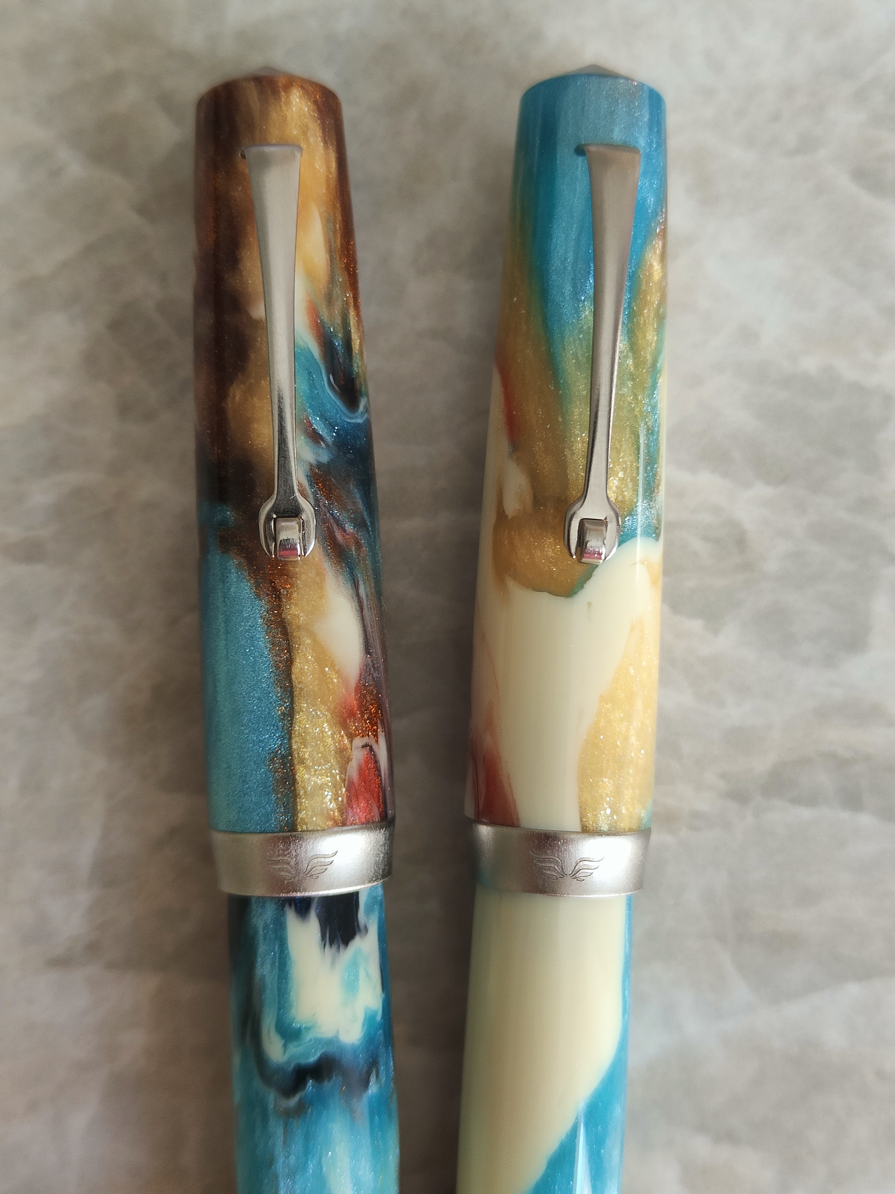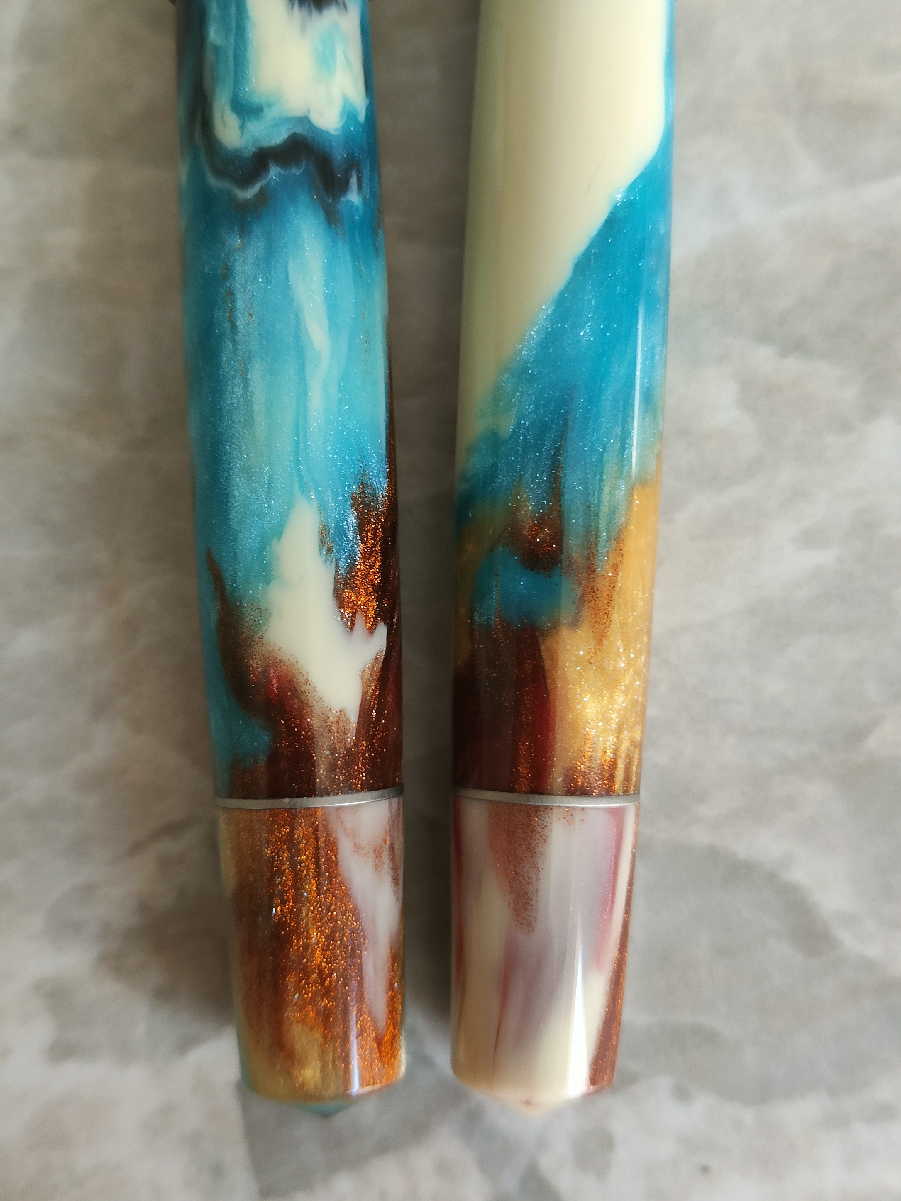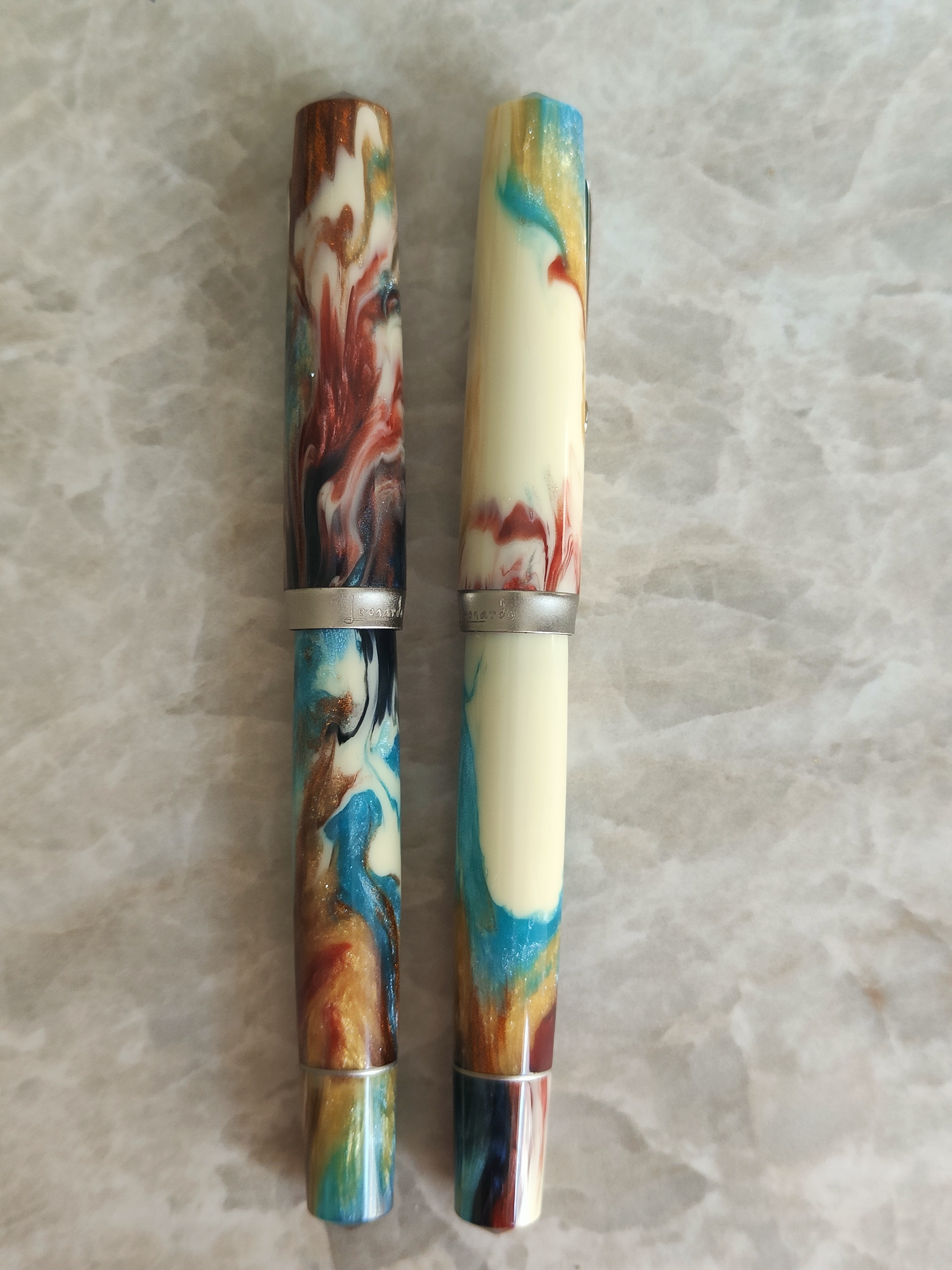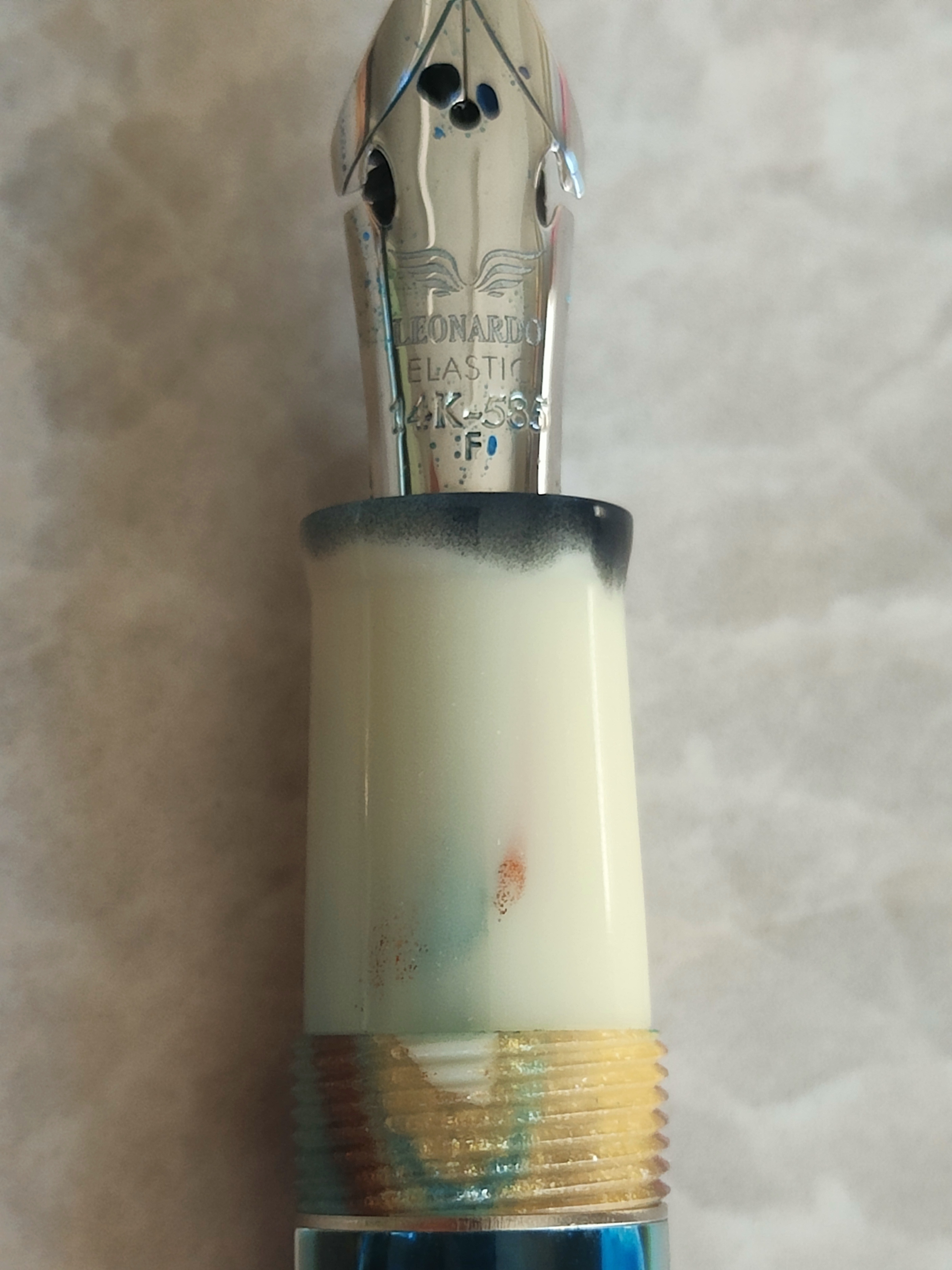 Dopo un paio di settimane di Cosmic Dust con Fenice inhouse, ho scritto a Leonardo per chiedere se prevedesse di rifare entro l'anno un altro lotto con la stessa resina. La risposta è stata, purtroppo, negativa. Tuttavia, sono stata informata che ne era avanzata esattamente una, non messa in vendita perché contenente una quantità di bianco/avorio ritenuta eccessiva rispetto alle altre. Io adoro il bianco in questo tipo di resine, tanto che ho anche una Cherry Koi con molto bianco. Senza esitare ho confermato l'acquisto e ho scelto il pennino elastic in oro 14k carati nella misura CSI F. L'elastico in oro ce l'avevo EF e lo volevo anche nel grinding CSI. Si tratta di un'esperienza di scrittura completamente diversa rispetto a quella del Fenice CSI F. Con il Fenice ottengo una variazione ed un tratto che non ho trovato in nessun altro pennino, compresi gli IB Pelikan. Non saprei scegliere quale dei due CSI preferirei se dovessi indicarne uno solo e sono molto felice di averne entrambi.
