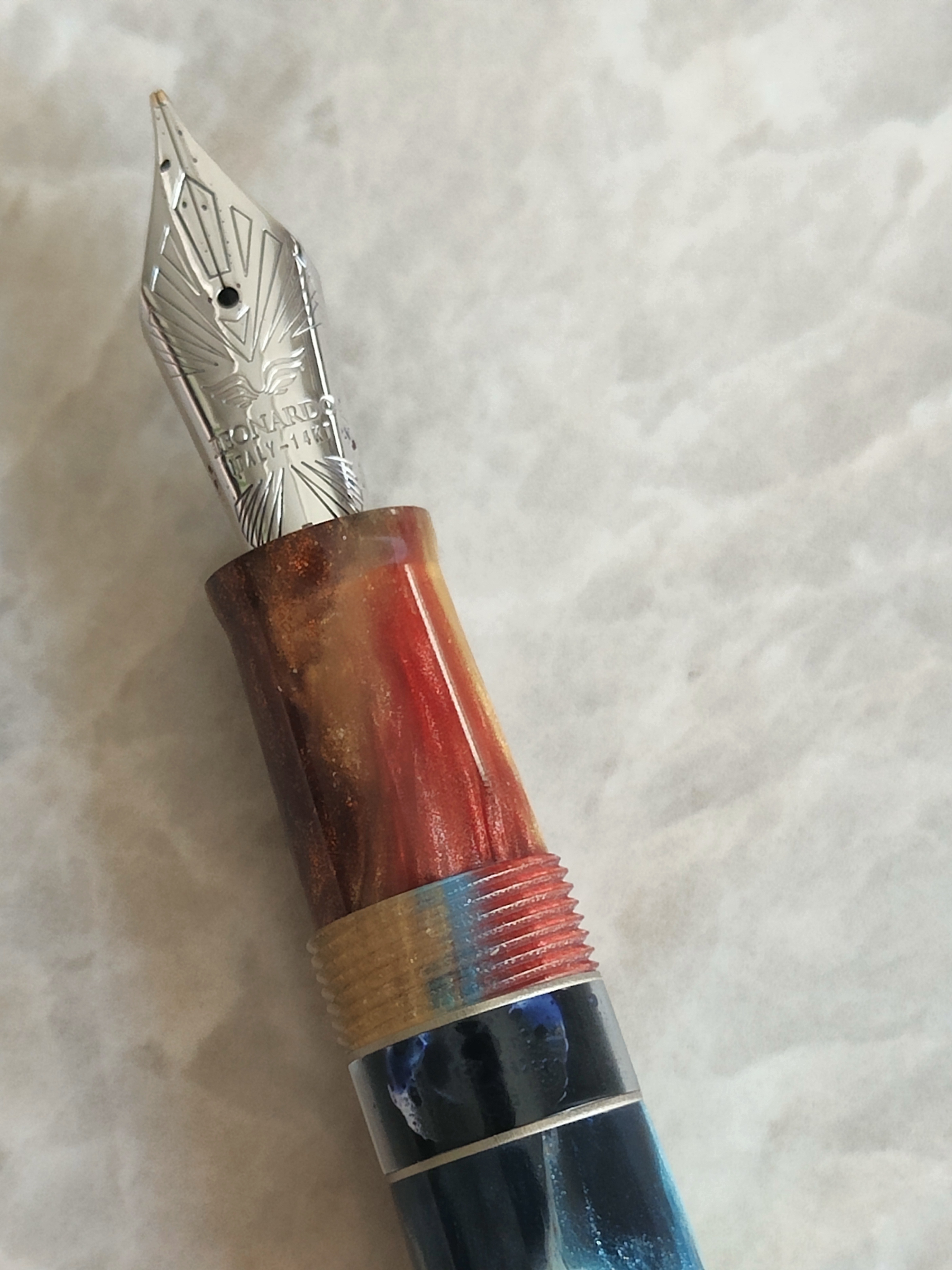 La prima Cosmic Dust che ho acquistato ha davvero le sfumature della polvere cosmica, dall'azzurro all' amaranto, oro e avorio. Per questa penna con le finiture rodio, ho richiesto se si potesse montare il pennino inhouse La Fenice #6, pagando la differenza e aspettando i tempi di assemblaggio. La Momento Magico è stata il mio primo modello di Leonardo: l'ho trovata da subito perfetta per dimensioni e sistema di caricamento. Nell'ultimo anno è stata disponibile solo in colori piuttosto classici e quando finalmente l'ho vista in una resina che incontrasse appieno il mio gusto, ho voluto dotarla di un pennino speciale, o meglio: che prometteva di essere speciale, stando a quanto mi diceva a tal proposito l'amico Tomcar. Ogni considerazione di Tomcar, che a volte mi sembrava esagerasse, ha trovato riscontro nella realtà: tutti i miei pennini Leonardo sono belli ma questo Fenice CSI F è qualcos’altro, è un "modo altro di essere pennino", un'esperienza di scrittura che non so descrivere senza entrare in apparente contraddizione verbale, come succedeva a Tomcar. È rigido, ma sembra di scrivere con un pennino morbido; a differenza che se fosse morbido, ha la precisione chirurgica dei "pennini chiodo", al tempo stesso il tratto ha il carattere un po' "comics" dei pennini "meno bisturi", è scorrevolissimo ma ha un feedback "intenso"che non somiglia a nessun altro feedback da me provato fino ad ora. È come scrivere con il 21k F di una Sailor Progear o 1911 Large, con un flusso di inchiostro altrettanto controllato, che restituisce un tratto italico. Di seguito una prova di scrittura, perché ritengo che il risultato finale mostri bene l'unicità di questo pennino:
