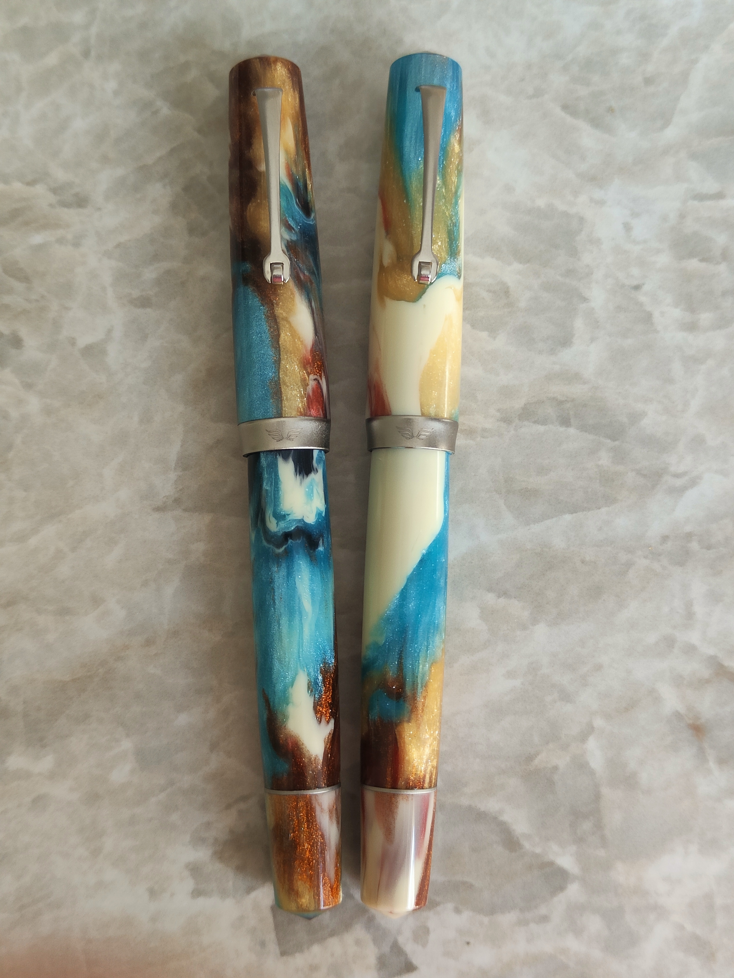 Dopo un paio di settimane di Cosmic Dust con Fenice inhouse, ho scritto a Leonardo per chiedere se prevedesse di rifare entro l'anno un altro lotto con la stessa resina. La risposta è stata, purtroppo, negativa. Tuttavia, sono stata informata che ne era avanzata esattamente una, non messa in vendita perché contenente una quantità di bianco/avorio ritenuta eccessiva rispetto alle altre. Io adoro il bianco in questo tipo di resine, tanto che ho anche una Cherry Koi con molto bianco. Senza esitare ho confermato l'acquisto e ho scelto il pennino elastic in oro 14k carati nella misura CSI F. L'elastico in oro ce l'avevo EF e lo volevo anche nel grinding CSI. Si tratta di un'esperienza di scrittura completamente diversa rispetto a quella del Fenice CSI F. Con il Fenice ottengo una variazione ed un tratto che non ho trovato in nessun altro pennino, compresi gli IB Pelikan. Non saprei scegliere quale dei due CSI preferirei se dovessi indicarne uno solo e sono molto felice di averne entrambi.