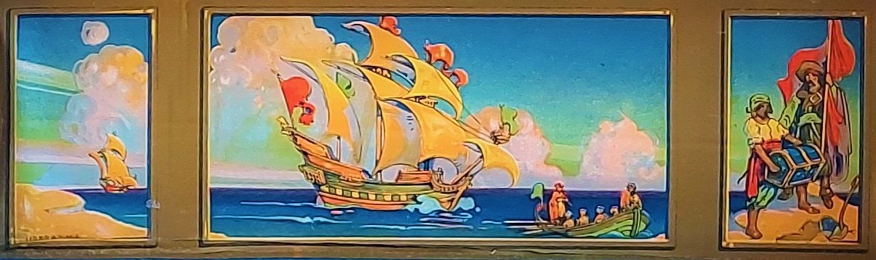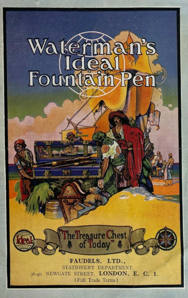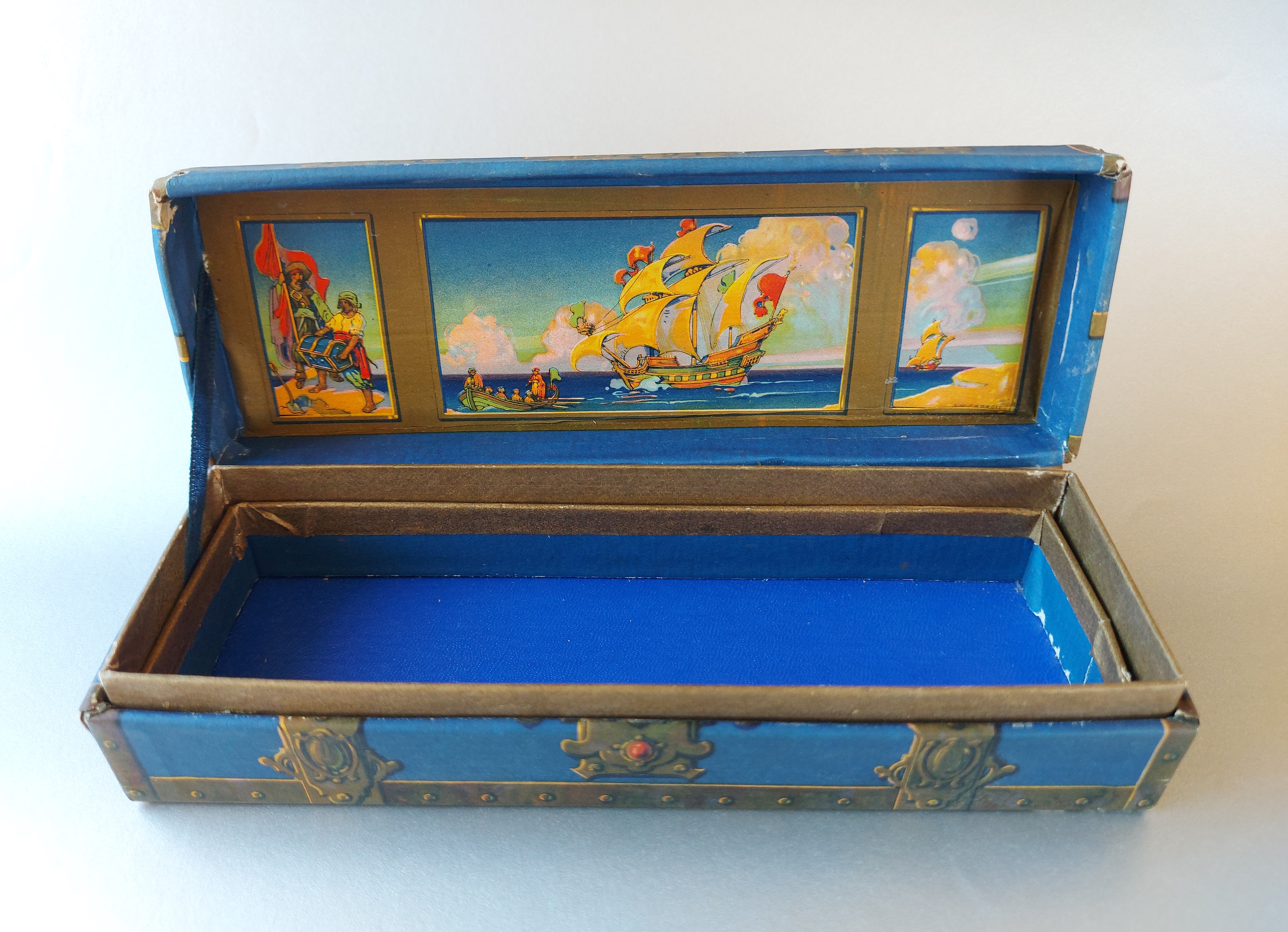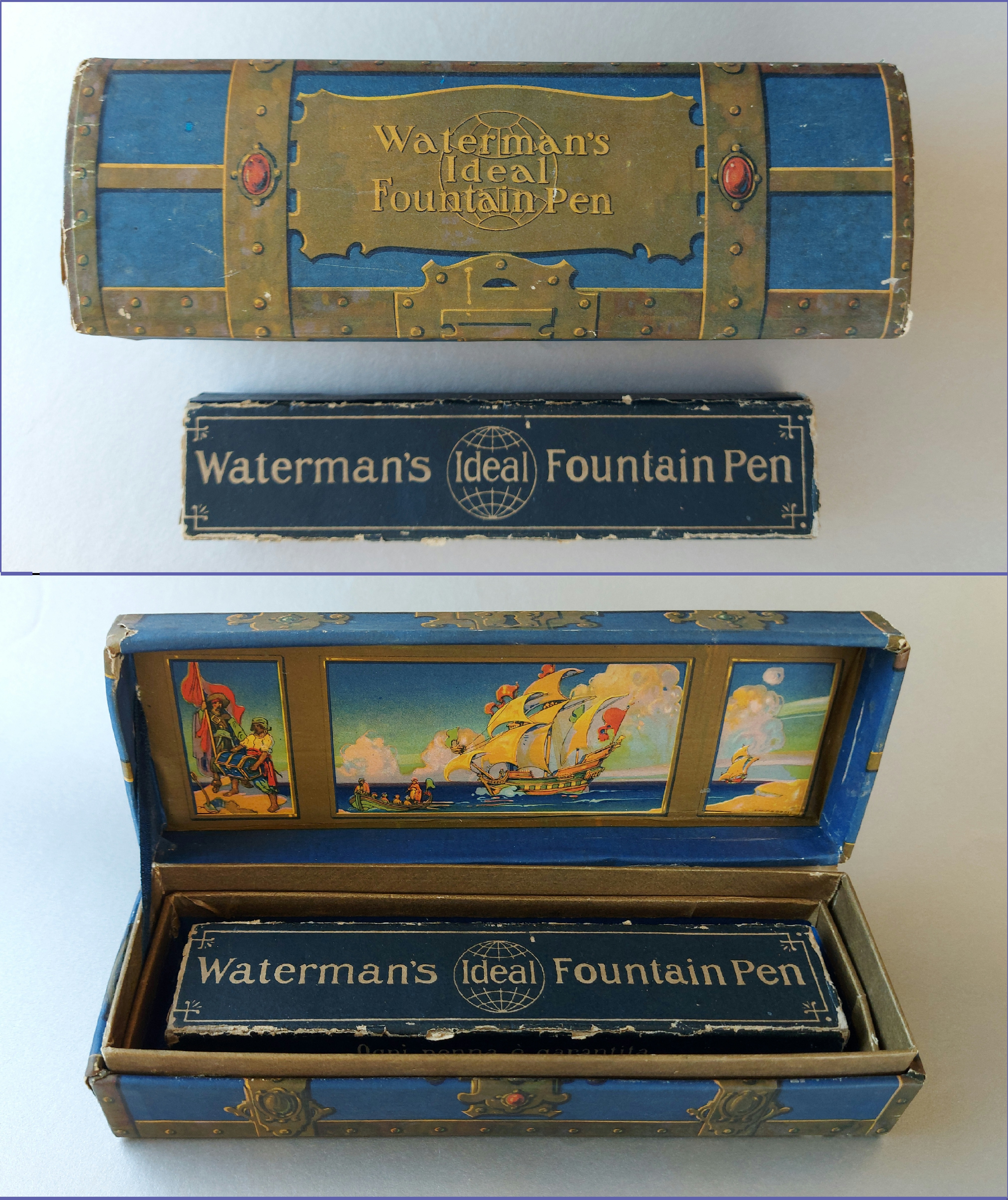 All’interno del coperchio, su un pannello diritto applicato sotto la bombatura, dipinto in un trittico si può leggere (da destra verso sinistra, però) in un mini ciclo pittorico didascalico l’antefatto del sotterramento del forziere… Alla scatola - che mi sono aggiudicato dopo una lotta davvero accanita tra bucanieri, filibustieri e corsari dei sette mari (ovviamente sulla Baia!) - manca un pezzo “mobile”: si tratta di un ripiano (in cartone rivestito) che riproduce un “tappeto” di monete e gioielli, sulla superficie del quale erano state ricavate 6 feritoie per il passaggio di due nastri di raso blu, il cui scopo era quello di tenere fermi in posizione fino a 3 strumenti di scrittura. Waterman’s Treasure Chest inside [Source unknown in G. Kovalenko's blog]
