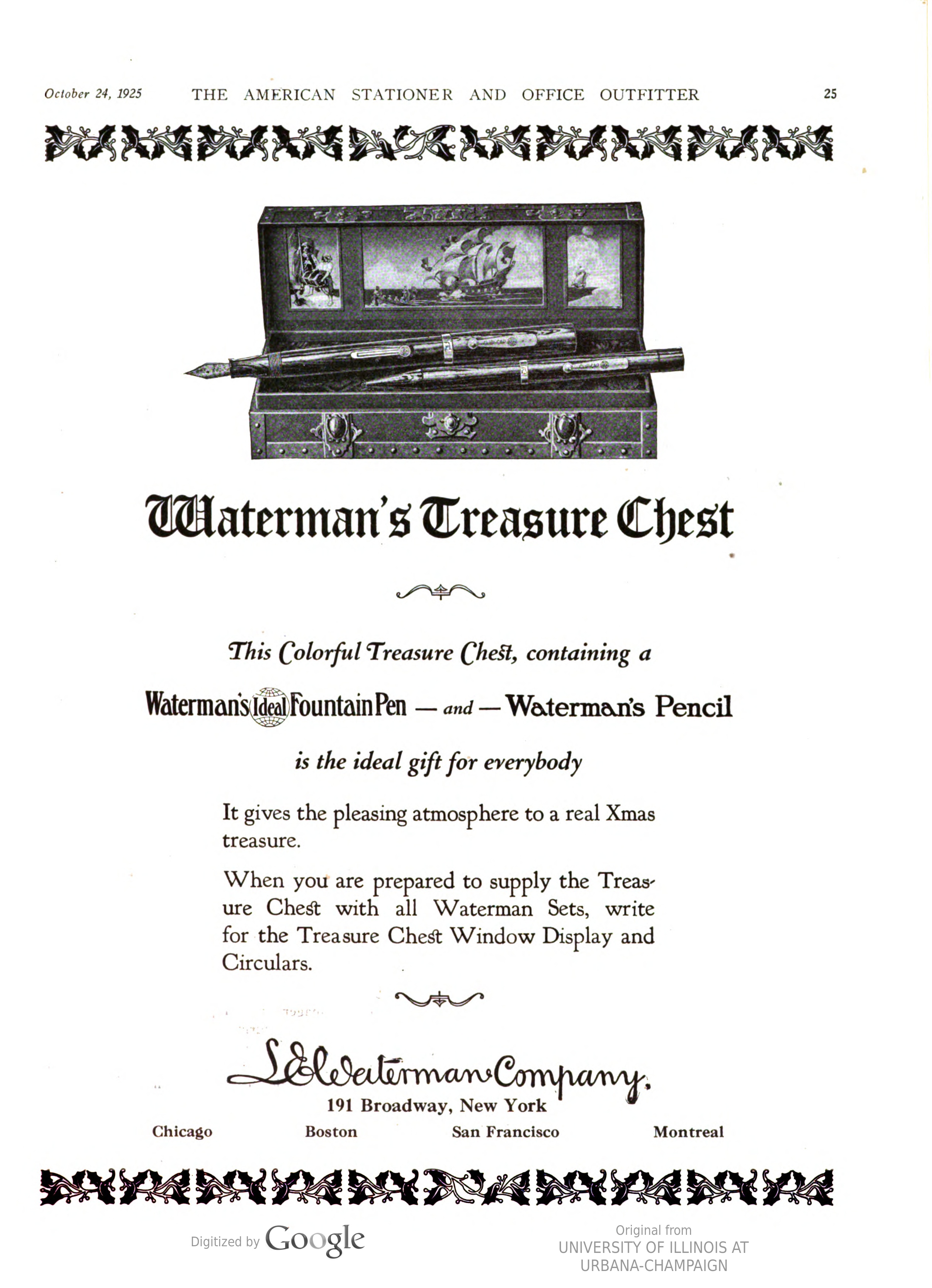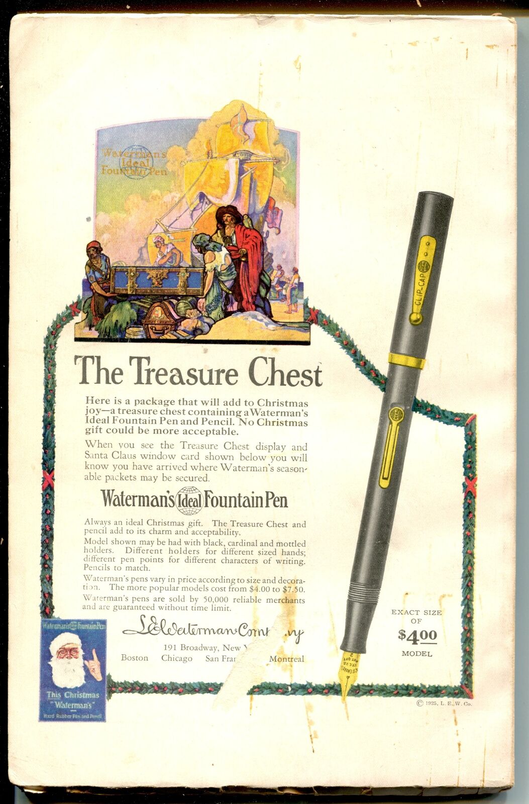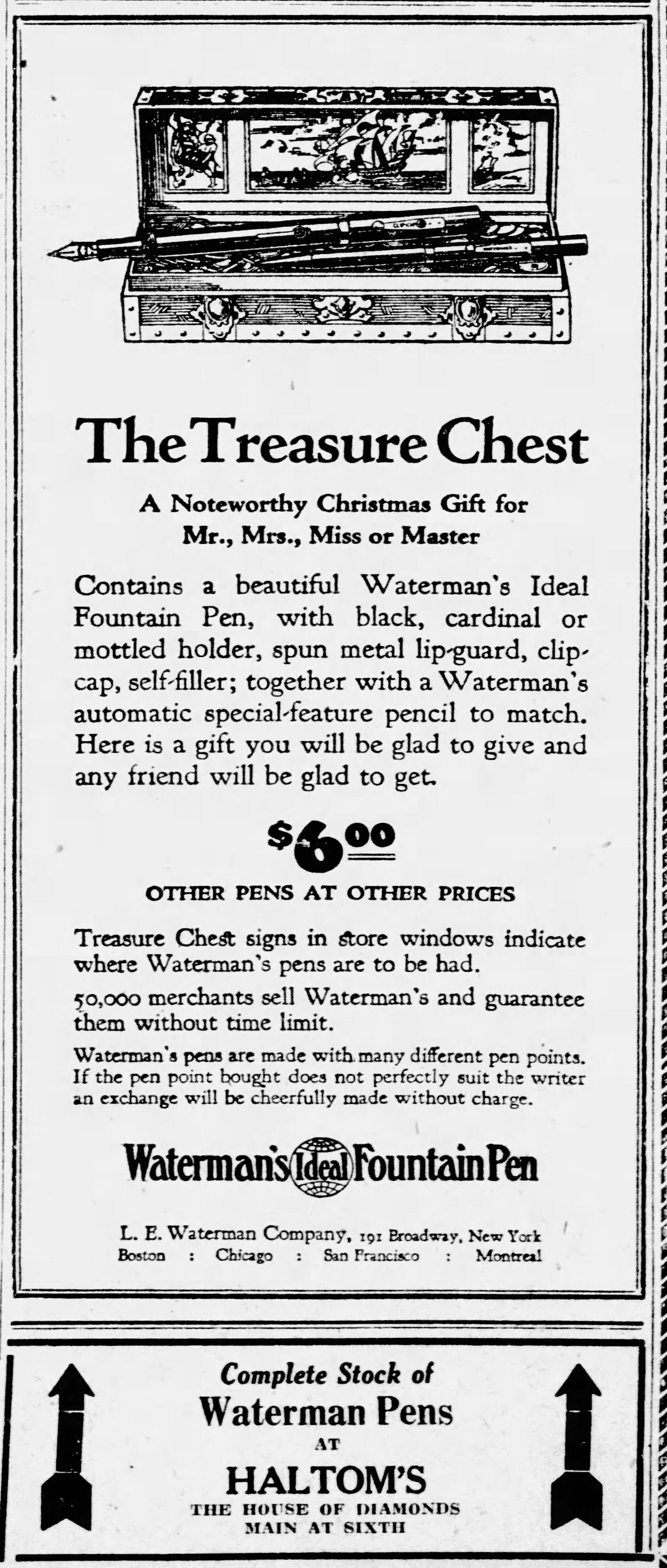 All’interno del coperchio, su un pannello diritto applicato sotto la bombatura, dipinto in un trittico si può leggere (da destra verso sinistra, però) in un mini ciclo pittorico didascalico l’antefatto del sotterramento del forziere… Alla scatola - che mi sono aggiudicato dopo una lotta davvero accanita tra bucanieri, filibustieri e corsari dei sette mari (ovviamente sulla Baia!) - manca un pezzo “mobile”: si tratta di un ripiano (in cartone rivestito) che riproduce un “tappeto” di monete e gioielli, sulla superficie del quale erano state ricavate 6 feritoie per il passaggio di due nastri di raso blu, il cui scopo era quello di tenere fermi in posizione fino a 3 strumenti di scrittura. Waterman’s Treasure Chest inside [Source unknown in G. Kovalenko's blog]