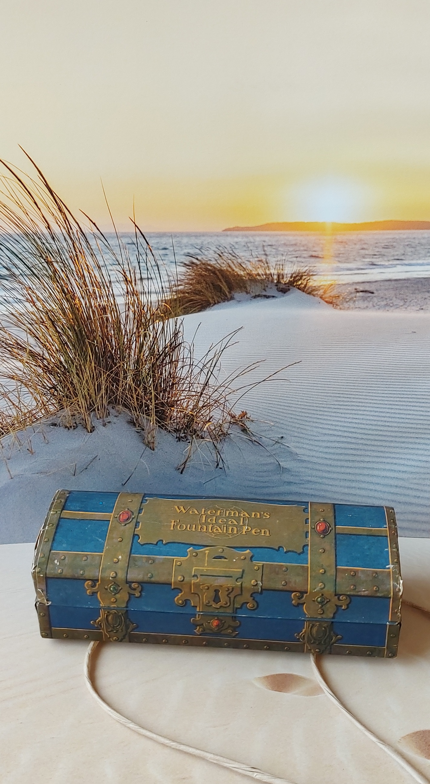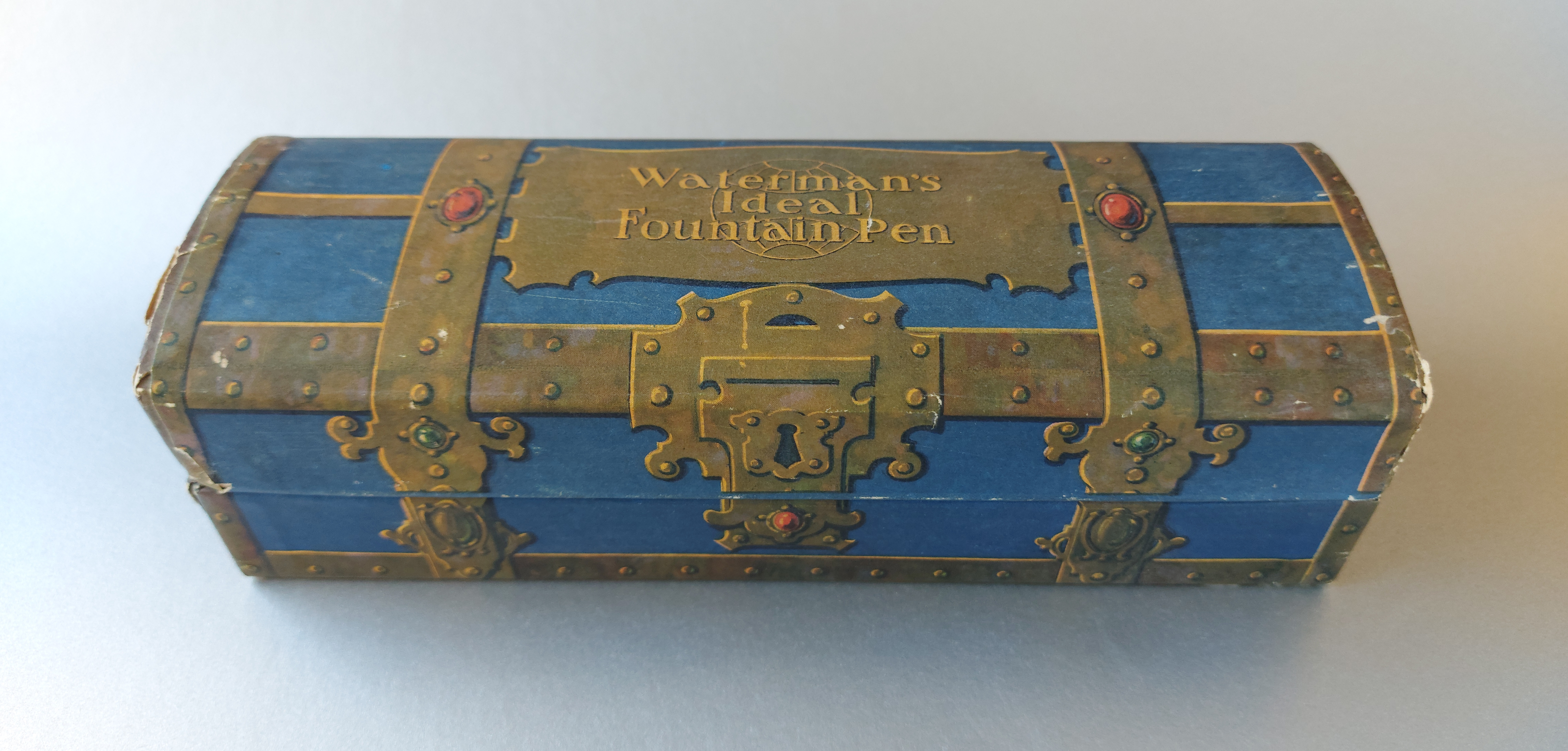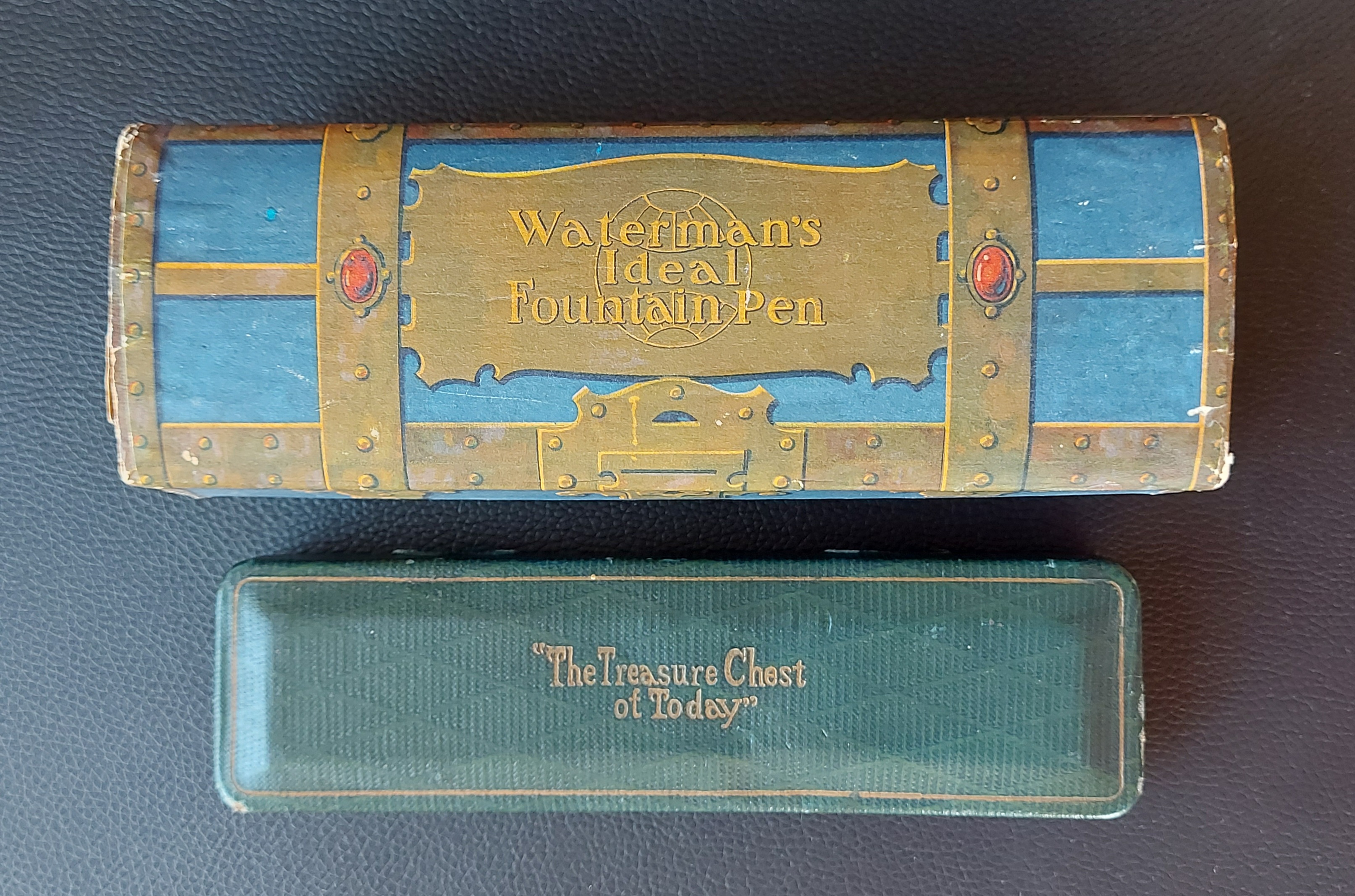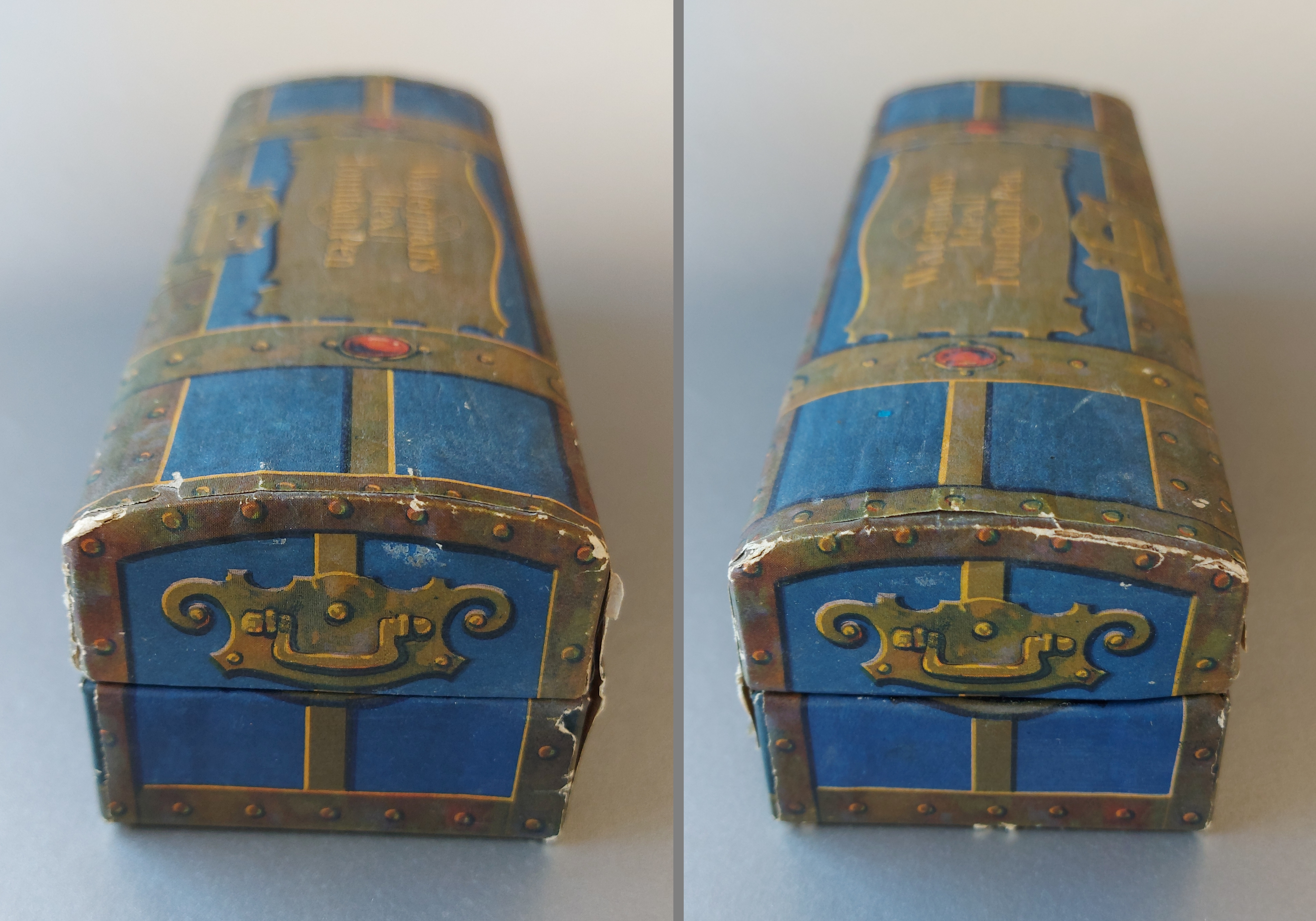 Un consiglio per chi fosse interessato a procurarsi un forziere Waterman’s (ogni tre anni circa se ne può trovare in vendita un esemplare, se ve lo spediscono fuori dagli USA…): si faccia attenzione che sia presente sul lato sinistro interno la fettuccia di tessuto blu che fa da cerniera tra il coperchio e la base; se così non fosse si dovrebbe ricostruirla perché assolutamente essenziale per non strappare la garza e la carta che tengono solidali le due parti (probabilmente a suo tempo avrebbero fatto meglio a metterne una anche dall’altro lato, visto che il coperchio tende a distanziarsi dove manca la cerniera).