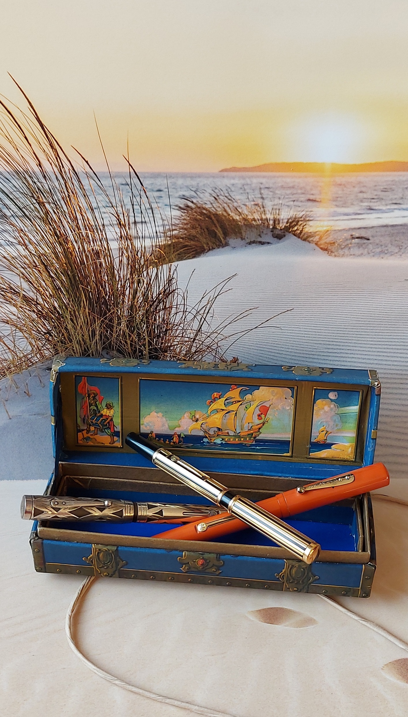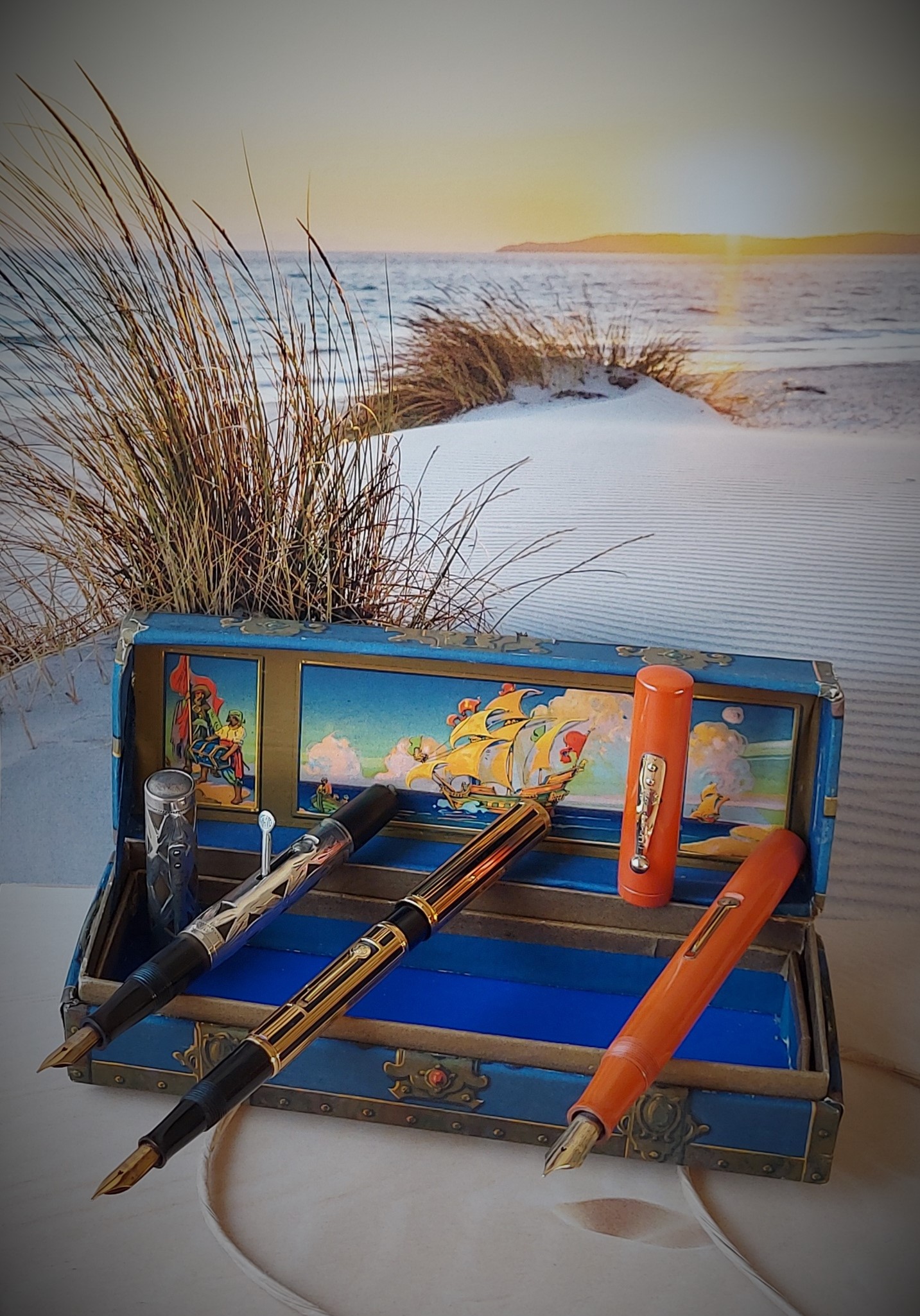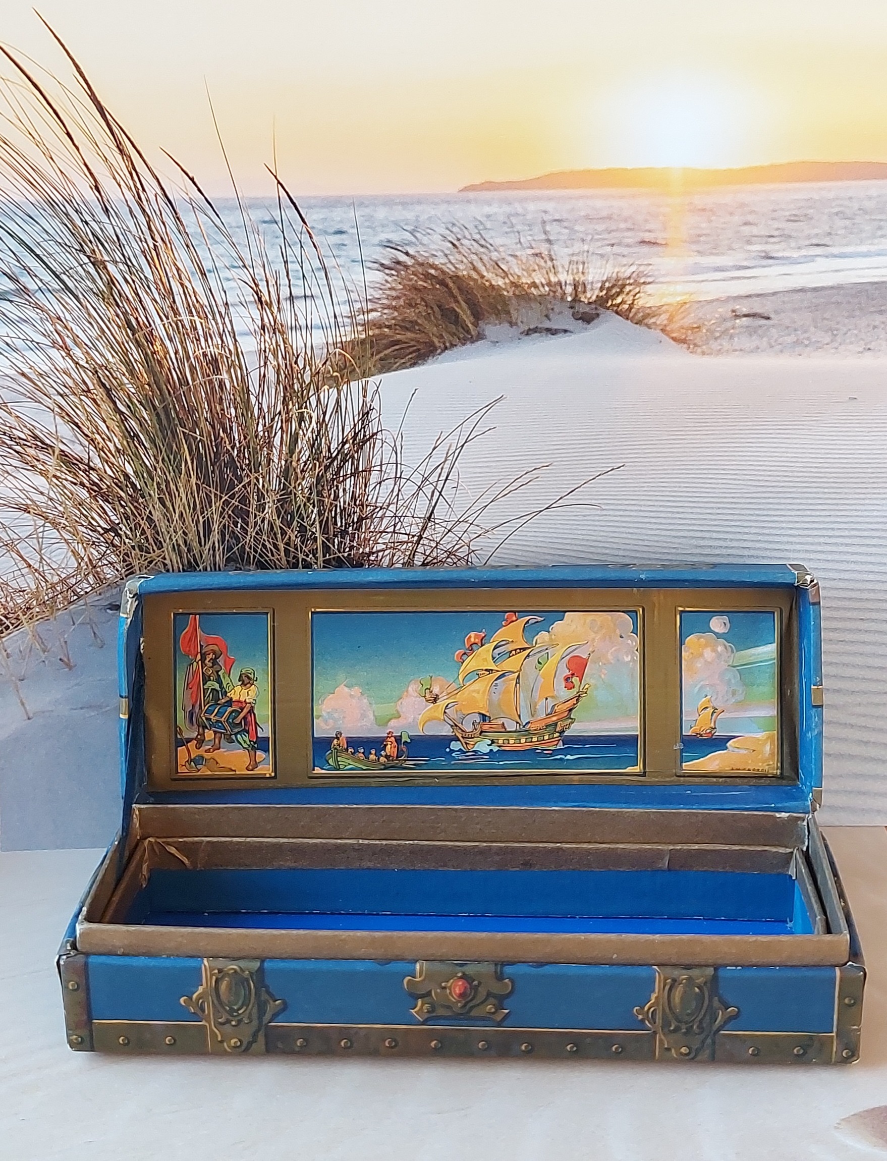 Il disegno esterno della cassa non è “realistico”, bensì realizzato nello stile delle tavole che corredavano le edizioni dei romanzi d’avventura di ambientazione piratesca, da cui l’idea di questo contenitore trae ispirazione. “Treasure Island” (L’isola del tesoro, prima edizione 1883) è il titolo del capolavoro di Robert Louis Stevenson e “Treasure Chest” (La cassa del tesoro) è il nome commerciale della scatola portapenne.