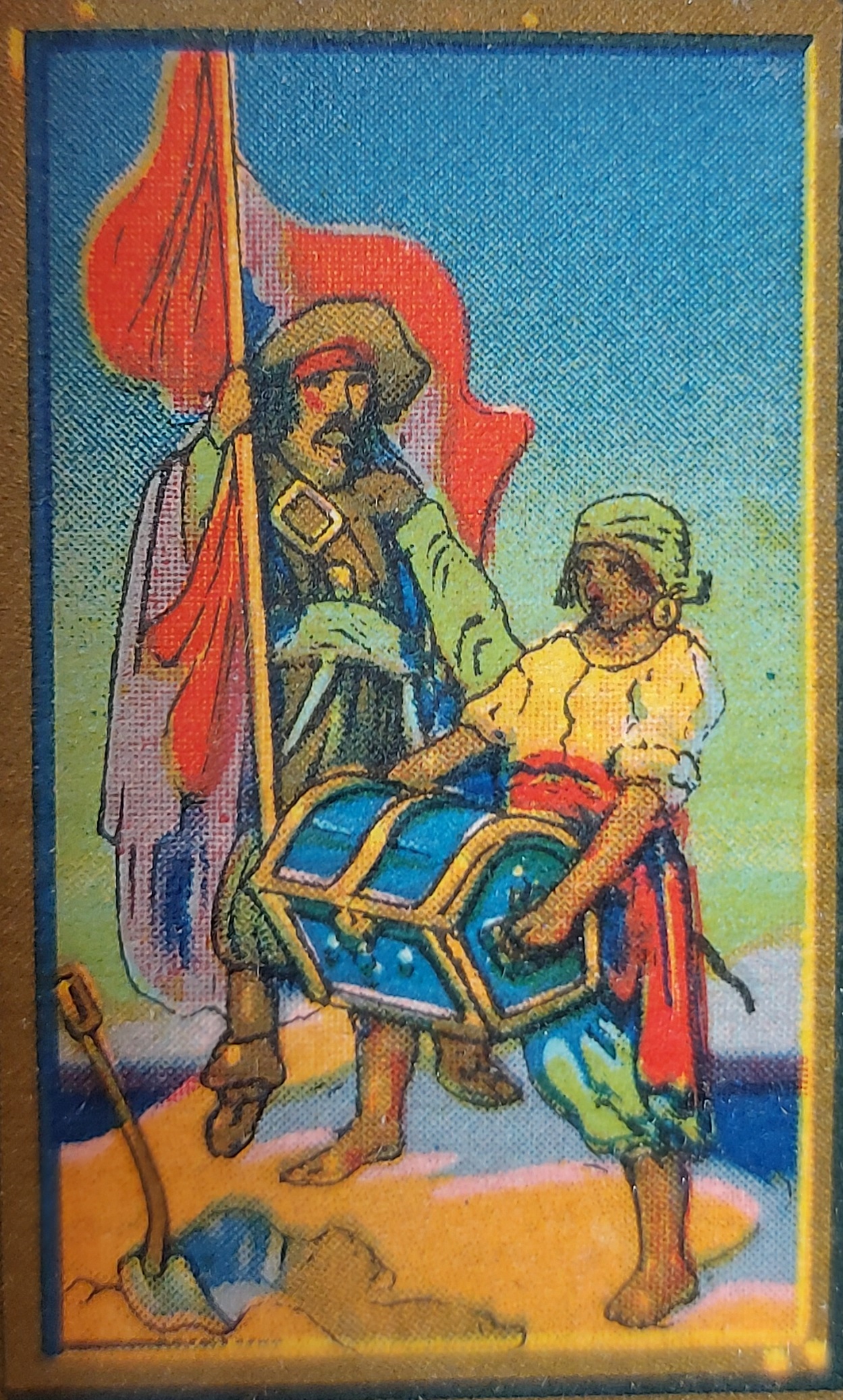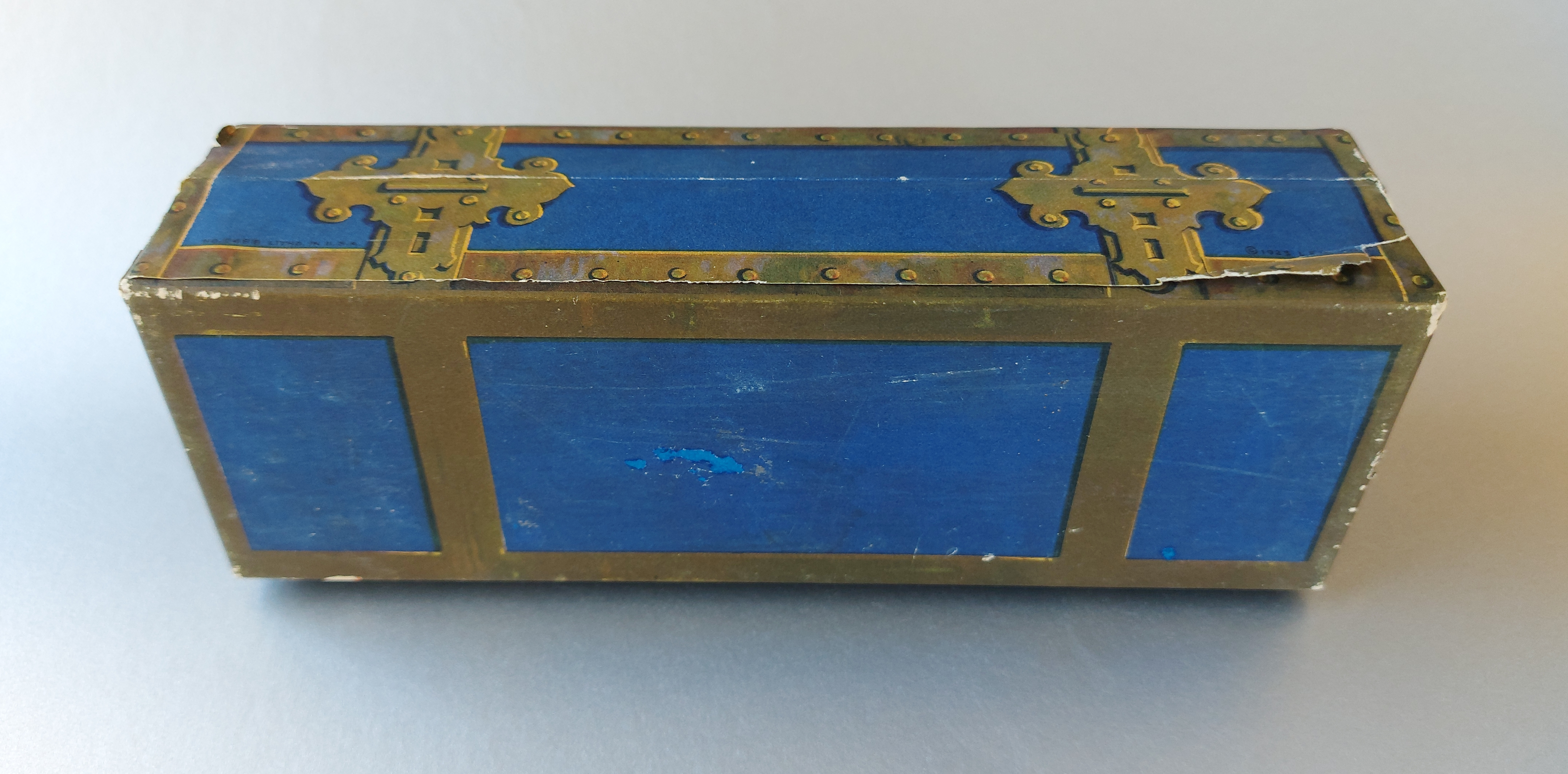 Si tratta di una scatola piuttosto grande in robusto cartone, sagomata come un baule con coperchio “a botte”, rivestita di carta stampata, a colori, che riproduce le fattezze di un tipico “forziere del tesoro” (treasure chest) dell’epoca d’oro della pirateria…
