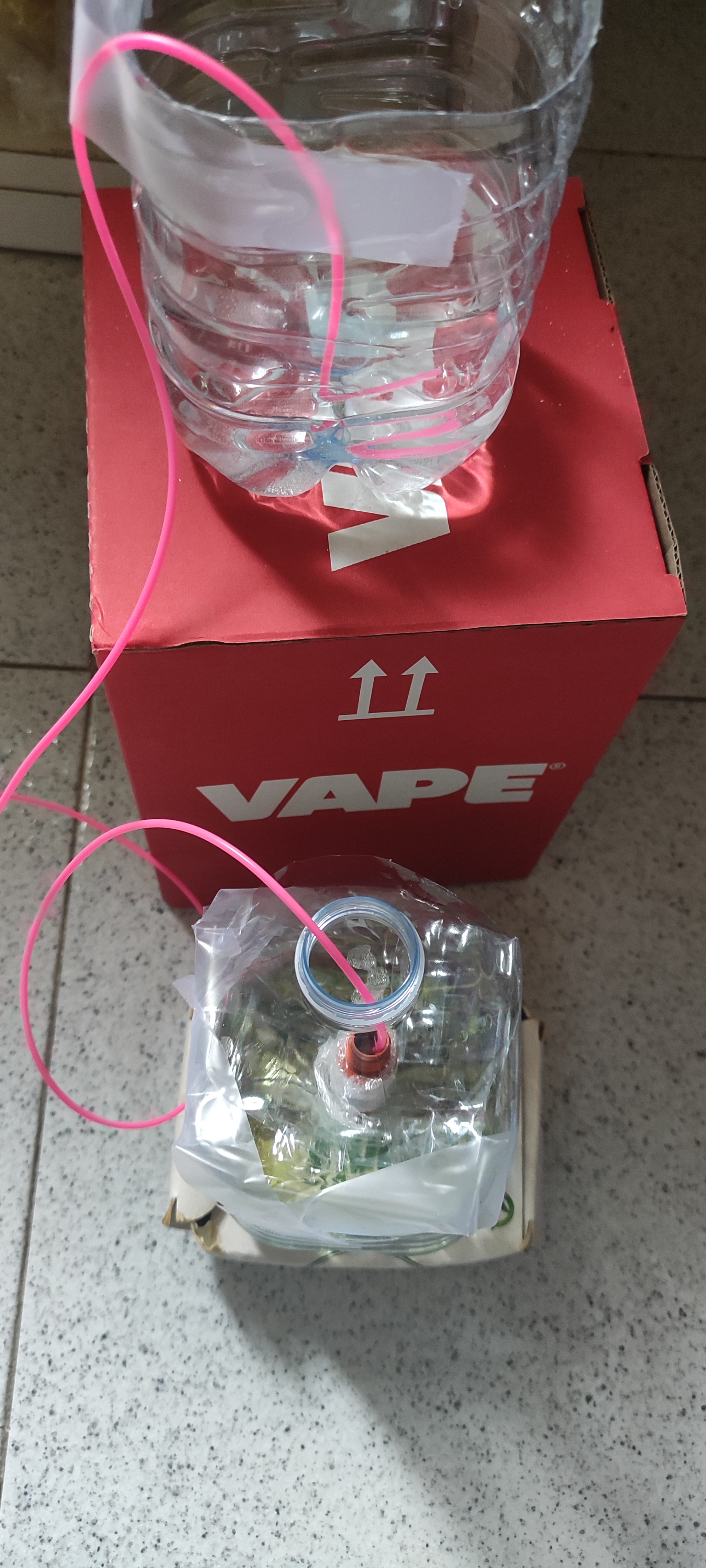 Per Tenere fermo il tubo viene usato il collo della bottiglia ritagliata in modo che rimane più piccola rispetto al contenitore che raccoglie l'acqua , così non scivola giù.