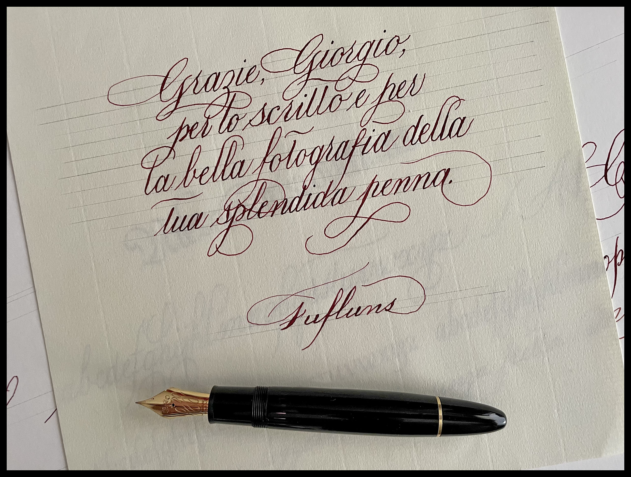 Io, in modo del tutto casuale, ne ho uno montato su una delle mie penne in assoluto preferite, la Montregrappa Extra 1930 in celluloide Bambù Nero. Montegrappa me lo vendete come "stub", ma ha tutta la magia di un italico corsivo, più una piacevolissima elasticità. É un pennino marcato <★2670VI>, il che ne fa un prodotto della "seconda gestione Aquila", posteriore al 2005, ma ancora di quelli bicolori, con la bellissima greca palladiana che fa gioco con con il disegno dell'anello sul cappuccio. Il pennino più bello di Montegrappa, a mio avviso.