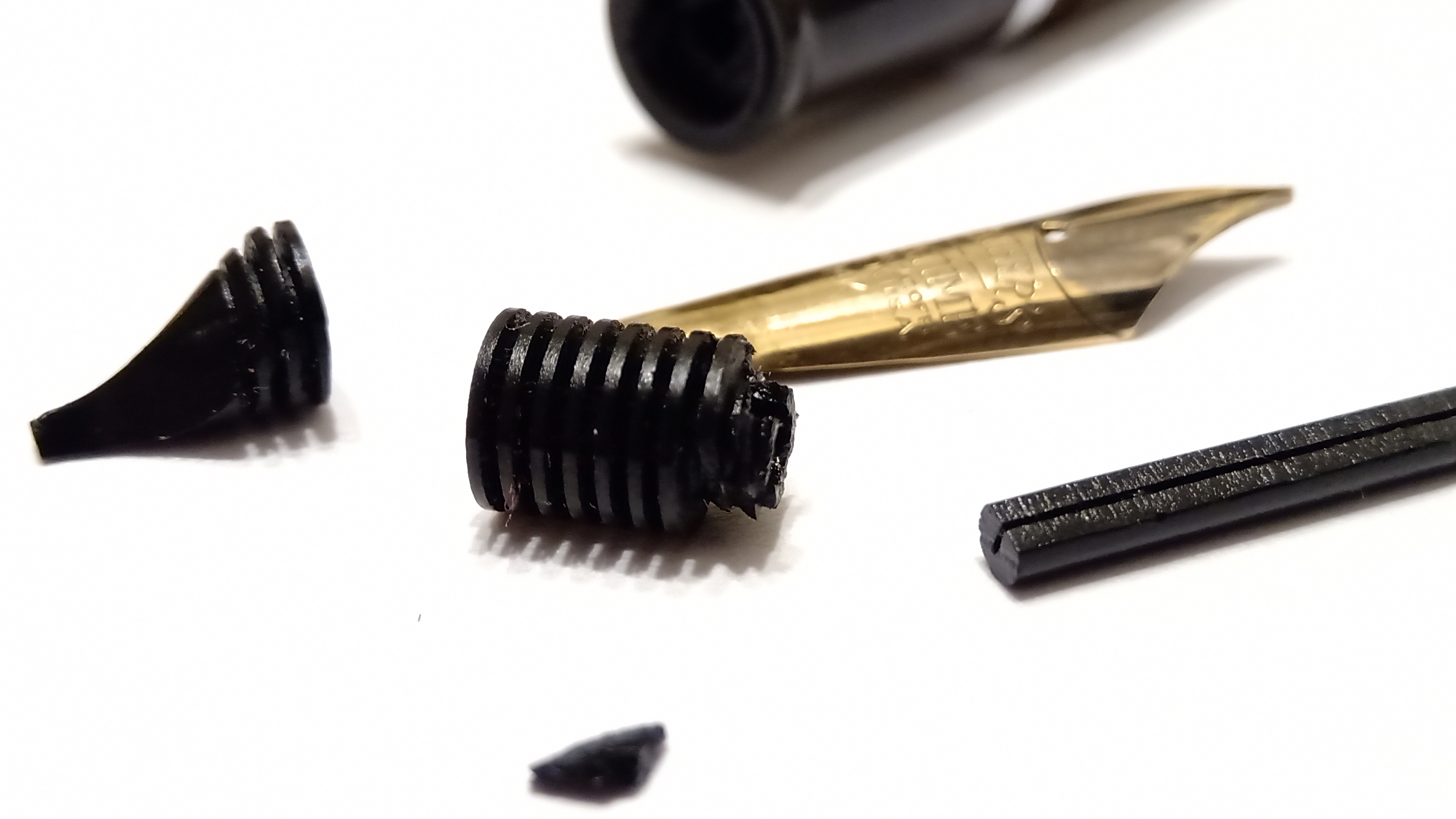 La parte esterna del laminato era in condizioni relativamente buone, così come l'impronta, ma l'alimentatore era completamente distrutto (cosa che il venditore mi aveva già avvisato), il pennino con le punte fuori livello e il sistema di caricamento completamente inutilizzabile ...