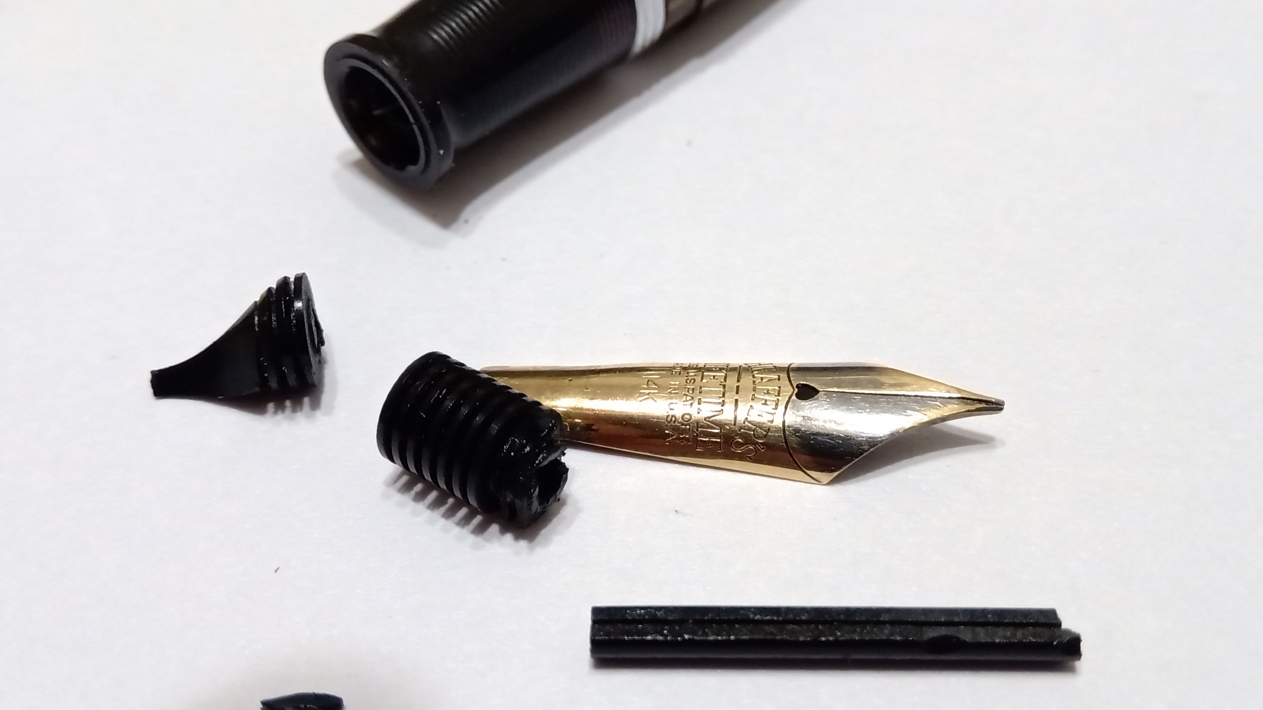 Ho quindi cercato tra la vecchia spazzatura nella mia scatola dei ricambi un alimentatore in ebanite Sheaffer's, ma ne ho trovato solo uno con un diametro e una lunghezza maggiori e una punta diversa. Con molta pazienza ho gradualmente ridotto il diametro, ridotto la lunghezza a quella dell'originale, e poi ho intagliato l'estremità secondo l'intaglio che avevano quei modelli di alimentatore...
