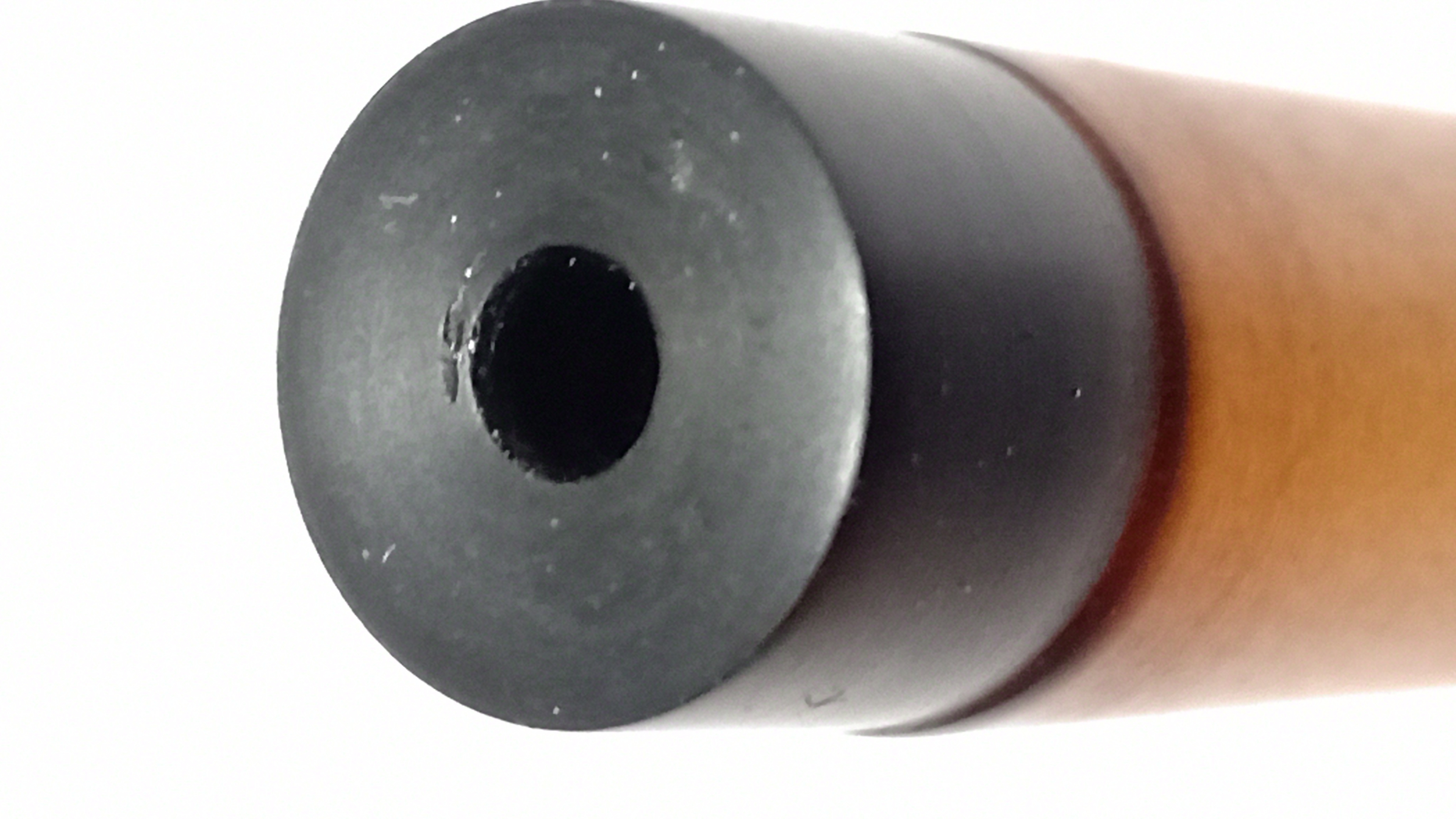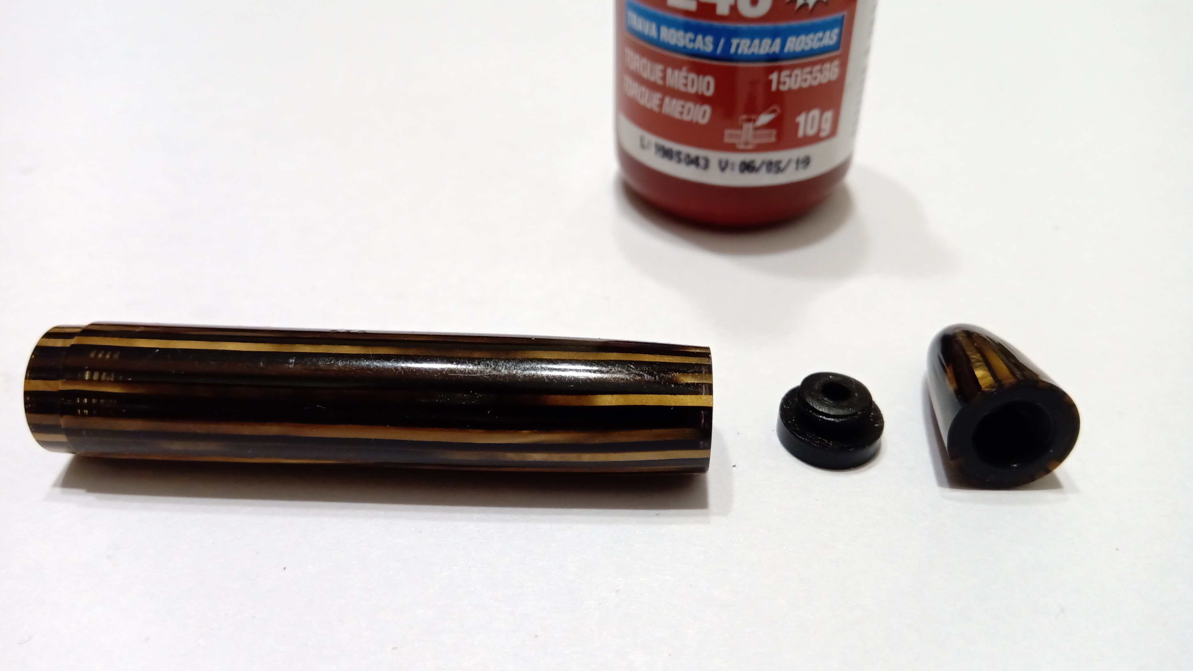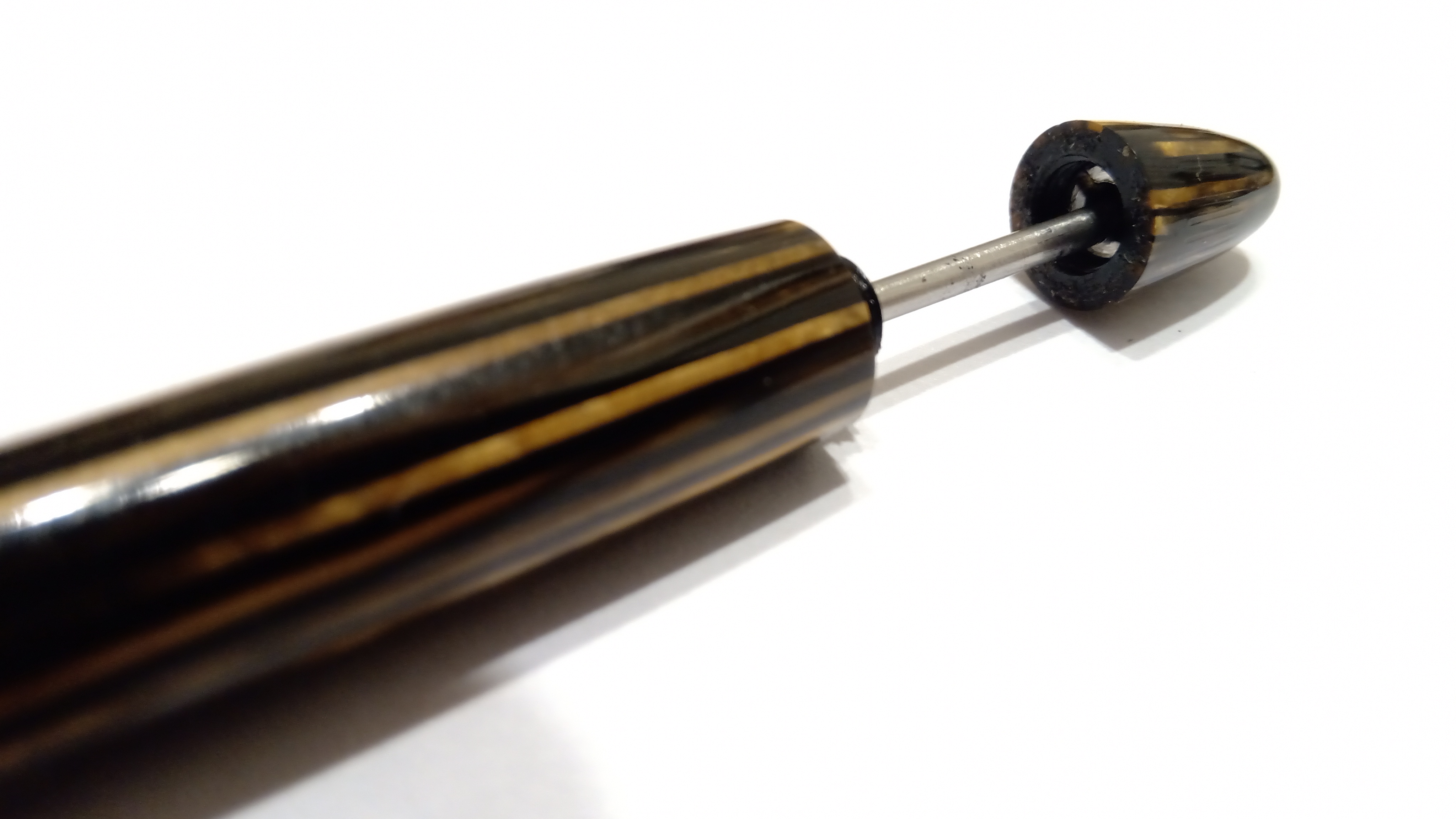 Ho continuato con il tappo cieco che funge da estremità dello stelo, utilizzando un po' di WD40 e uno strumento che ho realizzato appositamente per svitare l'anello di alluminio che fissa l'estremità dello stelo. Tolto l'anello si scopre la chiusura terminale che articola l'insieme, ed essendo di celluloide va svitata con estrema attenzione, facendo attenzione a non segnare con due pezzi di legno l'asta di acciaio, e la celluloide bloccare, se necessario, con un pezzo di gomma...