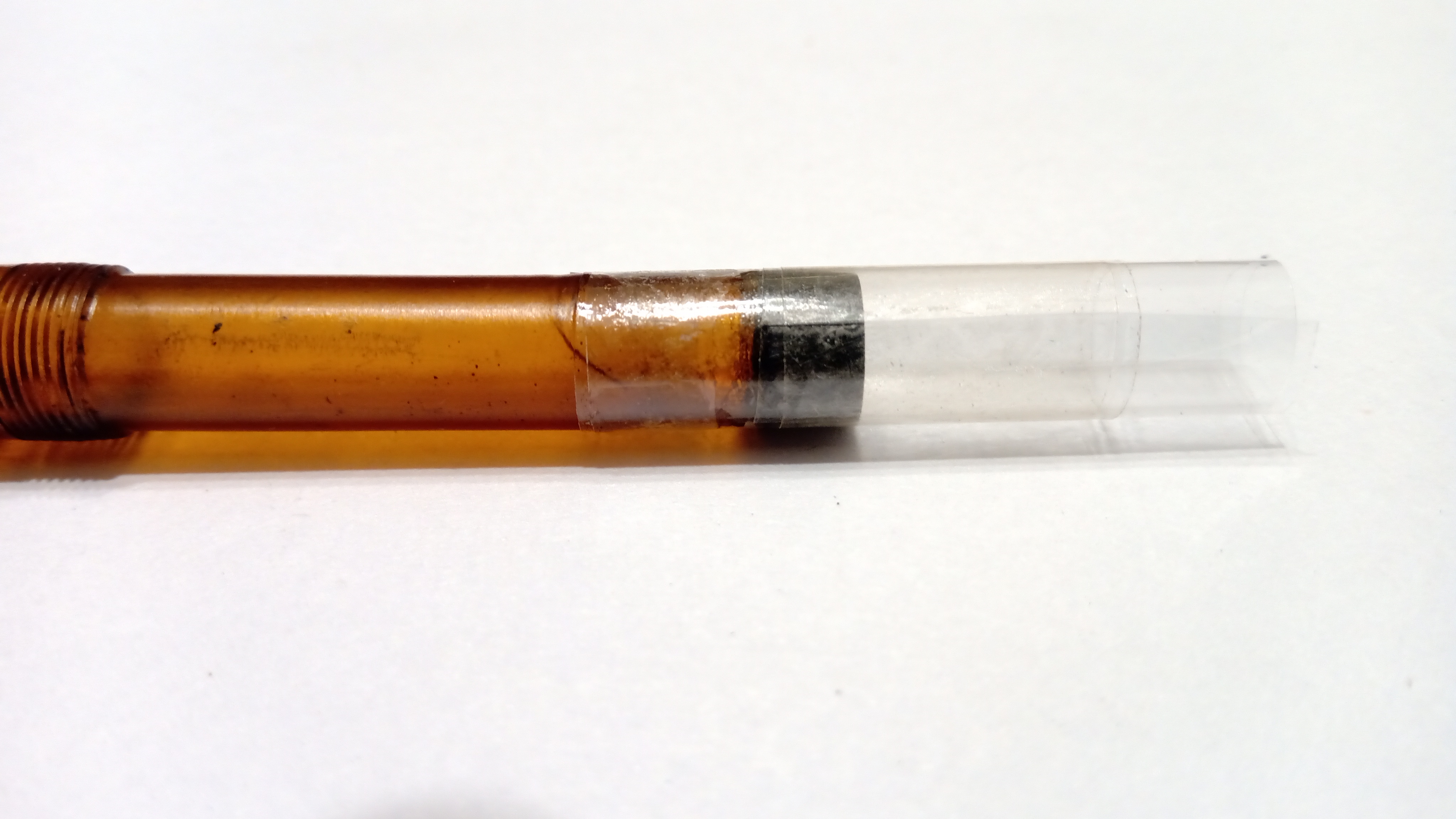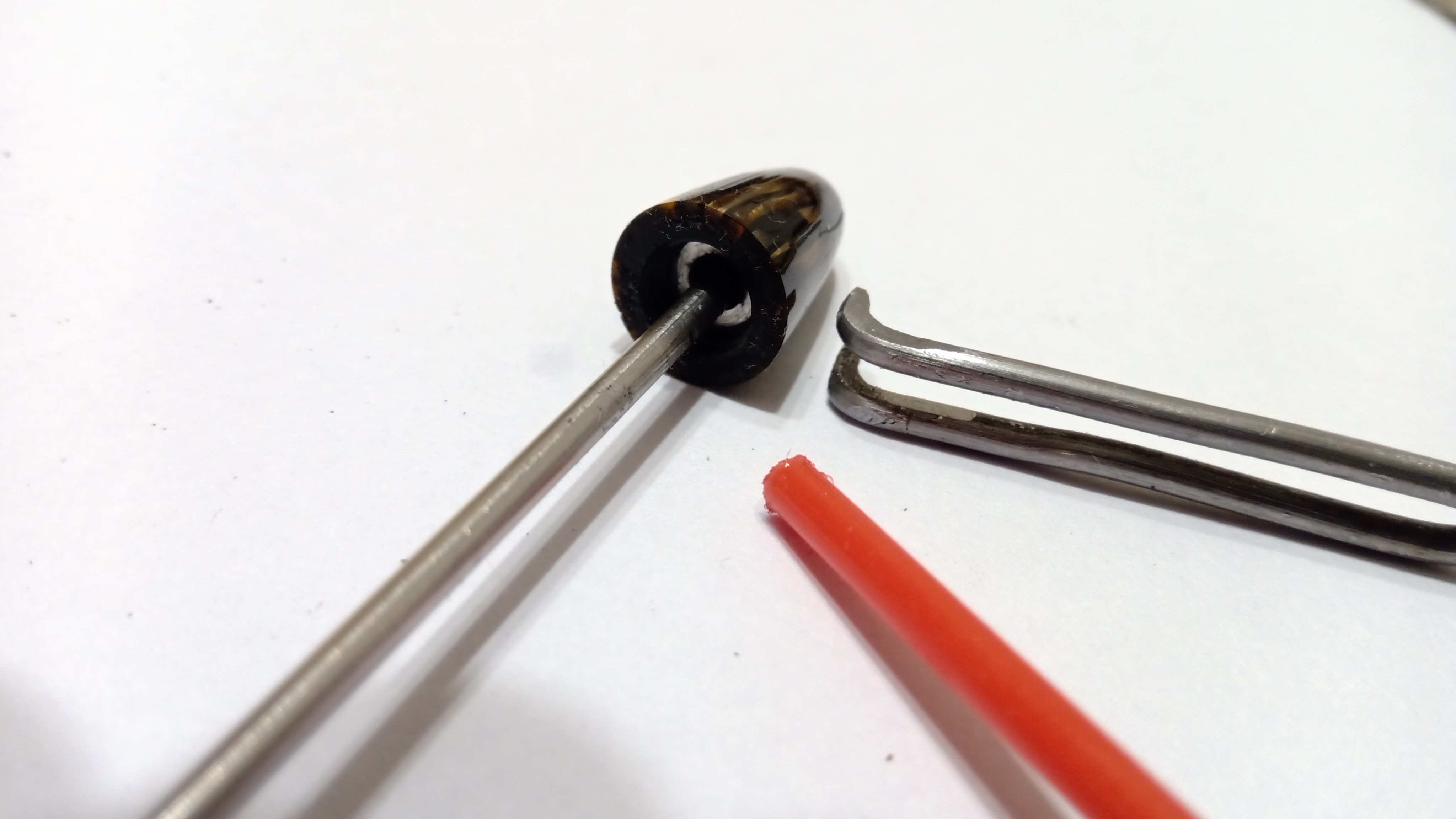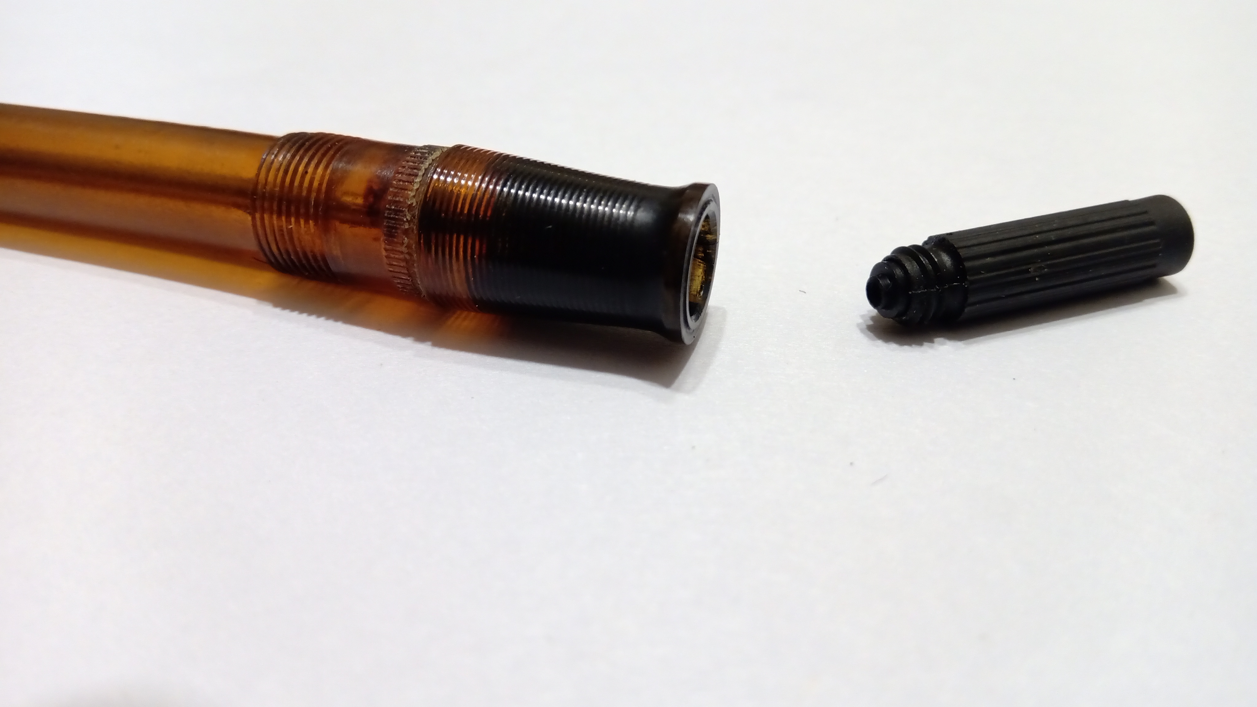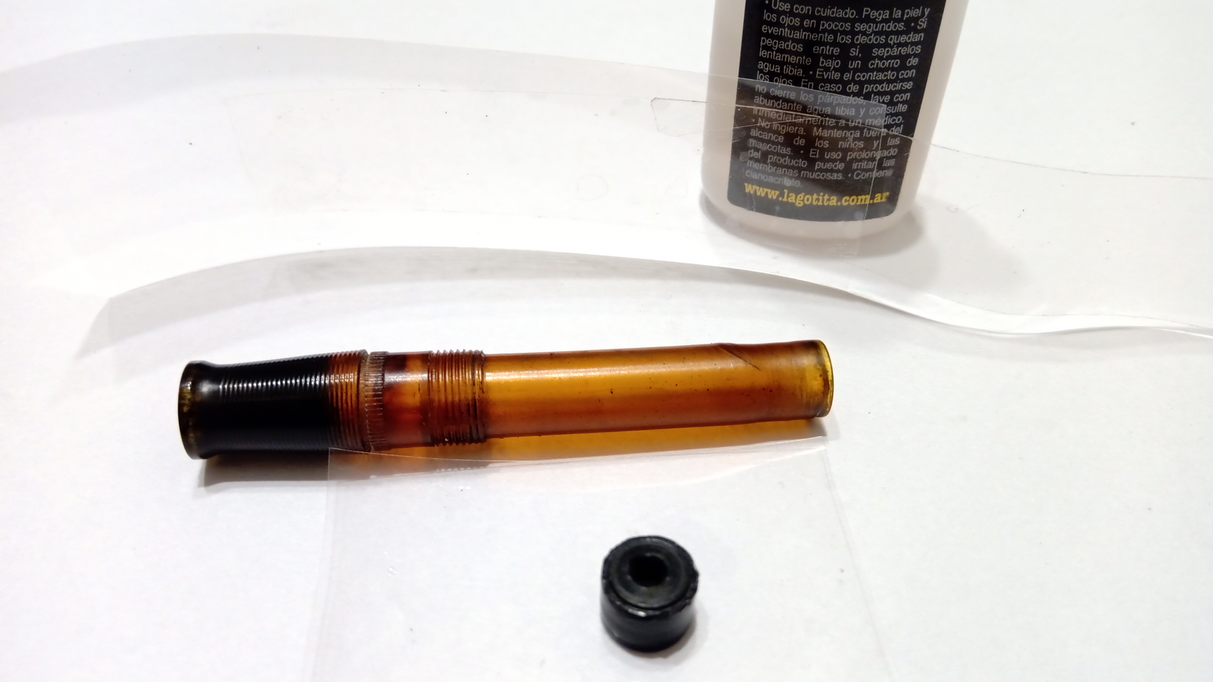 Con il calore e qualche piccolo colpetto dall'estremità dell'impugnatura utilizzando un'asta metallica, sono riuscito a staccare la capsula e rimuovere la rondella in celluloide che si trova all'estremità dello stelo o asta metallica. Questa rondella di celluloide è quella che supporta e fissa la rondella di gomma per generare il vuoto...