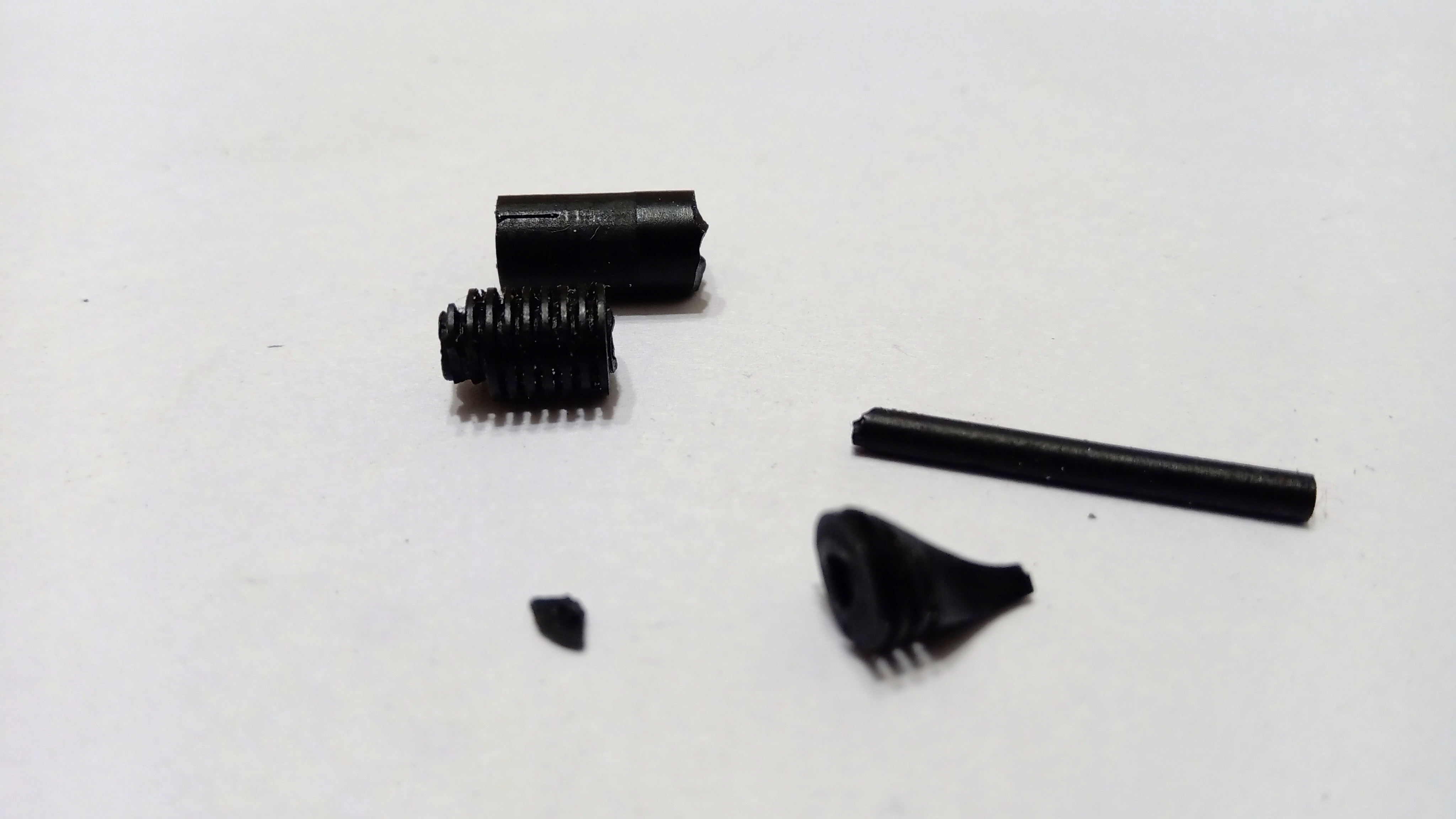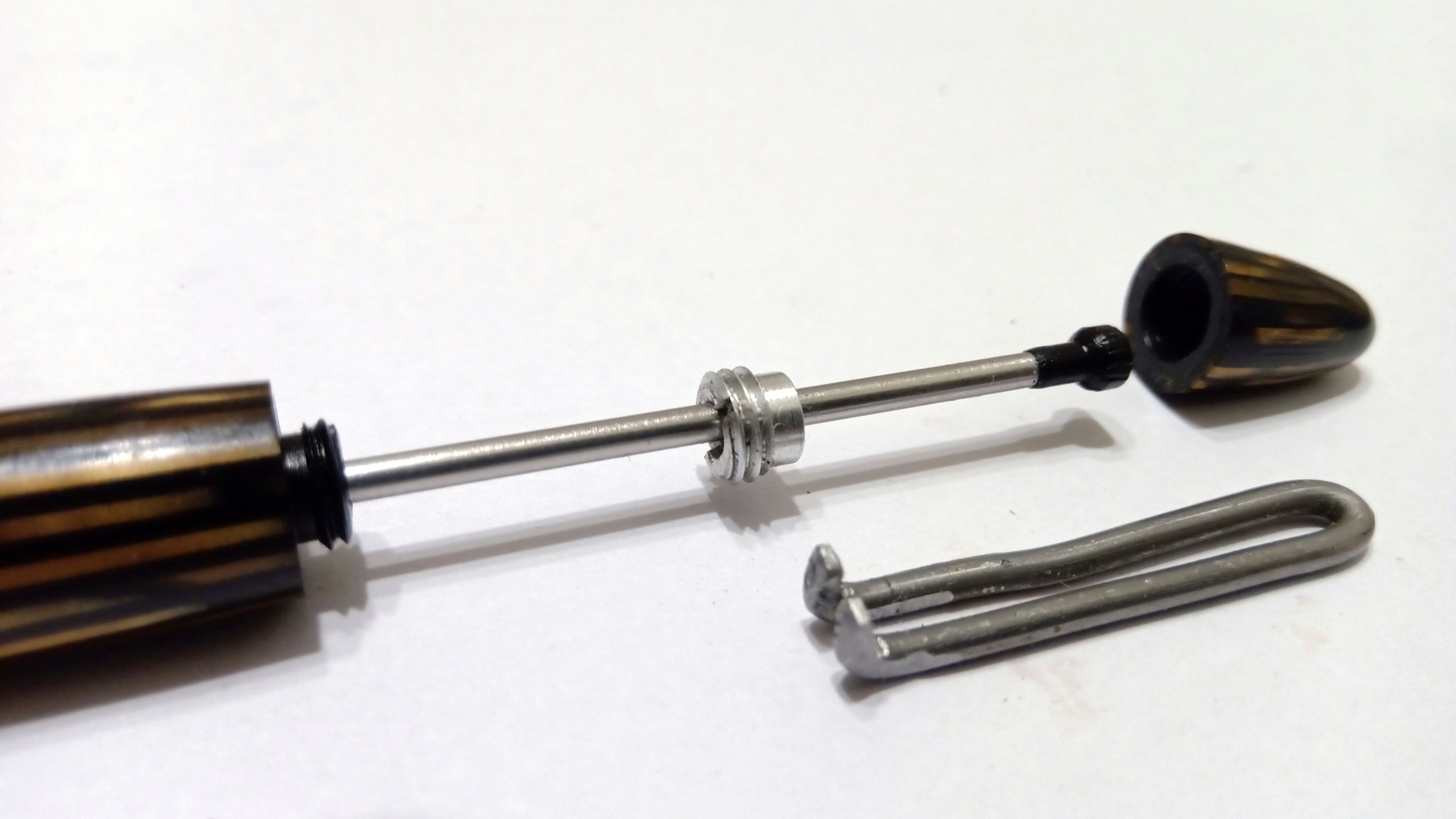 Poi ho rimosso la sicura della clip con un utensile a forma di uncino e tanta pazienza, per lasciare ognuno dei pezzi – cappuccio, canna, serbatoio interno e clip – liberi da lavorare…