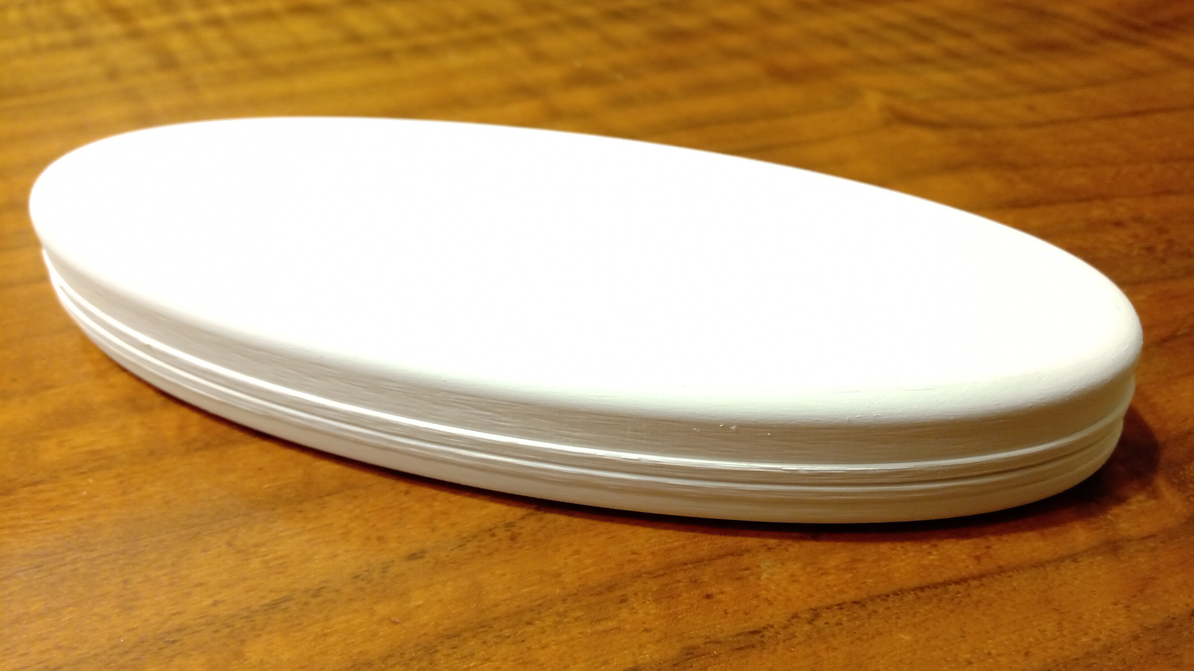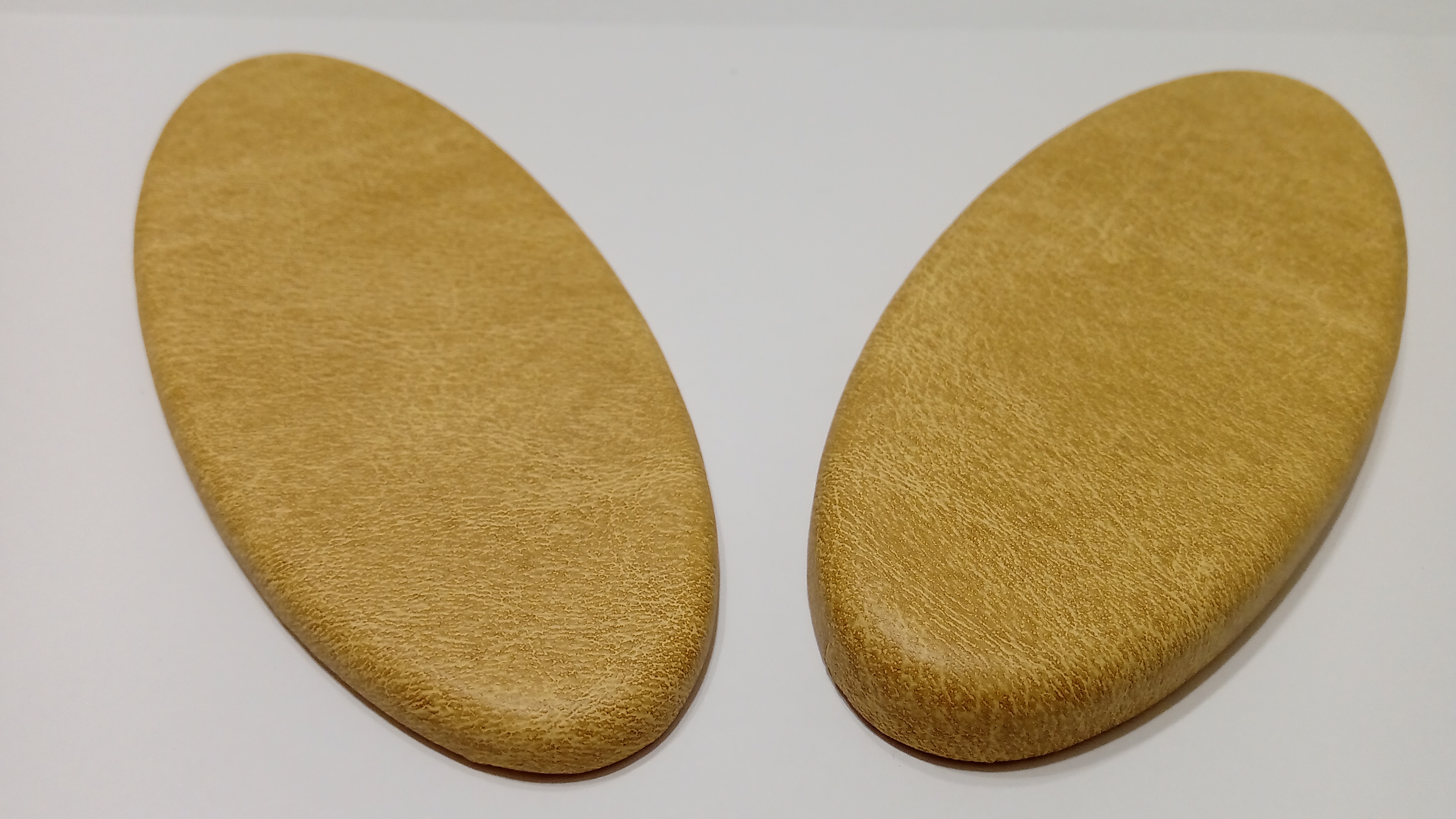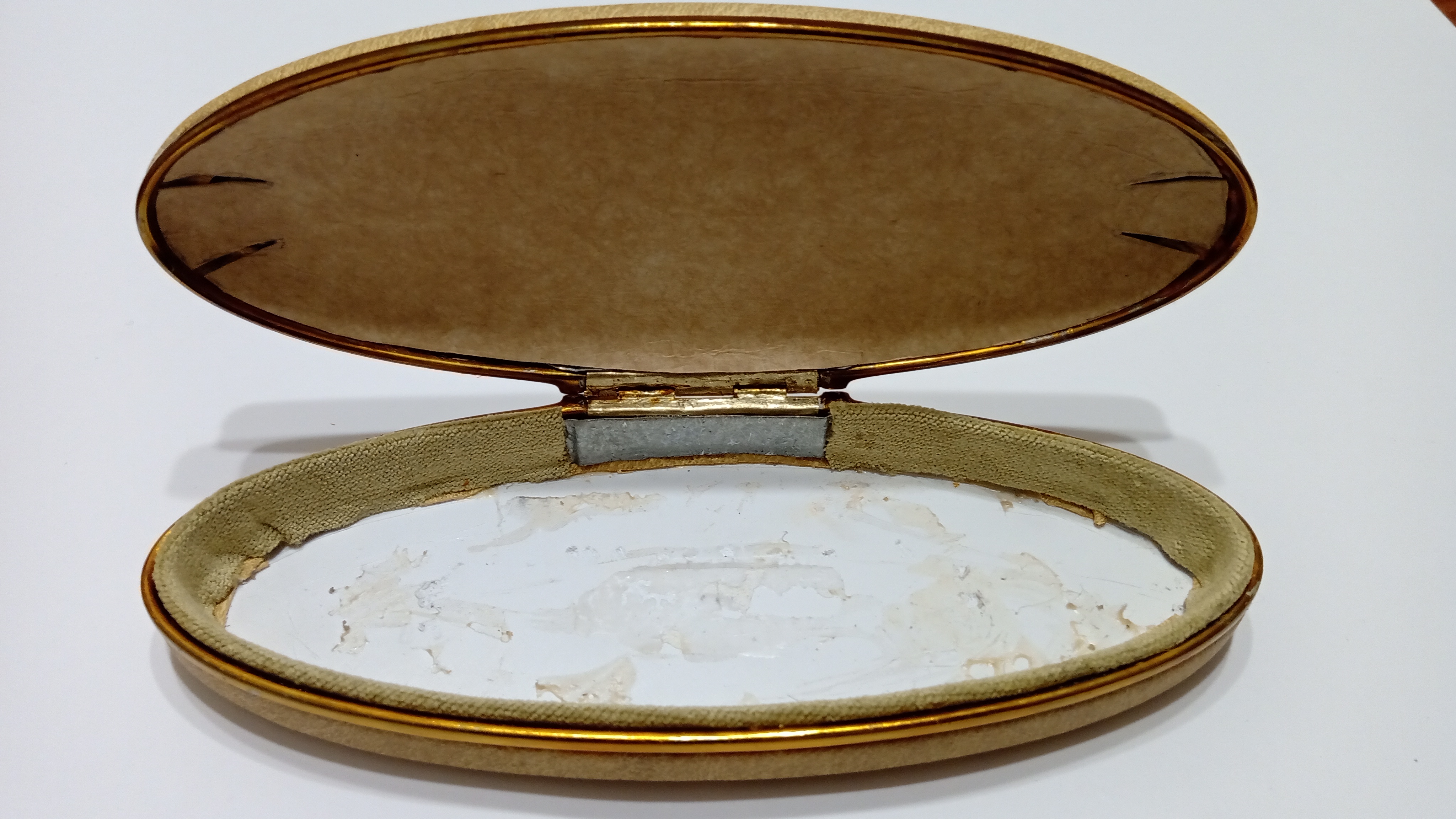 Nel passaggio successivo ho scelto una similpelle o una fodera simile alla fodera originale di uno di quei modelli ovali, che ho incollato con cemento a contatto a base di toluene, con molta pazienza e tendendo il materiale per evitare pieghe, sia sul coperchio che sulla base...