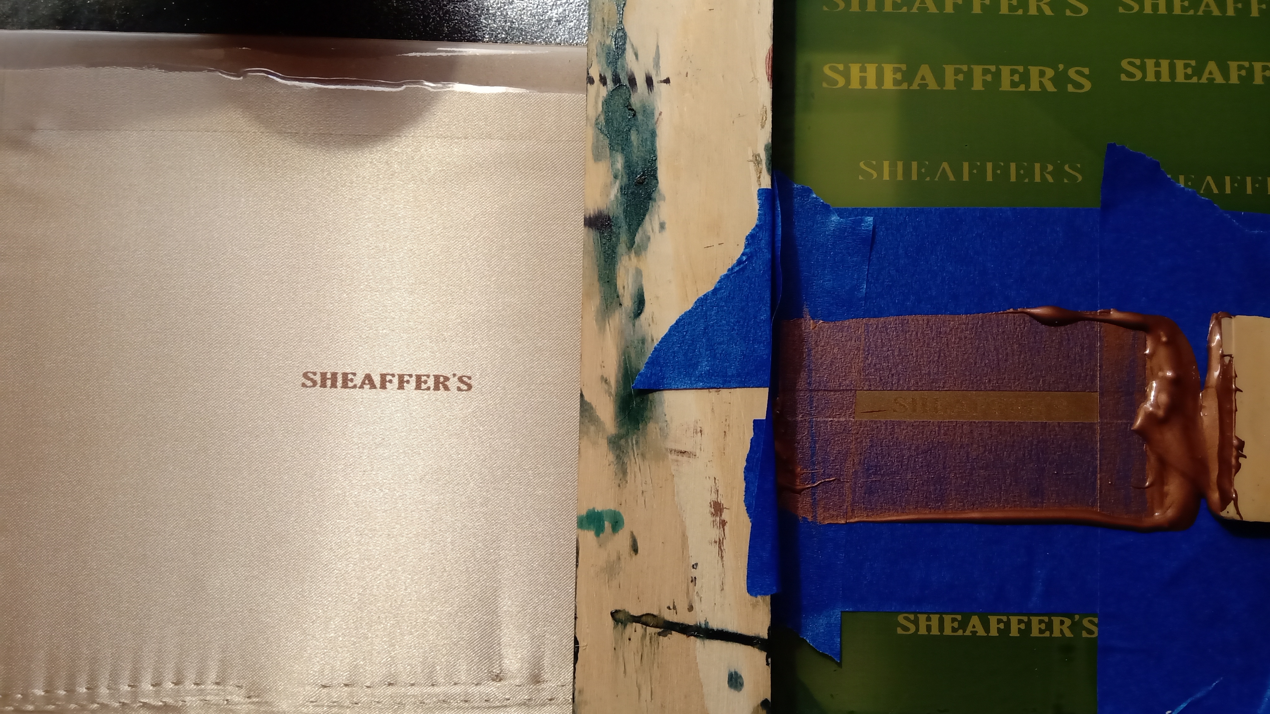 Una volta scelto il tessuto per il supporto della copertina, mi sono dedicato a stampare il logo del brand con inchiostro vinilico color bronzo...