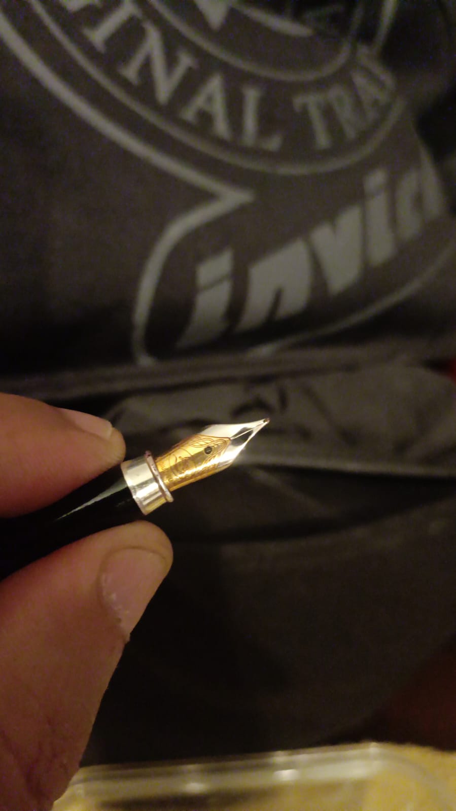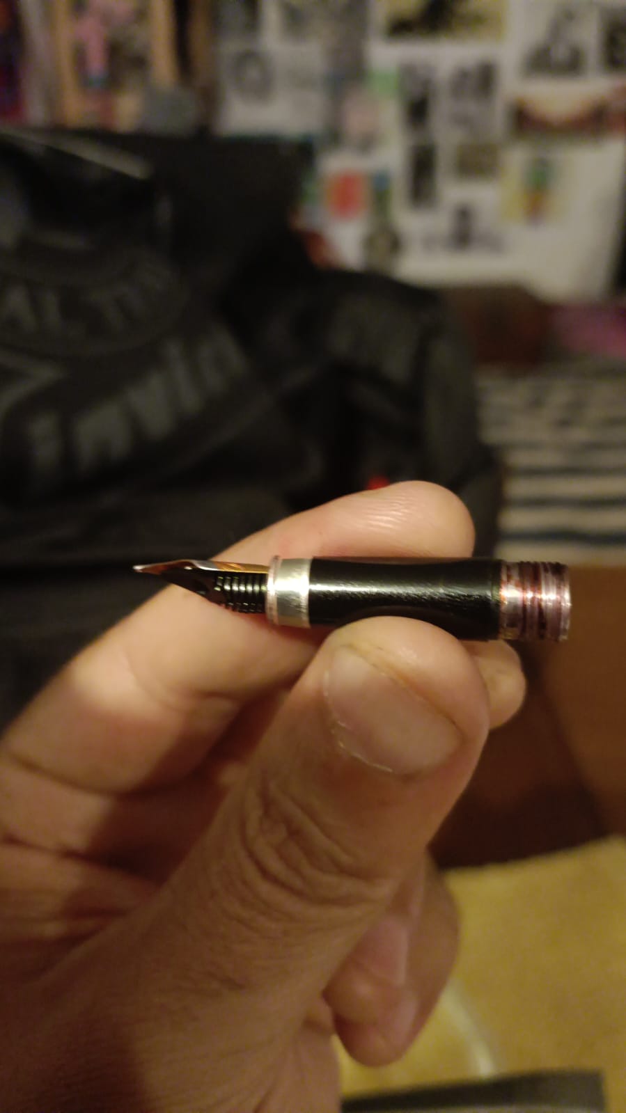 Mi è stata data questa penna marchiata Settelaghi in argento che, in seguito ad una caduta, ha il pennino rovinato. Si è piegato in basso ed il proprietario "a mano" lo ha raddrizzato. La penna scrive ma si vede chiaramente che il pennino non tocca bene l'alimentatore, restando leggermente sollevato verso la punta, quindi vorrei sostituirlo.