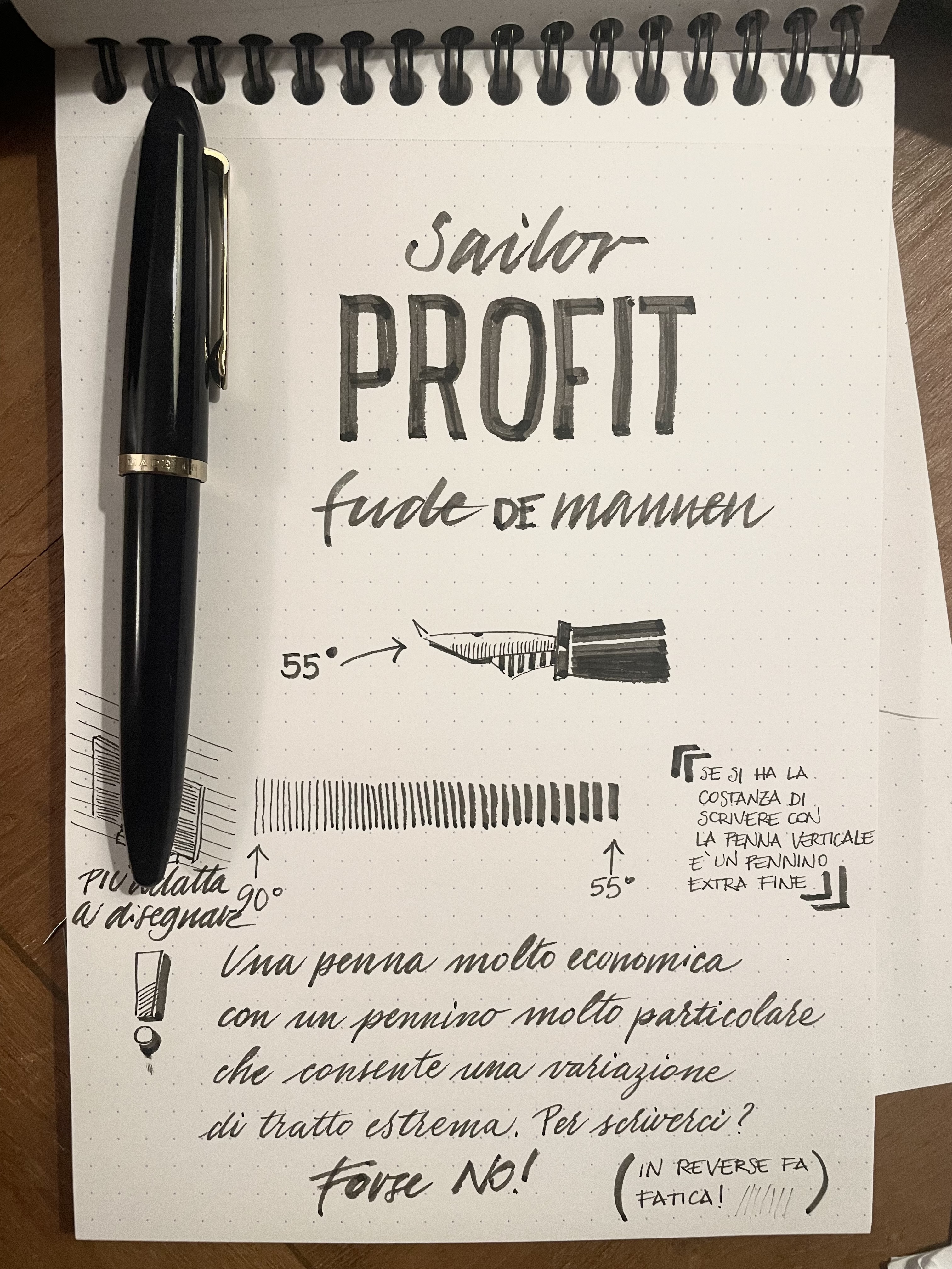 Ho la stessa penna da due anni e la trovo divertentissima. Per me l'alimentatore di questa Sailor economica vale da solo il prezzo della penna: regge tutte le escursioni di tratto che il pennino consente. Se si tiene la penna a 55°, il tratto di 3 mm non ha nessuna incertezza. Ho un Fude della Duke sulla Confucius che non si avvicina minimamente alla comodità e alla qualità di scrittura di questa Profit, mentre il Fude di Leonardo replica egregiamente le stesse prestazioni. Io, purtroppo, ho la mano troppo piccola per un Fude ricavato da un #6 JoWo, per cui se devo scrivere a lungo preferisco il pennino Sailor che è più piccolo e mi permette di gestire comodamente la stessa inclinazione senza stancarmi, anche per sessioni importanti.