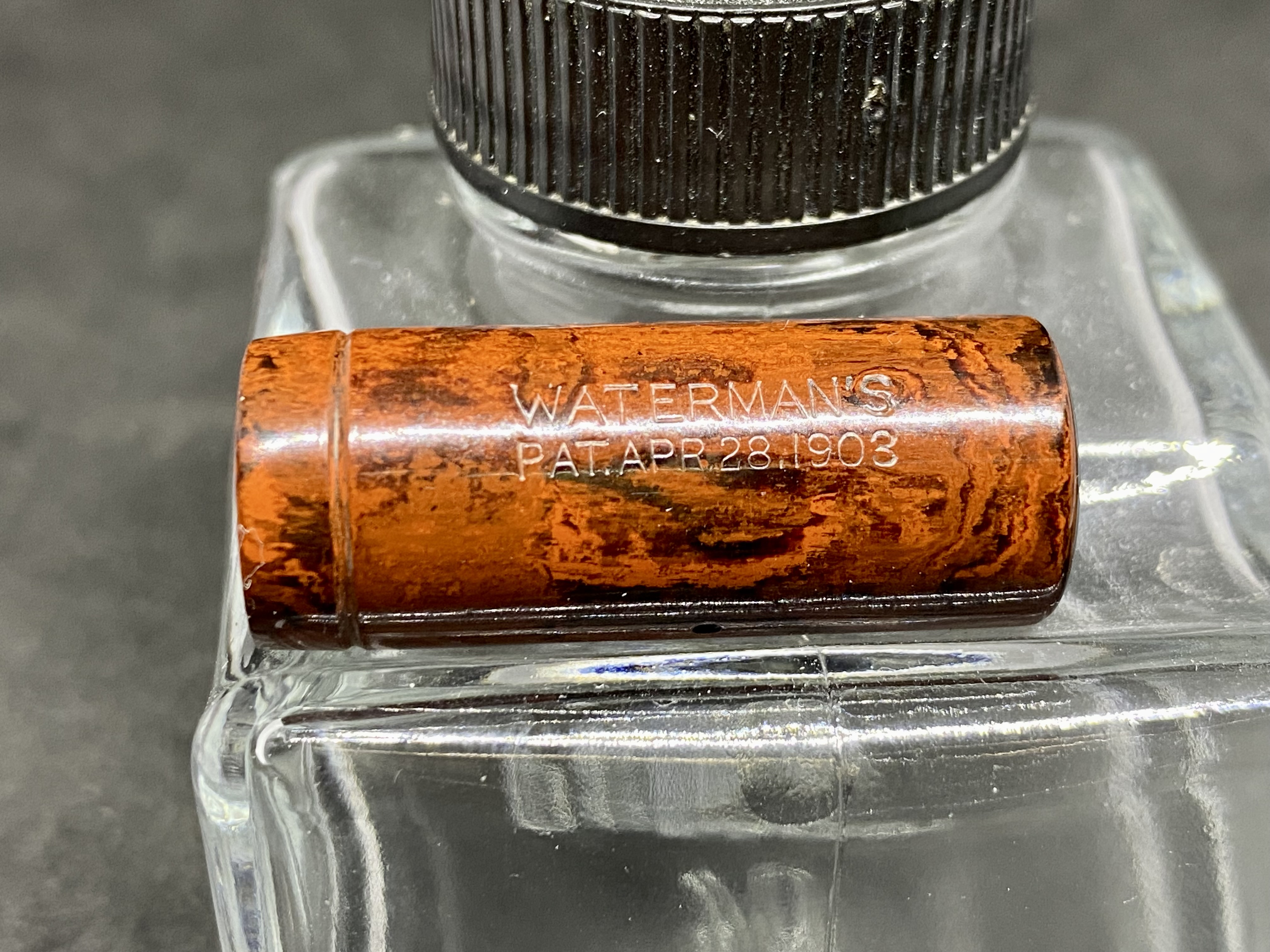Waterman 15S (Safety pen) in ebanite Mottled Red prodotta tra il 1912, anno in cui venne dismesso il nottolino di estrazione filettato, e il 1917, anno in cui si introdusse il nuovo sistema di numerazione.