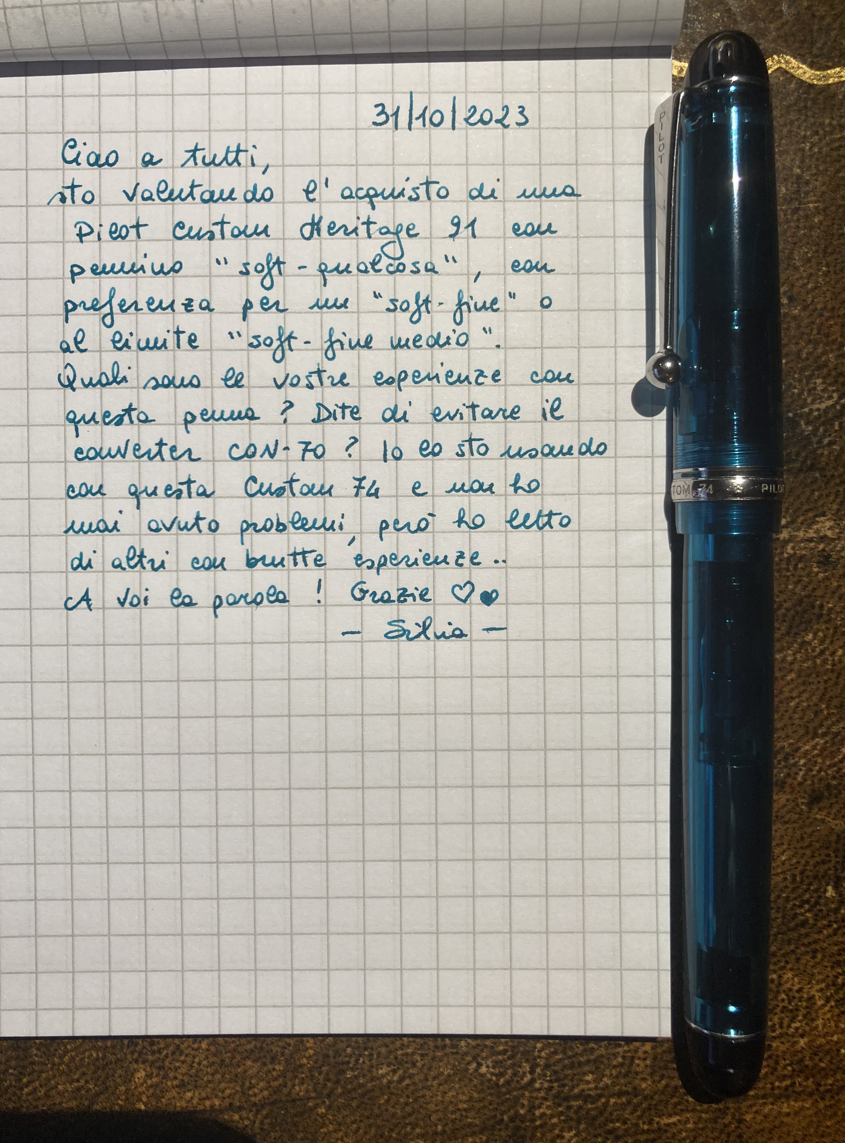 Se hai la mano leggera non varia nulla, devi premere.Silvia1974 ha scritto: ↑martedì 31 ottobre 2023, 21:44 @Risottopensa: Grazie anche a te per gli spunti di riflessione ed i consigli. Tempo fa pensavo di prendere una 912 FA, ma mi sono raffreddata dopo aver letto da più parti che l’alimentatore ideale non è quello in dotazione ed il rischio di ritrovarmi sui binari mi fa passare la voglia. Vista la 91, ho immaginato che il pennino SF o SMF possa stare al F o MF come l’elastic di Leonardo sta sl suo corrispondente non elastic. Li possiedo entrambi e quello più elastico effettivamente è più molleggiato quel tanto che basta per modificare la scrittura rispetto alla versione rigida. Per Pilot non mi aspetterei come dici tu un flessibile ma giusto quel tot di differenza con quello “normale”. Io tra l’altro ho una mano molto leggera: chissà se può essere un limite per ottenere effettivamente un po’ di variazione di tratto, o per controllarla bene..