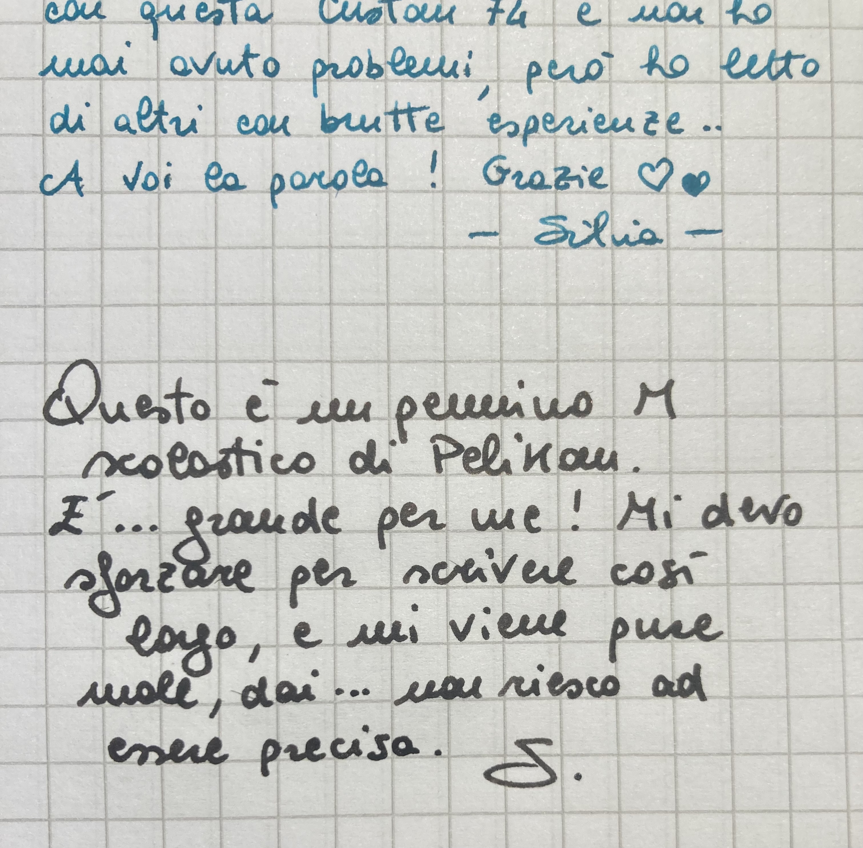 Metto qui una prova di scrittura con un M europeo: già faccio fatica, per questo chiedevo info a chi avesse un Soft fine-medio o Soft fine di Pilot, perché potrebbero essere più abbondanti del previsto (per me!)