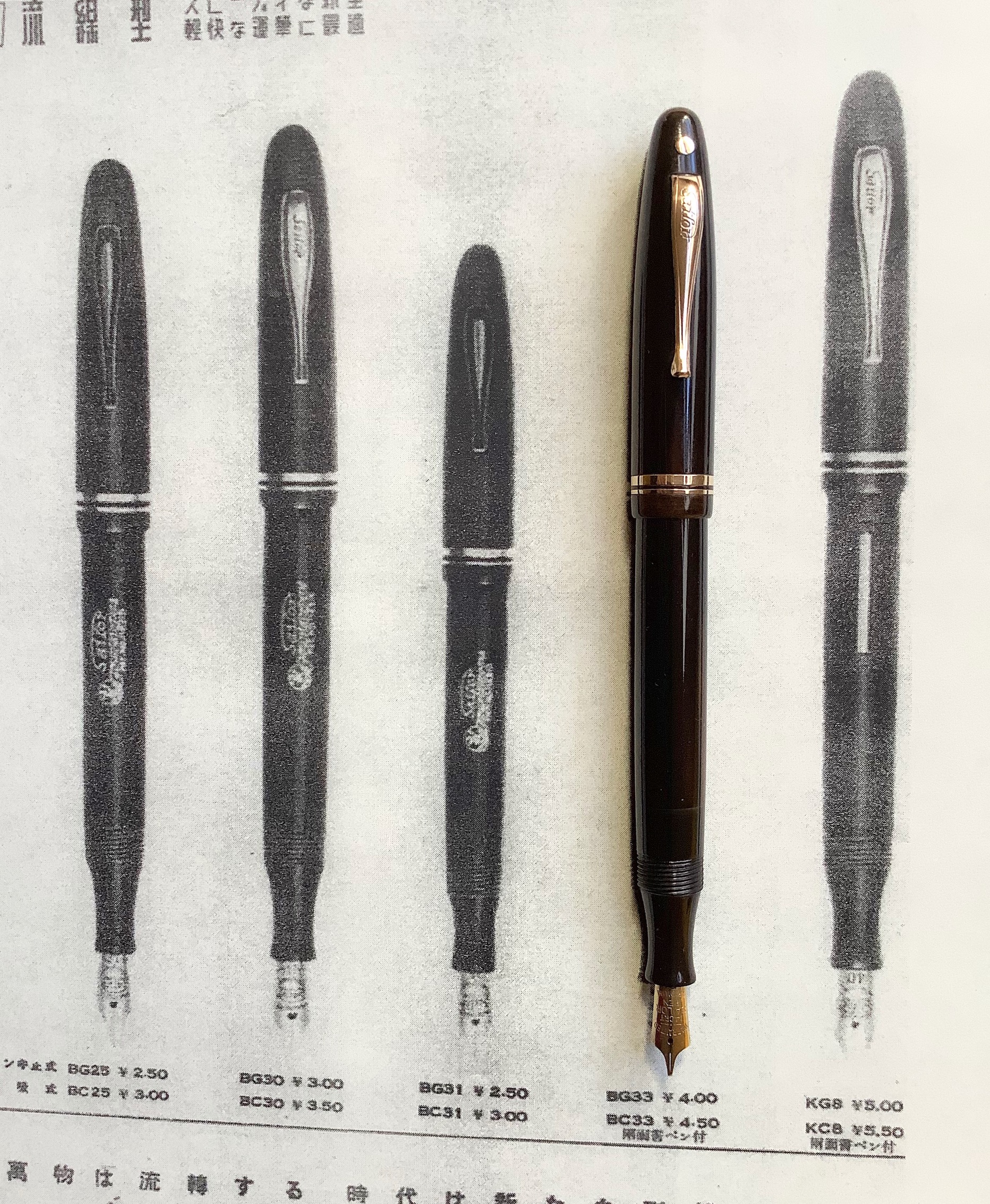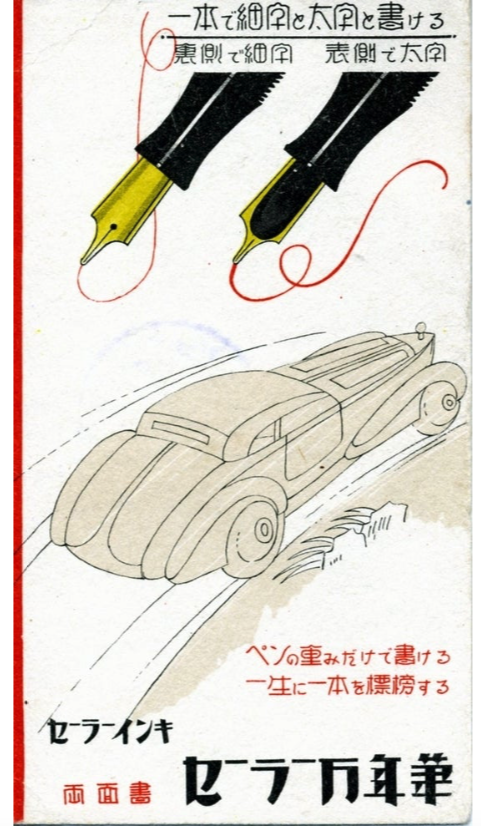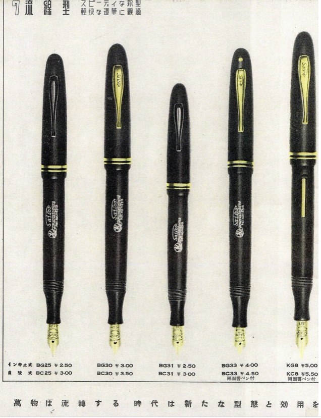 In questa pagina estratta da un catalogo Sailor datato 1935 è possibile osservare stilografiche in stile streamlined , di ispirazione Sheaffer’s Balance.