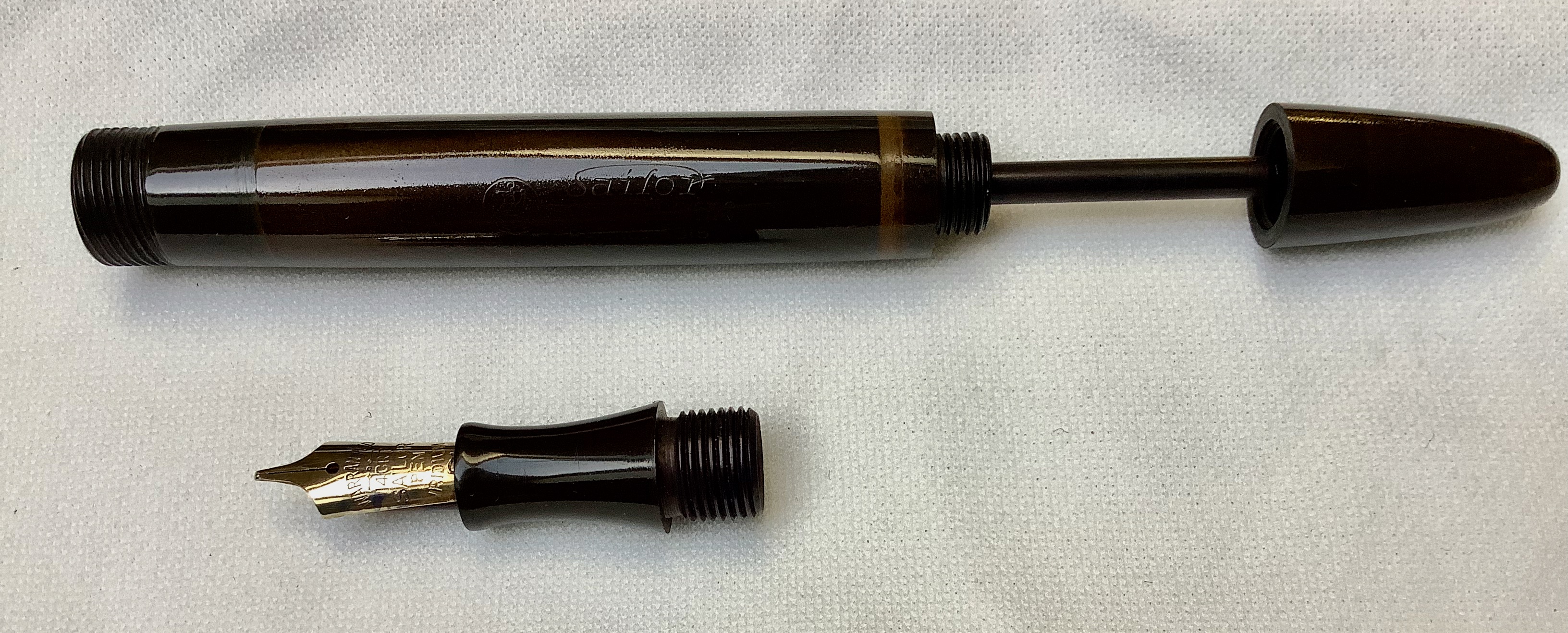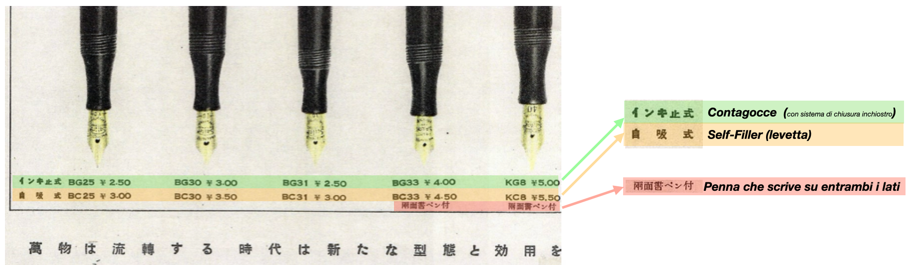 Osservando l’immagine sembrerebbe esserci solo una penna con il caricamento a levetta (l’ultima a destra) , e le altre ? Le altre illustrate sono a carica con contagocce. Quella linea di penne , infatti , era disponibile nelle due versioni : a sacchetto d’inchiostro con levetta oppure di tipo eyedropper a contagocce , con un sistema di arresto del flusso d’inchiostro (in effetti in Giappone le penne eyedropper ebbero una vita relativamente lunga, probabilmente proprio fino alla metà degli anni trenta).