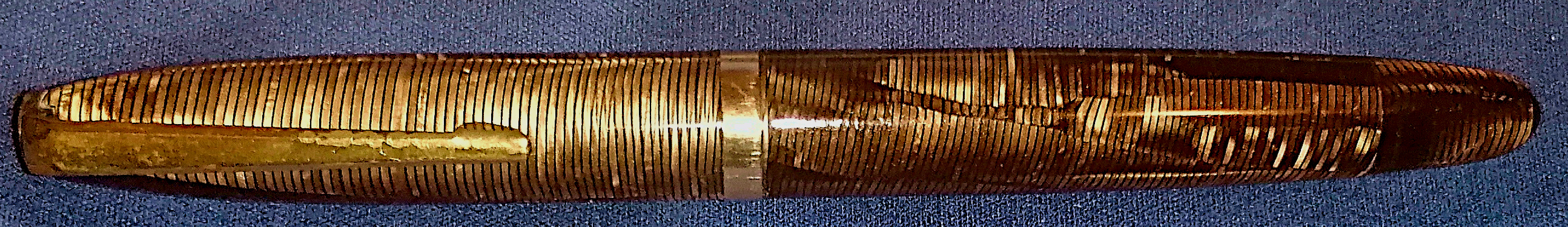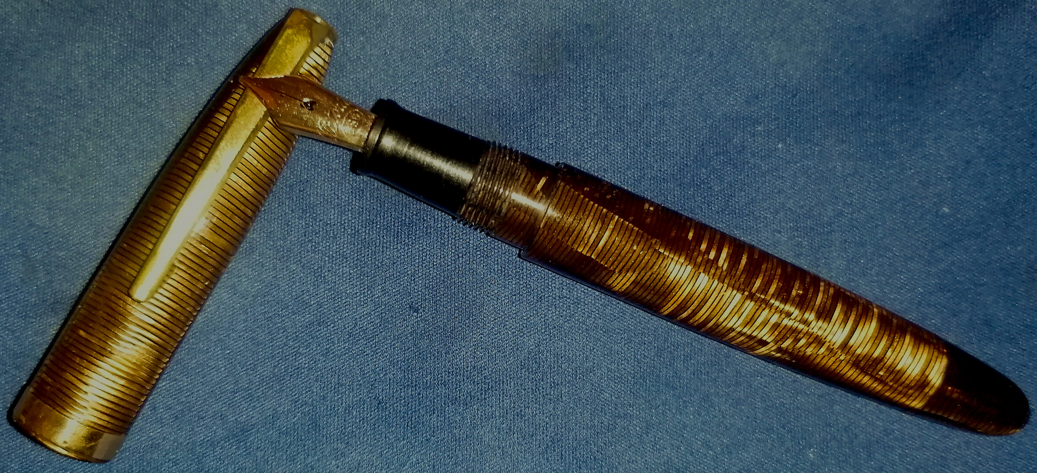 Ciao a tutte/i, usuale acquisto al mercatino domenicale. Attratto dalla celluloide oro-marrone anellata, ho acquistato questa penna che monta un bel pennino oro 14 k marca "Victoria" a me sconosciuto. Sul wiki si parla solo di penne come "Victoria Safety Fountain Pen".
