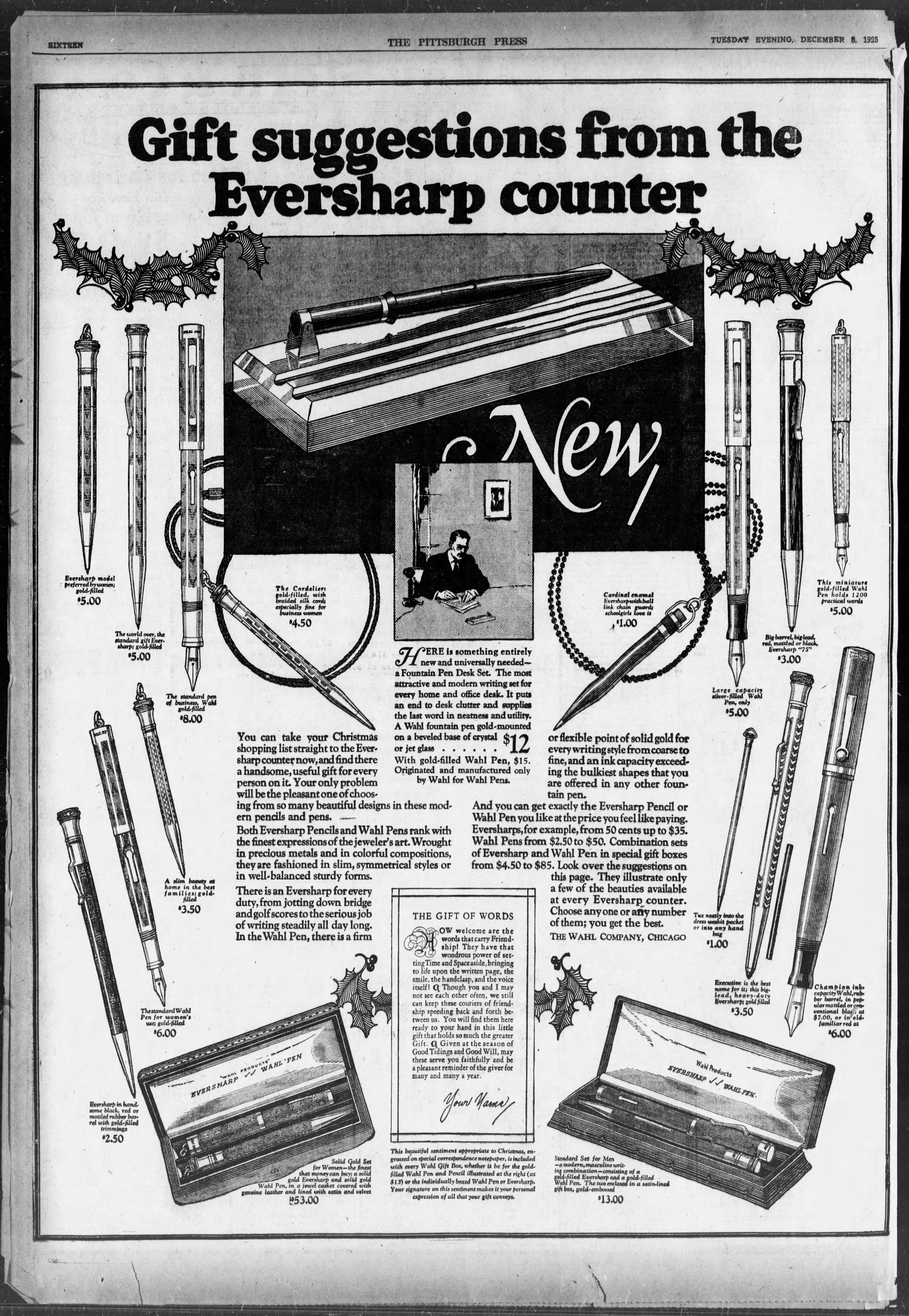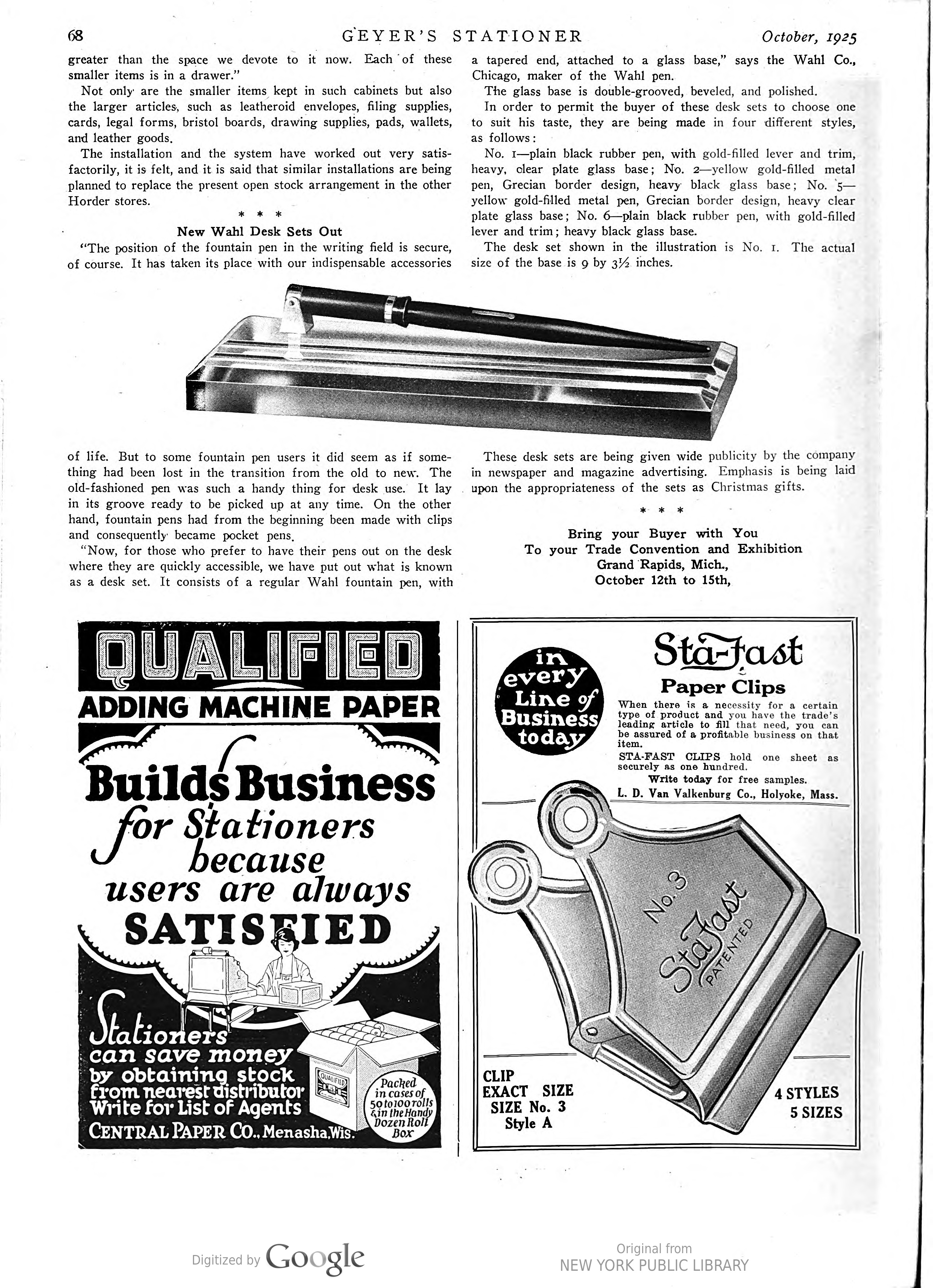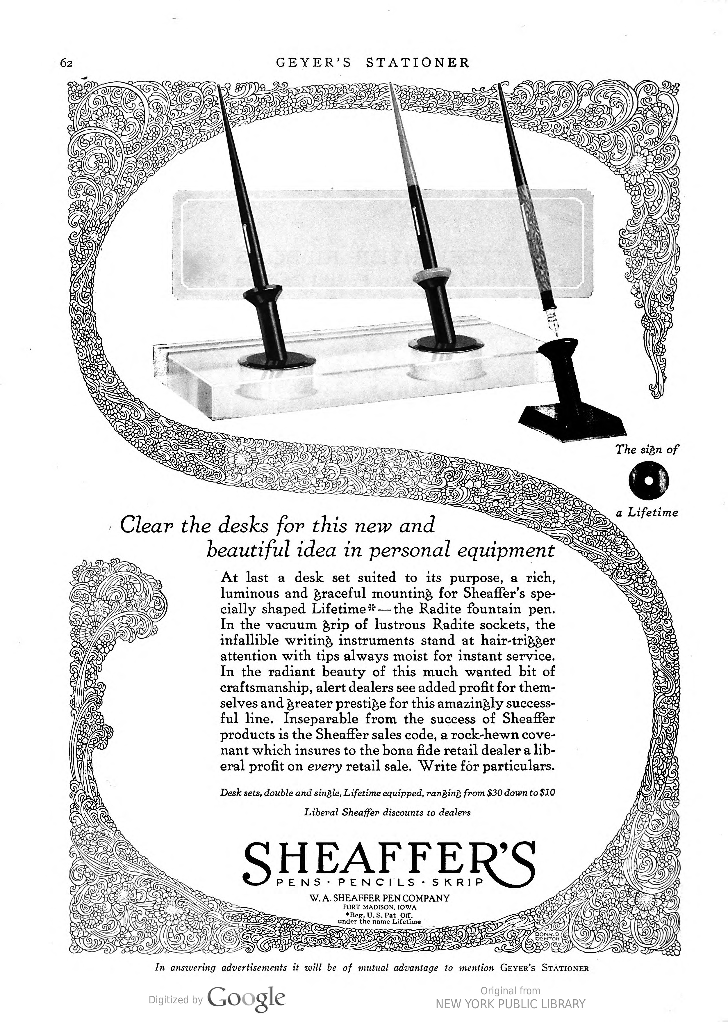 La Wahl-Eversharp era stata pioniera tra le Big Four nella produzione dei nuovissimi set da scrivania, con un prodotto già disponibile alla fine del 1925, uscito in contemporanea con la proposta di stiloforo della Sheaffer che però, a mio giudizio, risulta inferiore sia stilisticamente (nel confronto tra i top di gamma) che tecnicamente (non essendo orientabile). Sheaffer’s Desk Set - 1925.10. Geyer’s Stationer (fonte visibile direttamente)