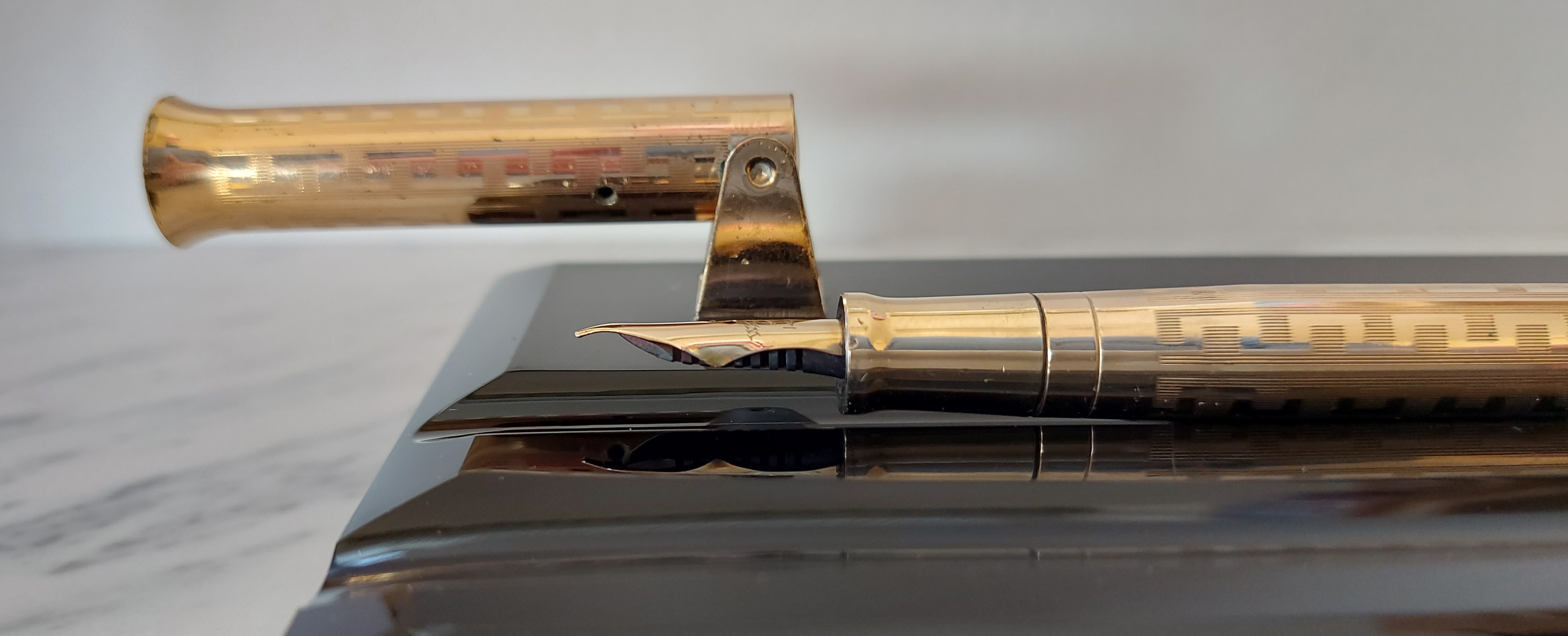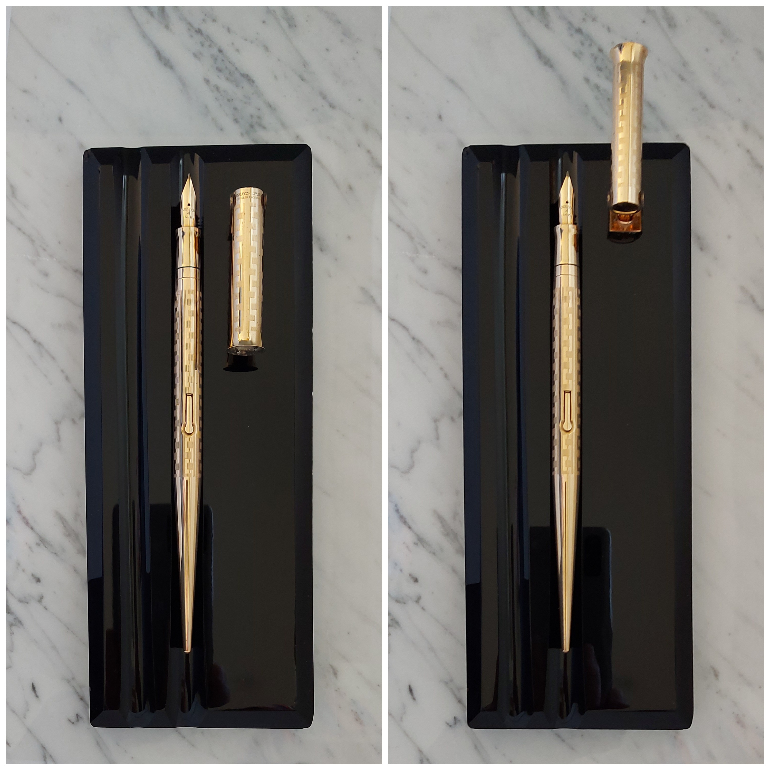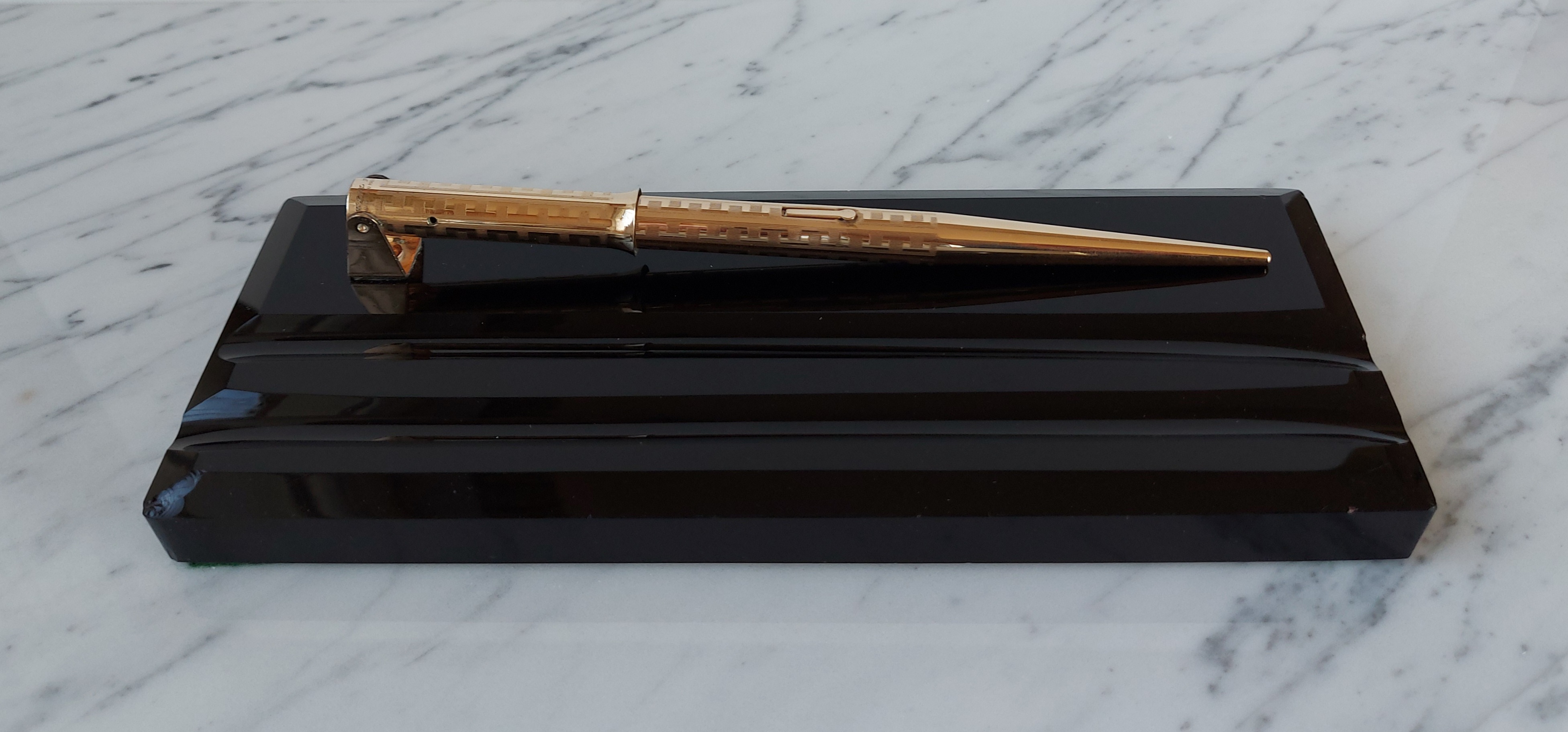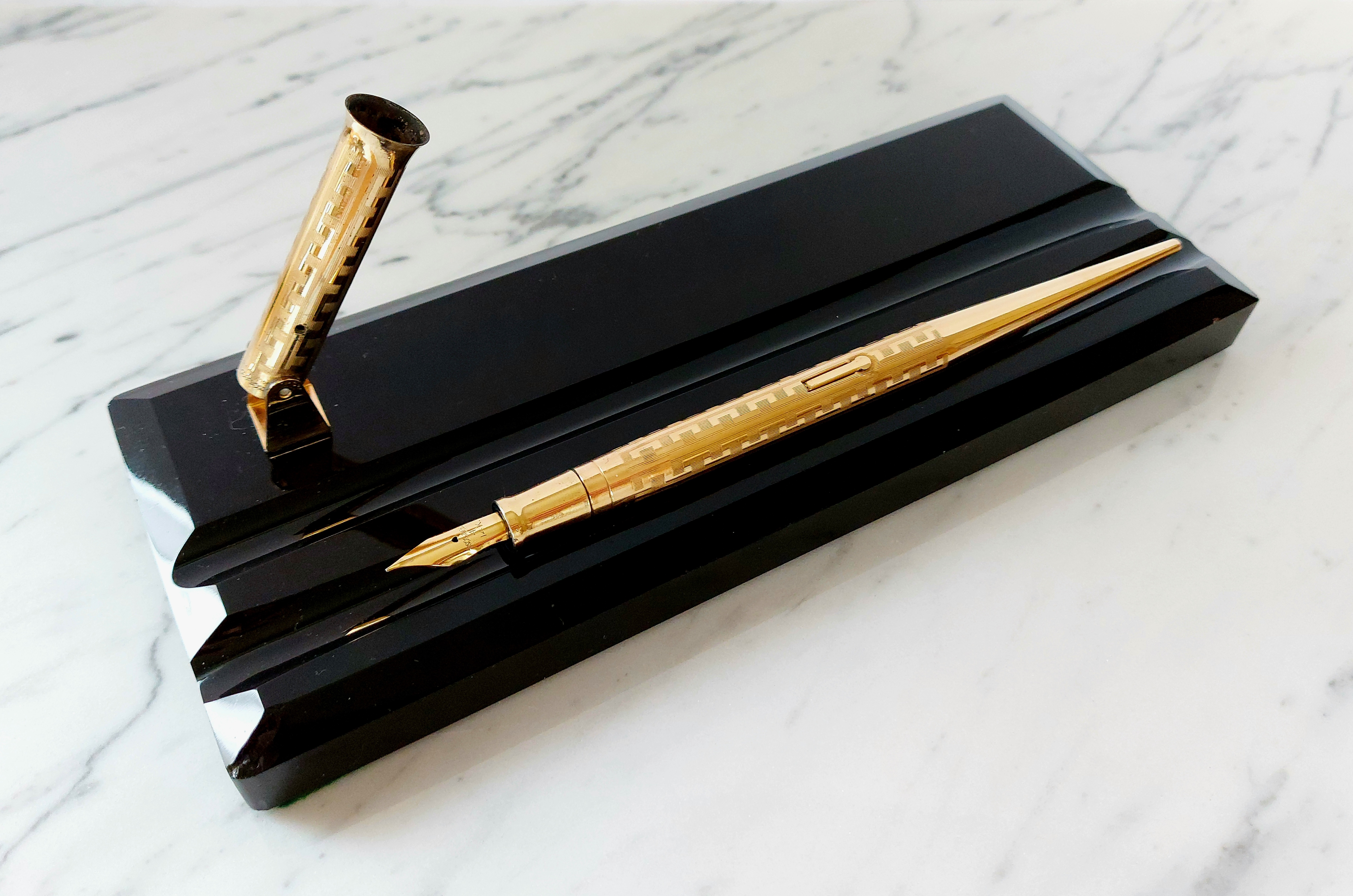 Pesante base in vetro nero, con due scanalature, smussata e lucidata, equipaggiata con un calice avvitato ed una stilografica tutti in metallo (all metal) laminati in oro giallo con decoro “Grecian Border”; stilografica con terminale rastremato (coda-le) in unico pezzo, corretto pennino WAHL #4 [F] Falcon in oro 14 carati con alimentatore “a pettine” in ebanite, caricamento a levetta, produzione U.S.A. anno 1925.