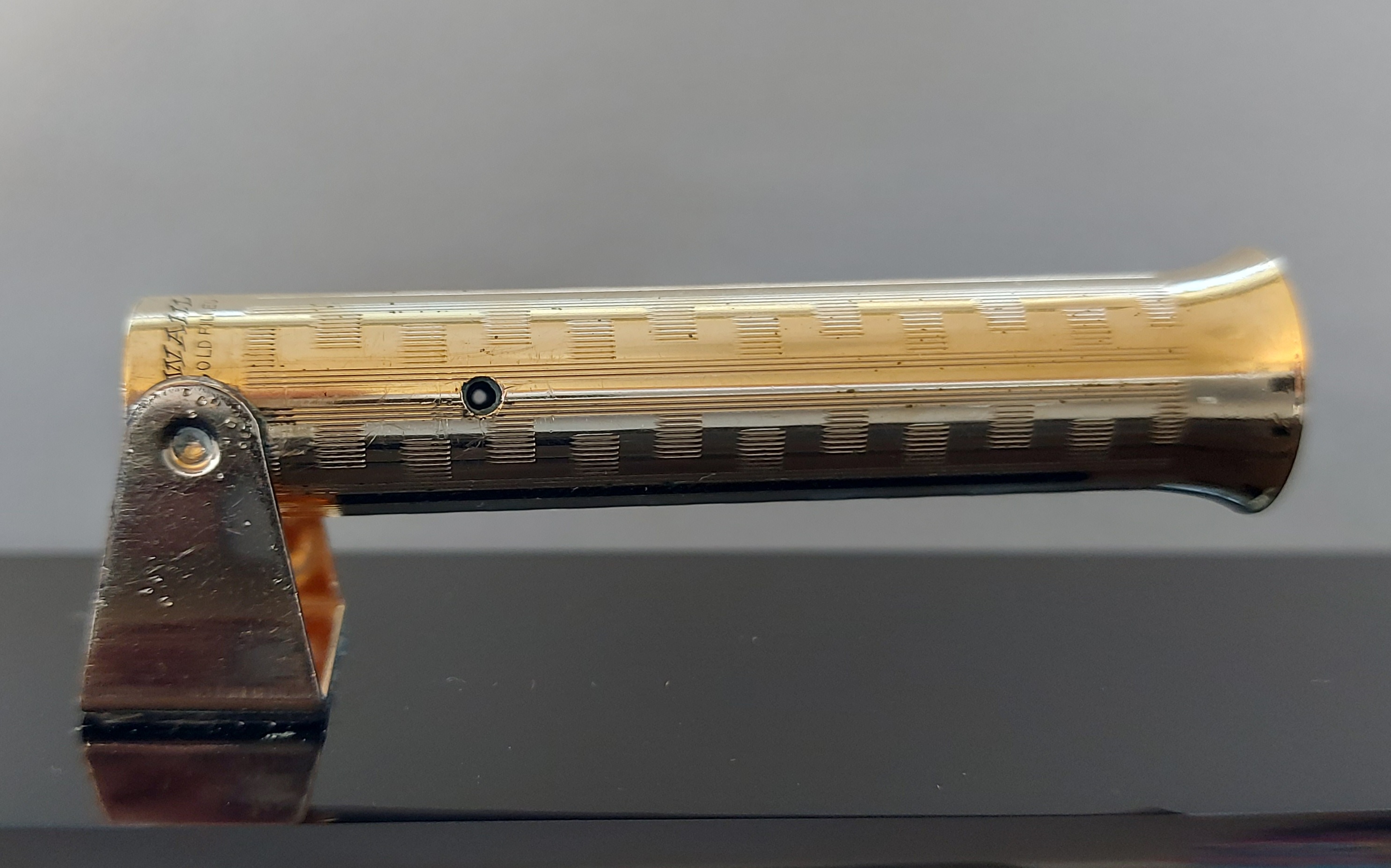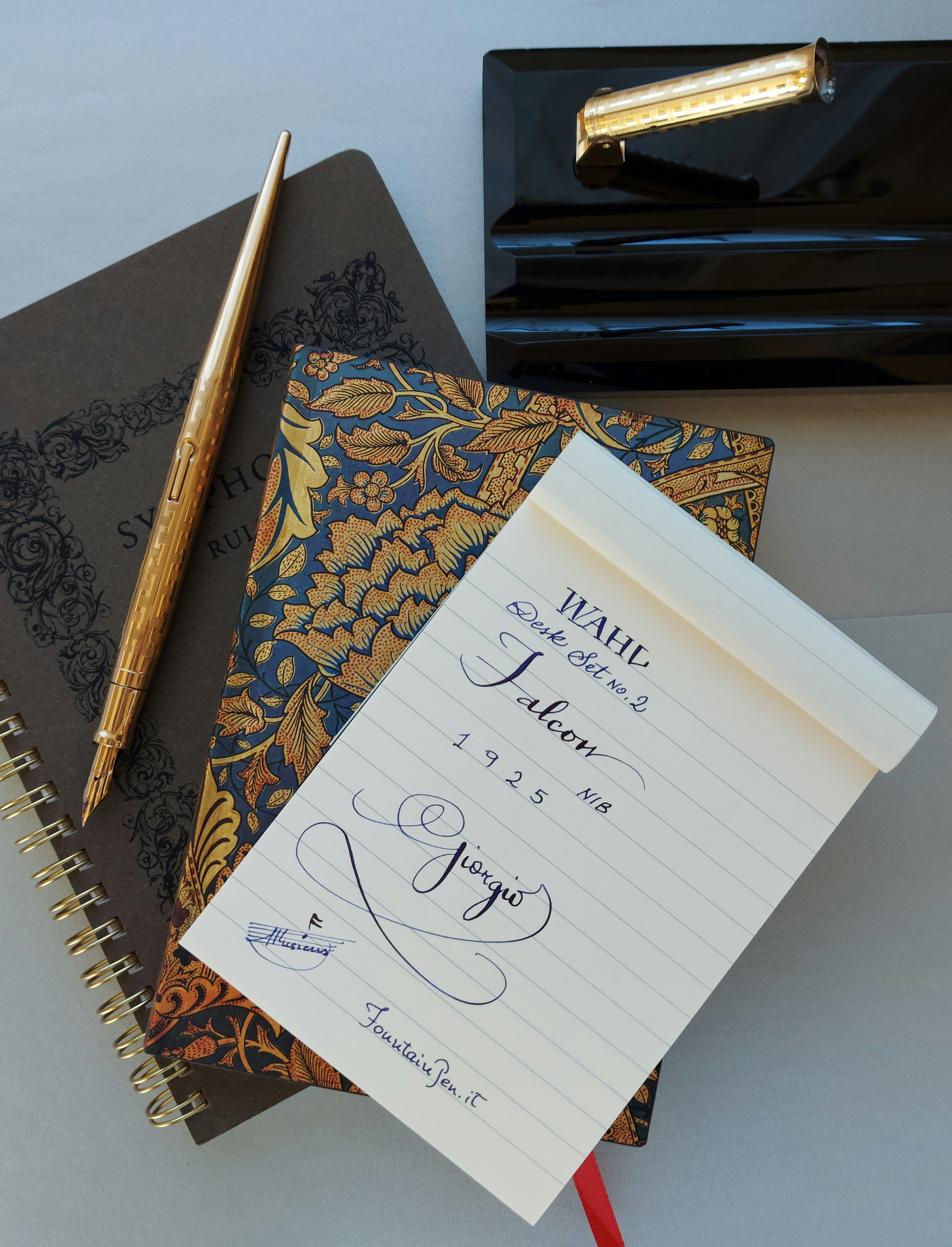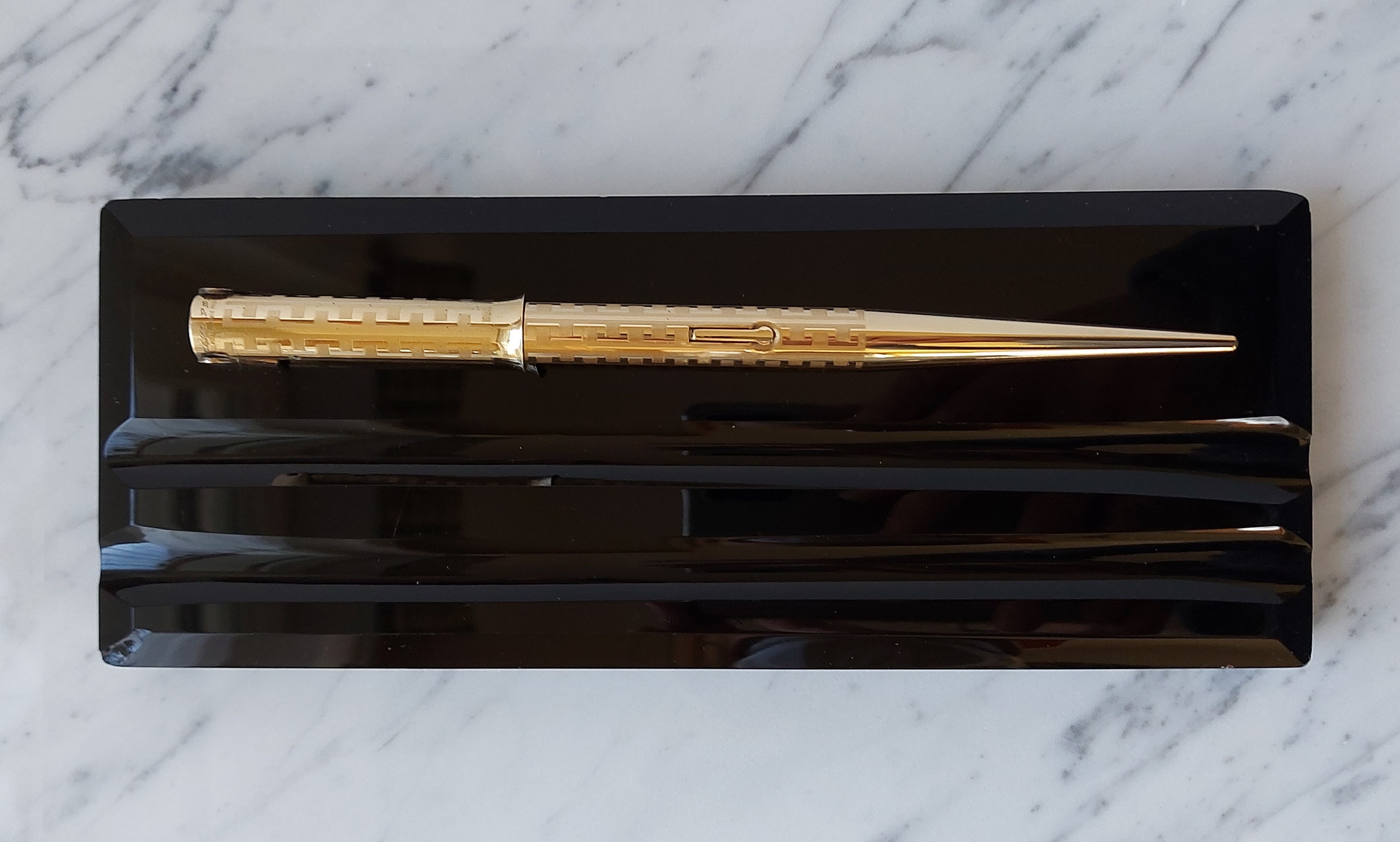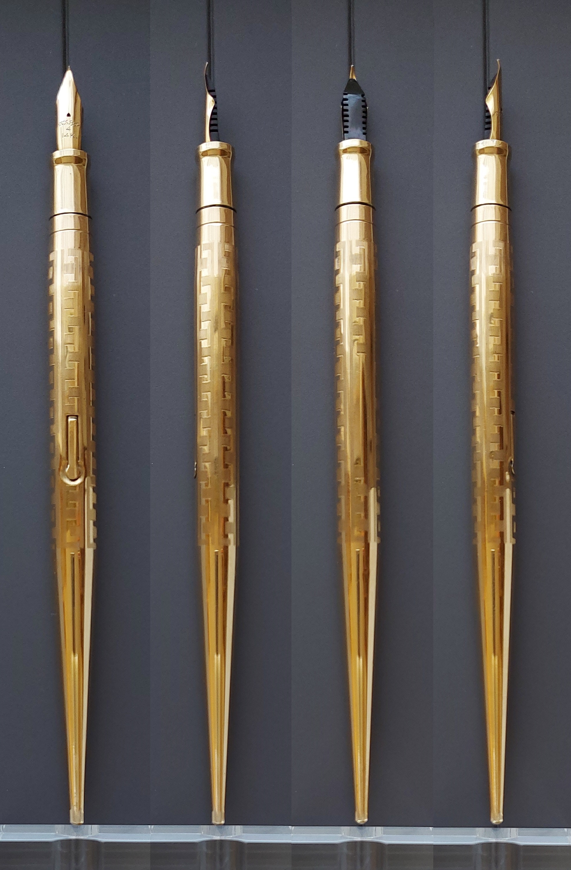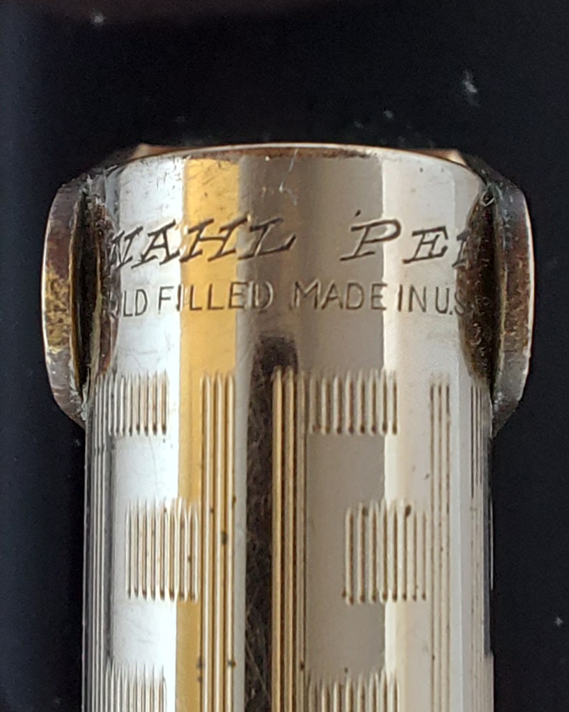 Pesante base in vetro nero, con due scanalature, smussata e lucidata, equipaggiata con un calice avvitato ed una stilografica tutti in metallo (all metal) laminati in oro giallo con decoro “Grecian Border”; stilografica con terminale rastremato (coda-le) in unico pezzo, corretto pennino WAHL #4 [F] Falcon in oro 14 carati con alimentatore “a pettine” in ebanite, caricamento a levetta, produzione U.S.A. anno 1925.