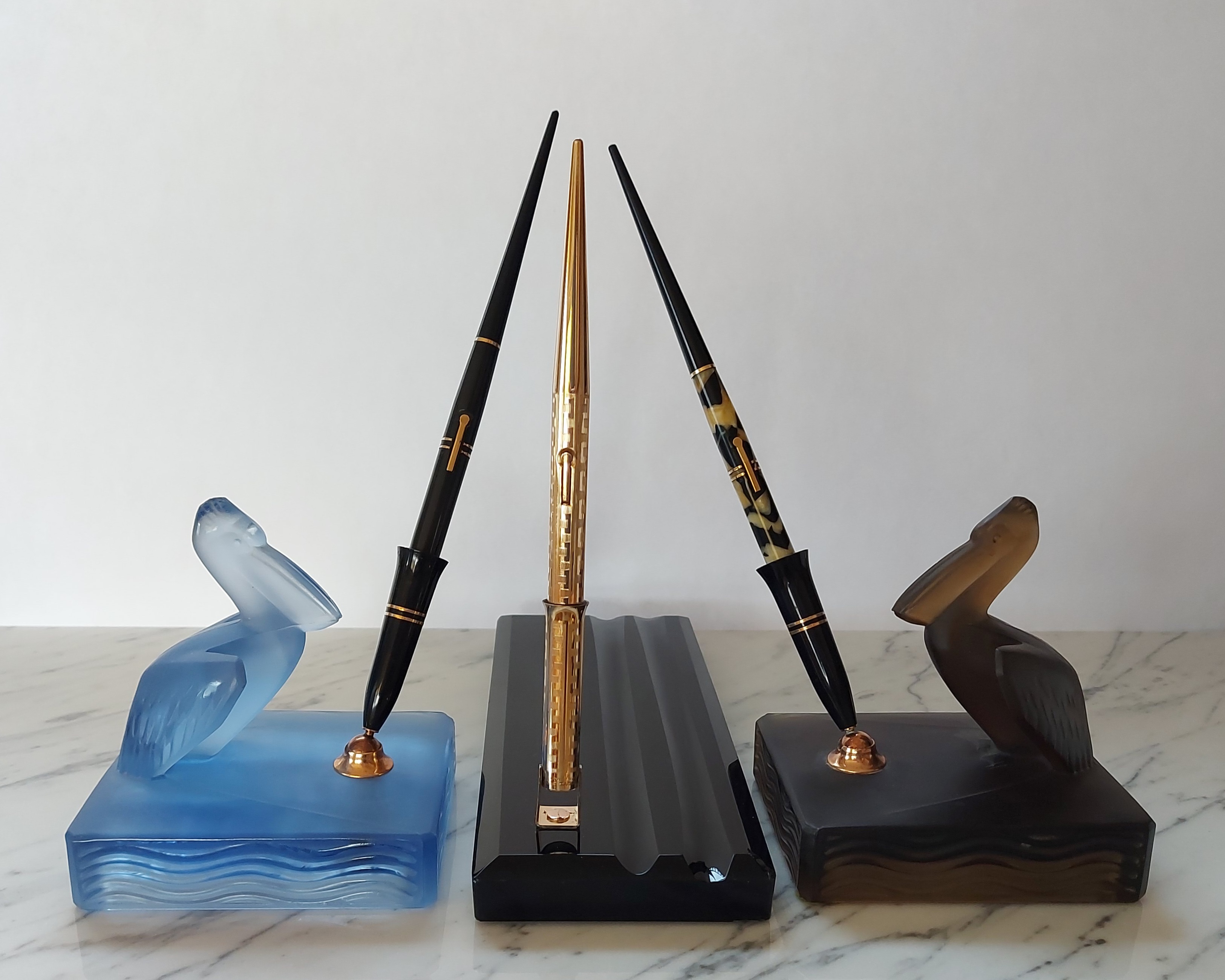 • tecnicamente rispondeva anche all’esigenza di orientare facilmente il gruppo calice/penna in ogni direzione sfruttando il principio della leva, evitando nel contempo di causare danni quando la penna veniva urtata accidentalmente in quanto, per lo stesso principio, la coda si sarebbe spostata senza causare il movimento solidale dell’intera base dello stiloforo; la possibilità (pubblicizzata) di chiudere il tutto sotto chiave in un basso cassetto a fine giornata va appena menzionata…