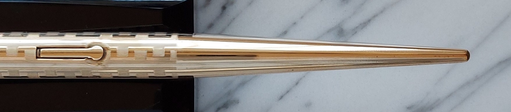 Il primo passo dei designer fu perciò quello di semplificare il più possibile la struttura, mettendo in primo piano la vera novità che veniva posta in vendita, che era l’autosufficienza della penna stilografica (grazie al serbatoio di inchiostro incorporato), penna che a riposo sarebbe rimasta sempre in piena e bella vista sulla scrivania, magari mostrando lo scintillante rivestimento dell’oro che ricopriva l’intero strumento (come nello splendido “prototipo” in presentazione).