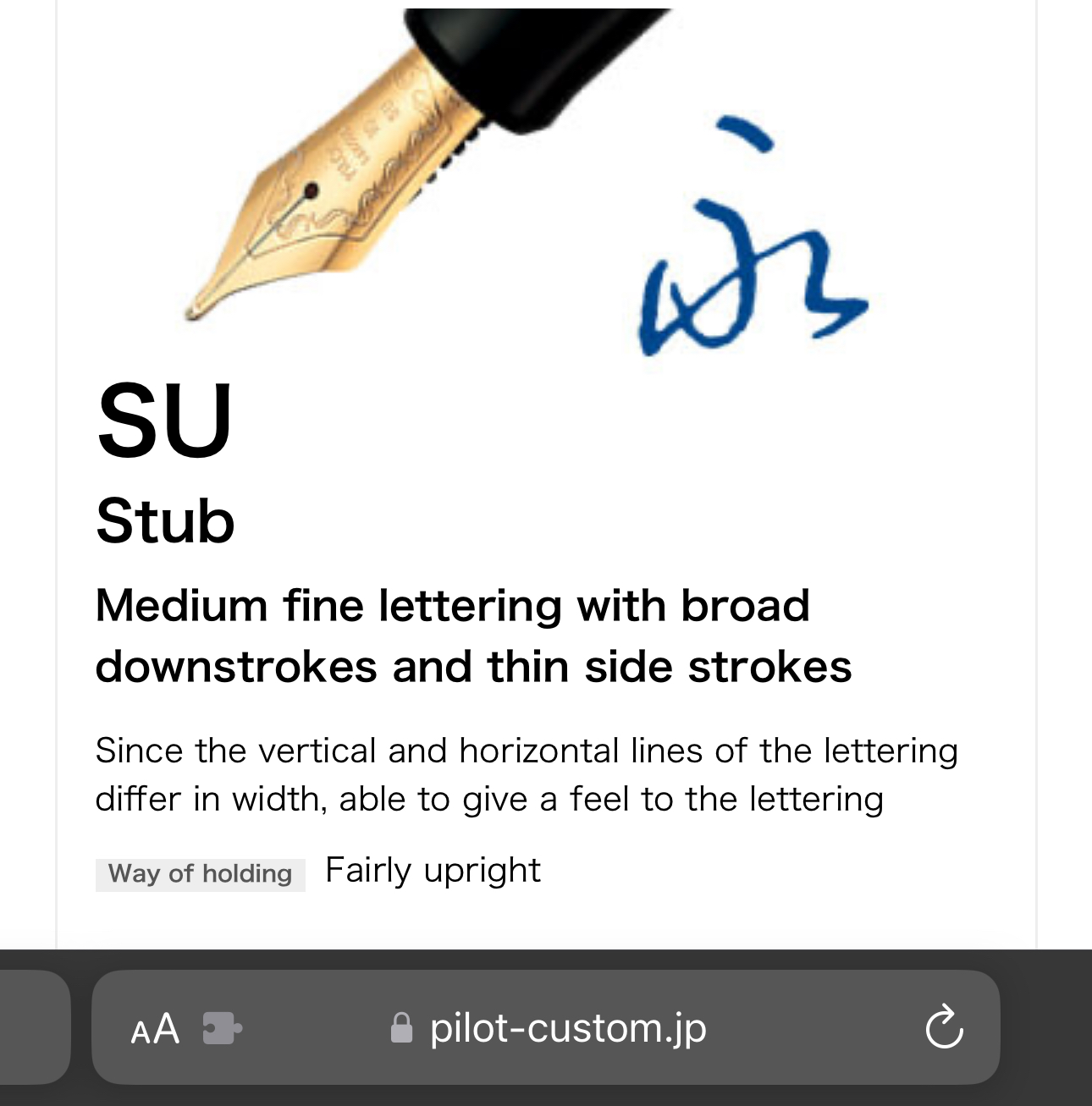 Il sito giapponese di Pilot dedicato alla serie Custom mostra la varietà dei pennini e come utilizzarli. Per i “tronchi” (quindi Stub e Music) la penna andrebbe tenuta quasi verticale (fairly upright) sul foglio.