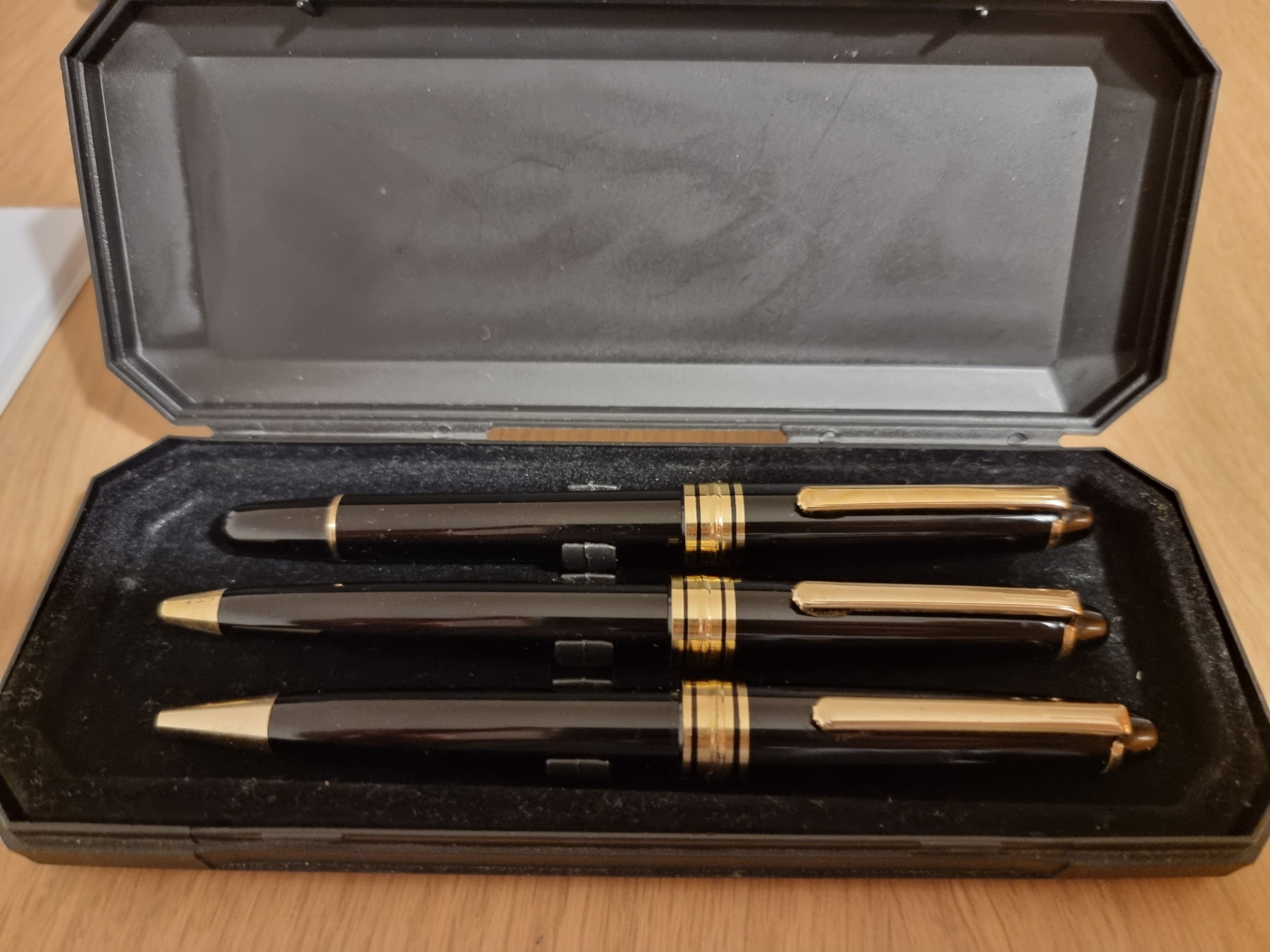 penna con buona probabilità cinese, ispirata alla Montblanc, con chiusura a scatto, ne ho un set simile, stilo + biro, che era di mio suocero e che mi ha regalato con ancora il cartellino del prezzo attaccato ( 5 euro...). Se non ricordo male anche la scatola era uguale, a forma di catafalco...