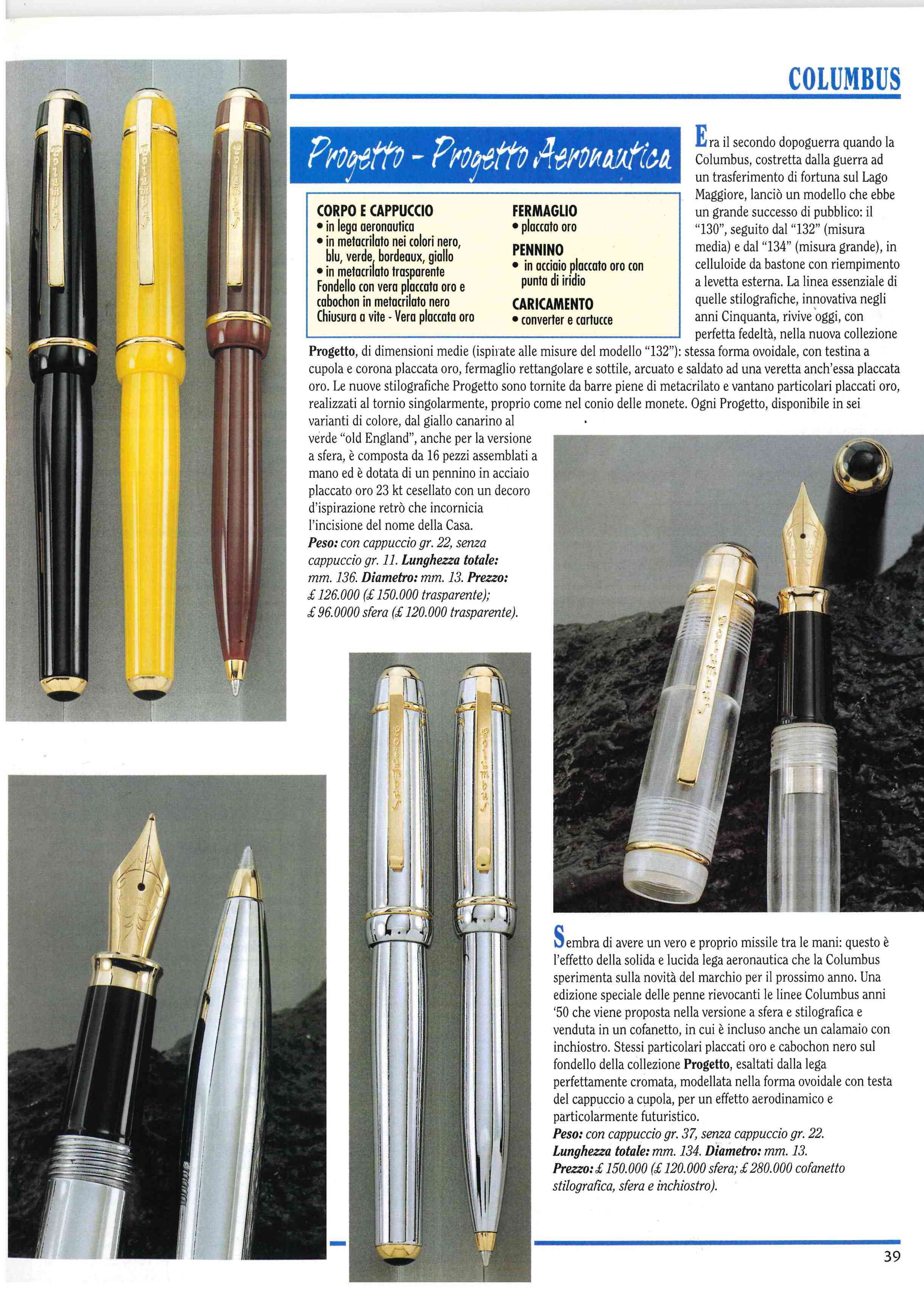 La Columbus produsse, tra il 1992 e il 1998, la linea "Accademia" (questa mostrata dall'opener) e la linea "Progetto"; quest'ultima prodotta in plastica (OK, Metacrilato....) e in lega metallica per il set biro/stilografica.